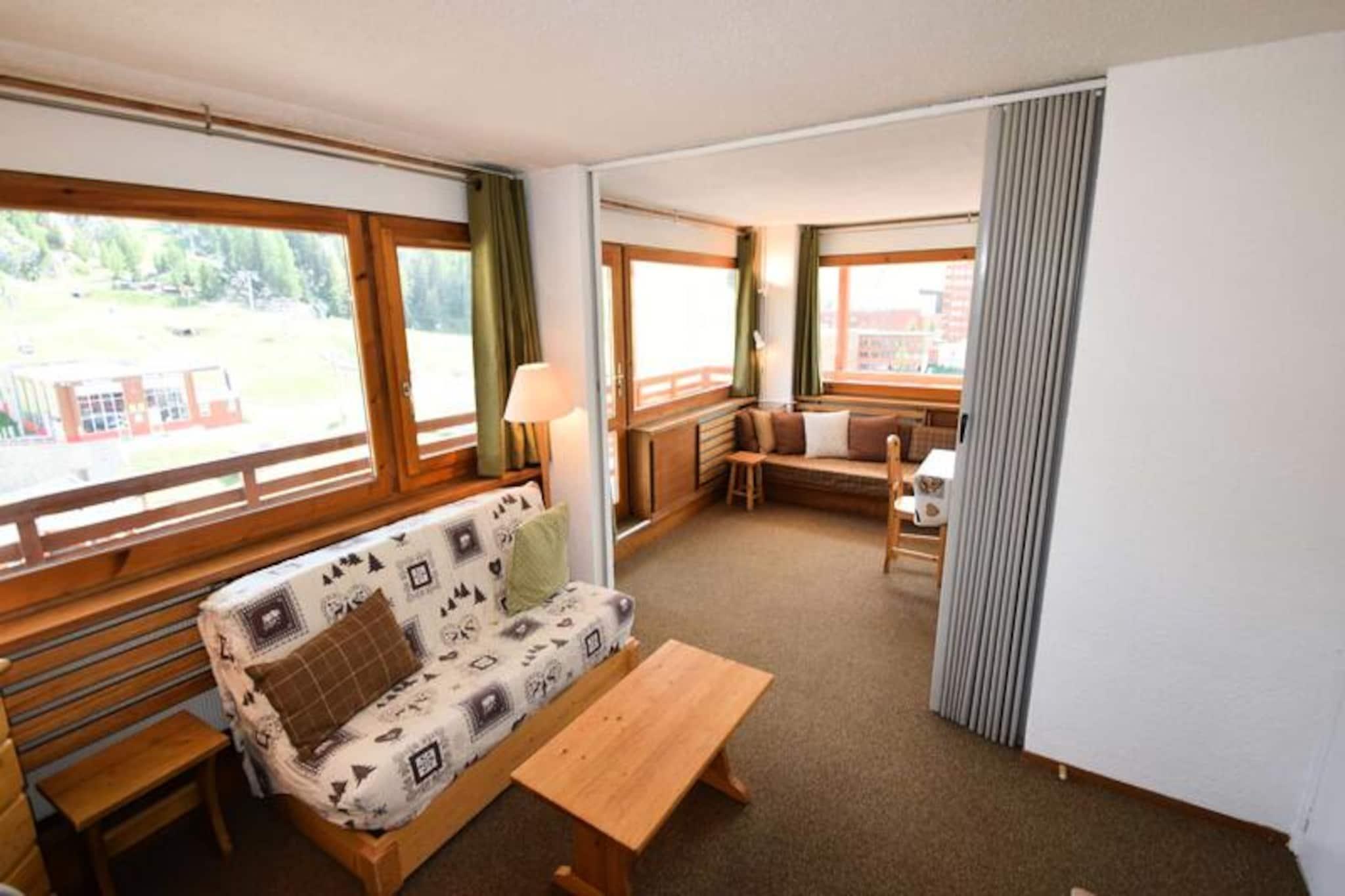 High above the bustling heart of Plagne Centre, this charming apartment offers a front-row seat to the alpine slopes, with breathtaking views from its southwest-facing balcony. Imagine waking up to the crisp mountain air and the sight of skiers carving their way down the pristine runs, all from the comfort of your own private retreat. Positioned on the 9th floor (accessible via elevator), this residence combines convenience with the serenity of elevated living, making it the perfect base for your next adventure in the French Alps. \n\nInside, the apartment is thoughtfully designed to accommodate up to six guests, offering a cozy yet functional layout. The living room features a comfortable double sofa bed and a TV, while the divisible dining area includes an additional single sofa bed. The bedroom is equipped with two single bunk beds and a single bed, ensuring flexible sleeping arrangements for families or groups. A fully equipped kitchen with ceramic hobs, an oven, refrigerator, and dishwasher makes meal preparation a breeze, while the bathroom with a bathtub and separate WC adds to the comfort. The combination of carpeted and tiled flooring creates a warm and inviting atmosphere, perfect for unwinding after a day on the slopes. \n\nSituated at the foot of the slopes, the residence offers direct access to the ski lifts and a convenient shopping arcade, putting everything you need right at your fingertips. Whether you’re picking up ski passes, grabbing a quick bite, or exploring the vibrant resort atmosphere, you’ll find it all just steps away. The ski locker ensures hassle-free storage, making your transition from apartment to piste seamless. \n\nThis apartment is more than just a place to stay; it’s a gateway to unforgettable alpine experiences. Whether you’re here to ski, hike, or simply soak in the stunning views, La Meije in Plagne Centre promises a holiday filled with comfort, adventure, and memories to last a lifetime.