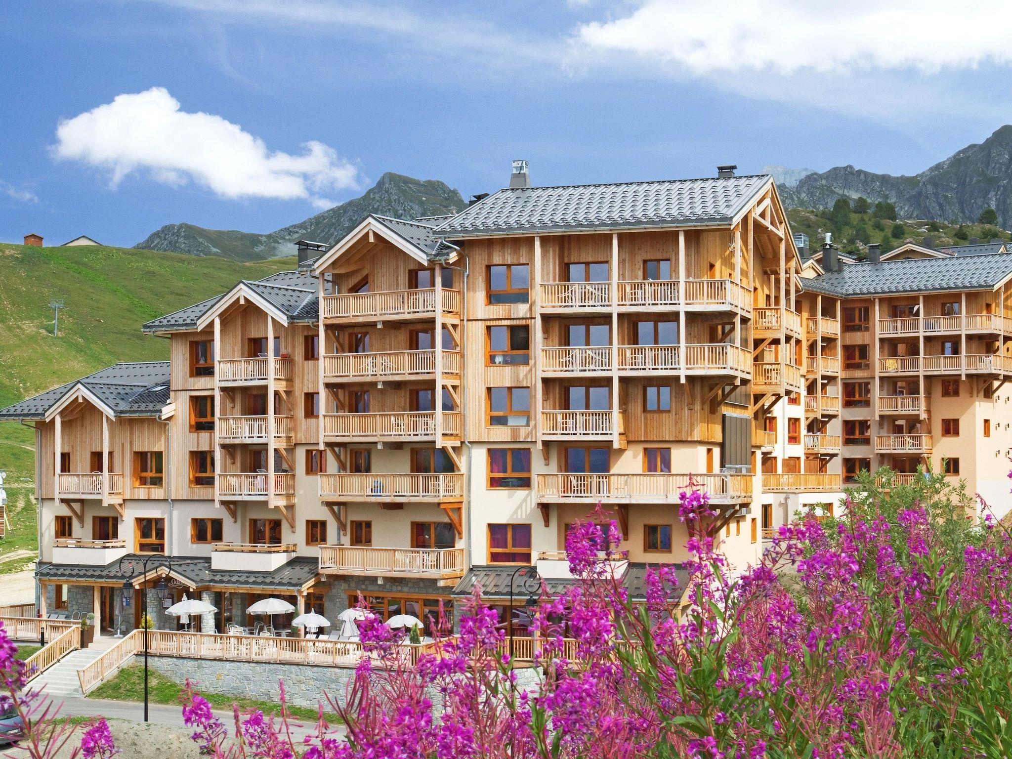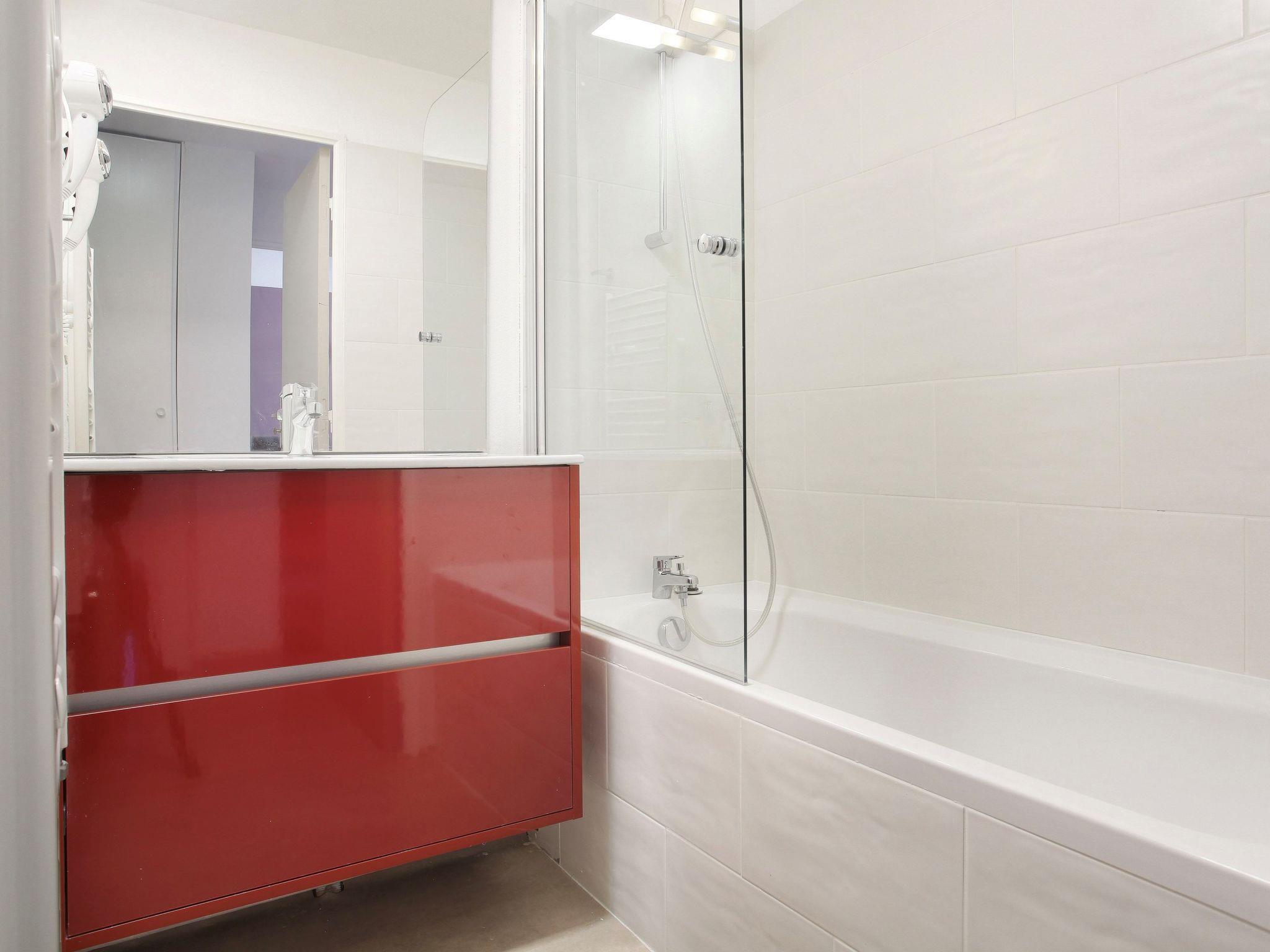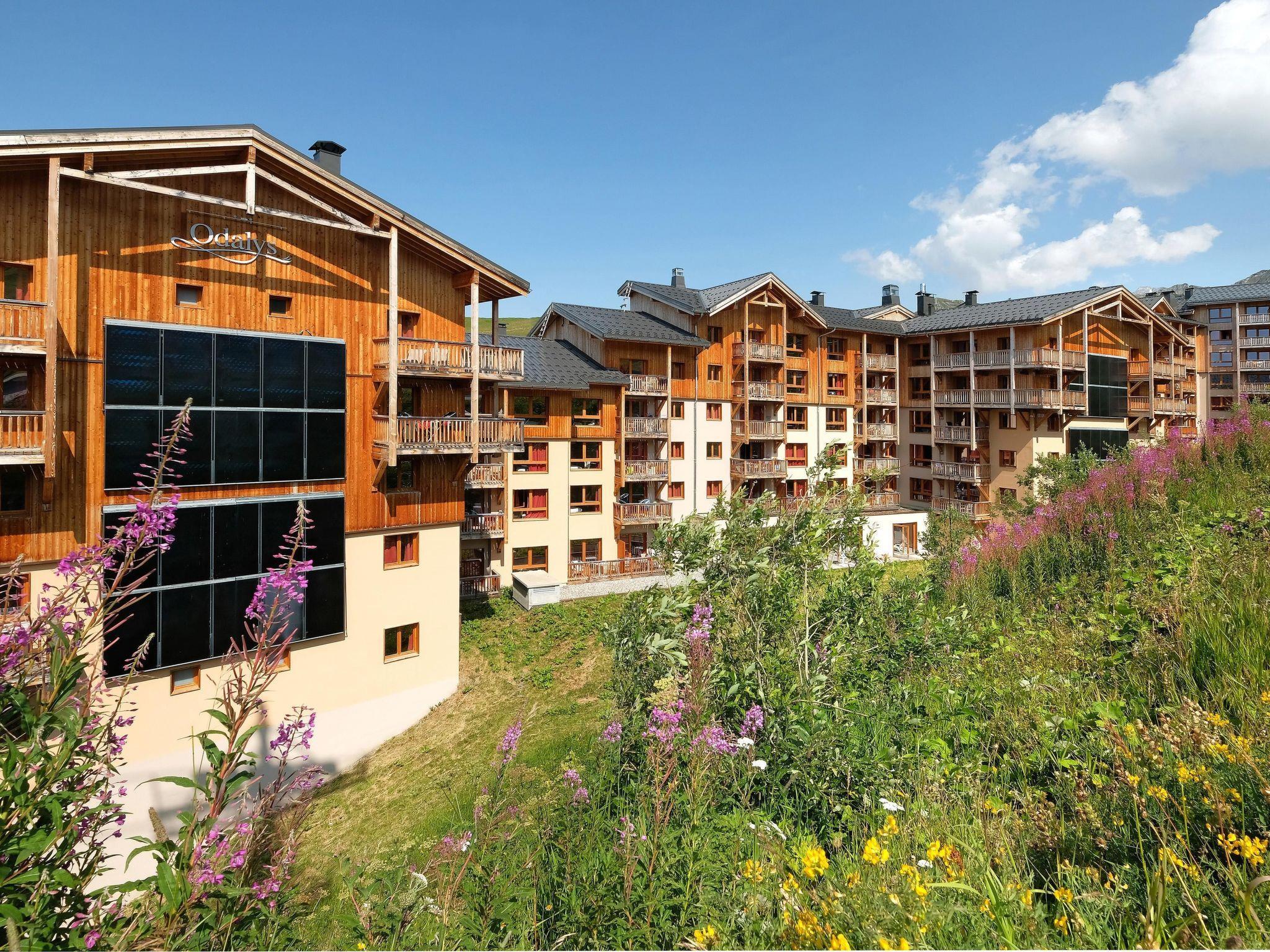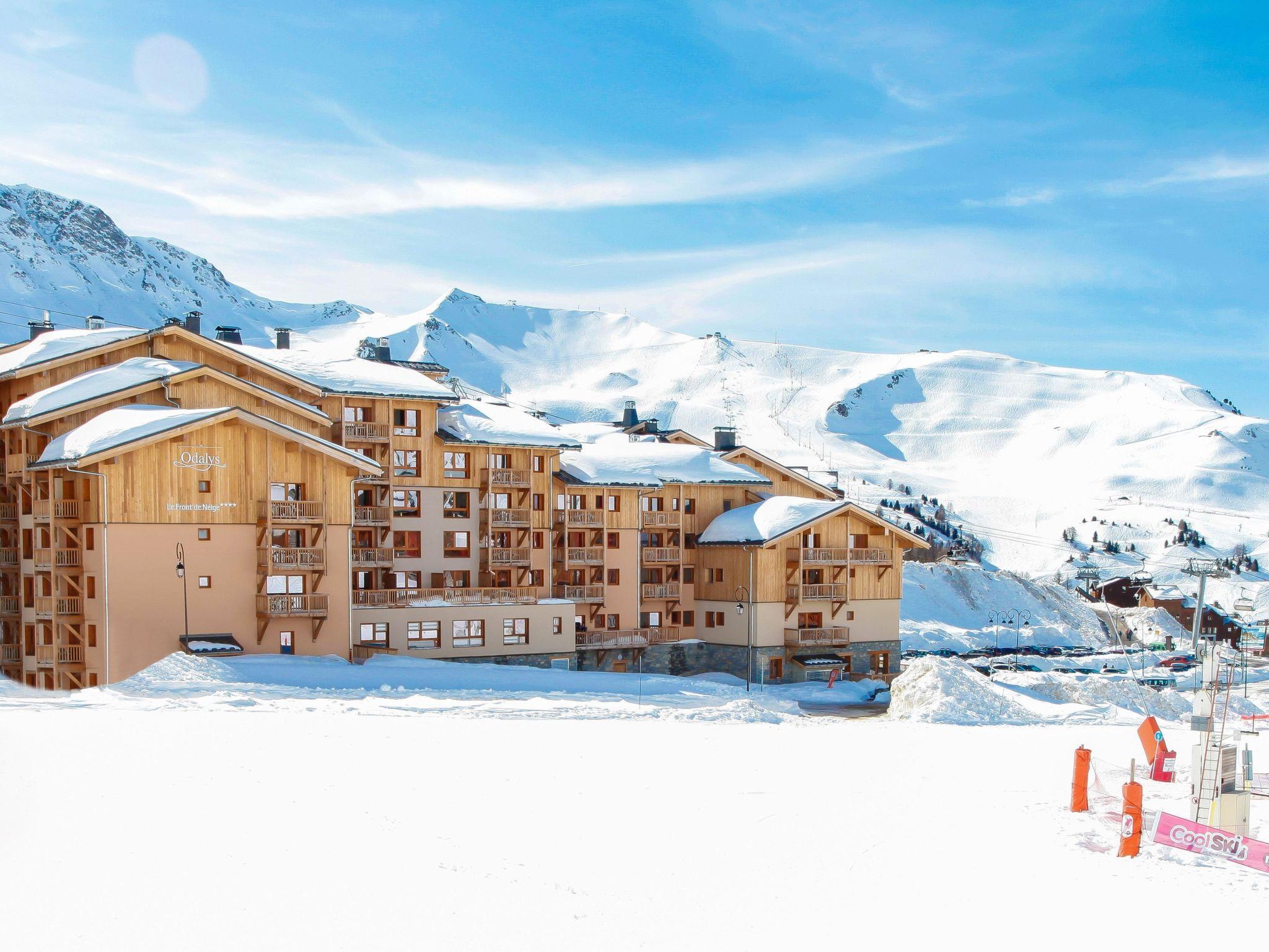 "Odalys Référence Front de Neige", 2-room apartment 32 m2. Modern and tasteful furnishings: living/sleeping room with 1 pull-out bed (2 pers.), dining table and satellite TV. 1 room with 2 sleeping facilities. Small, open kitchen (dishwasher, 4 ceramic glass hob hotplates, toaster, kettle, microwave, electric coffee machine). Sep. WC, bath or shower. Electric heating. Balcony or terrace. Beautiful view of the mountains. Facilities: hair dryer. Internet (WiFi, free). Maximum 1 pet/ dog allowed.