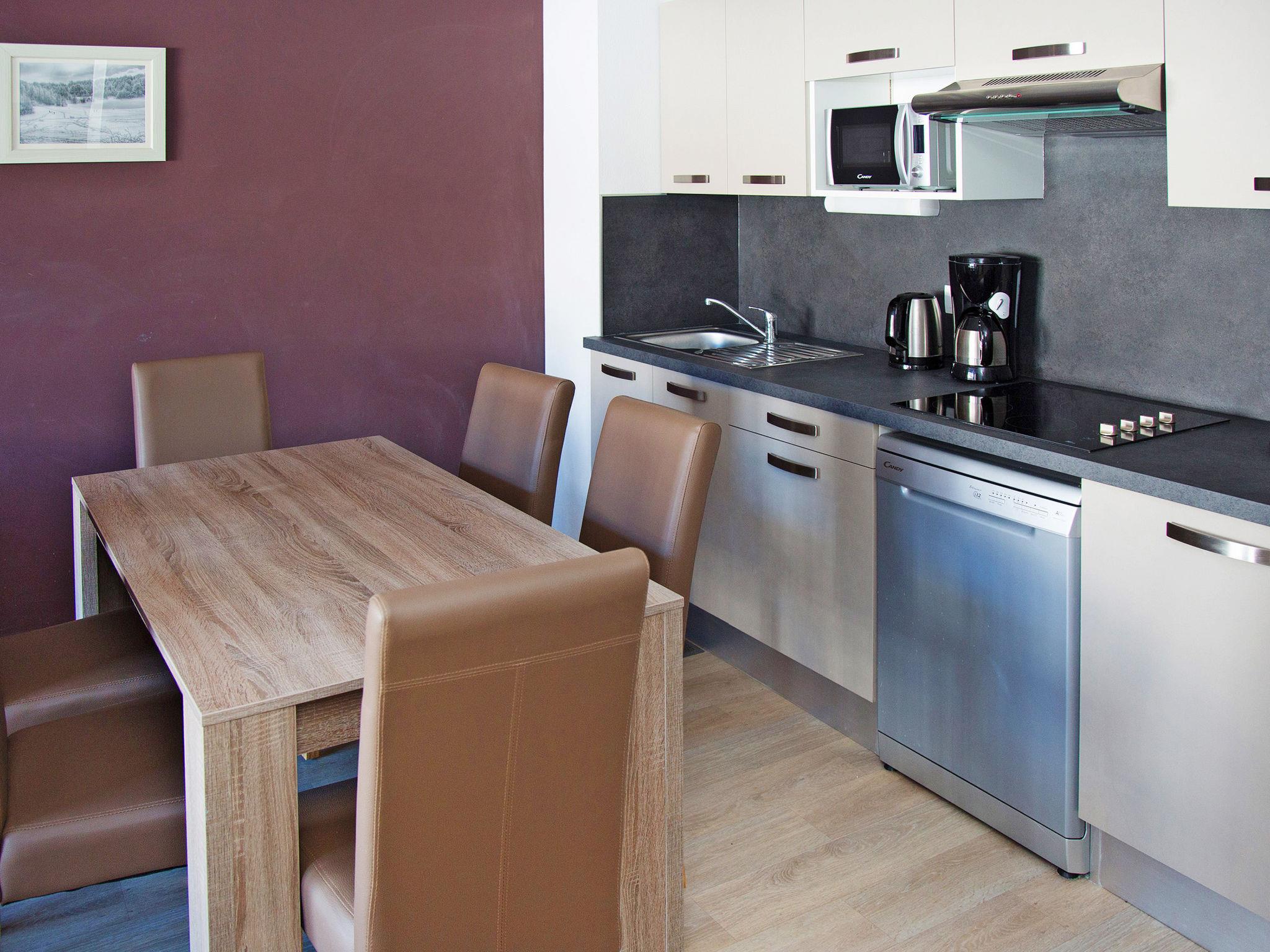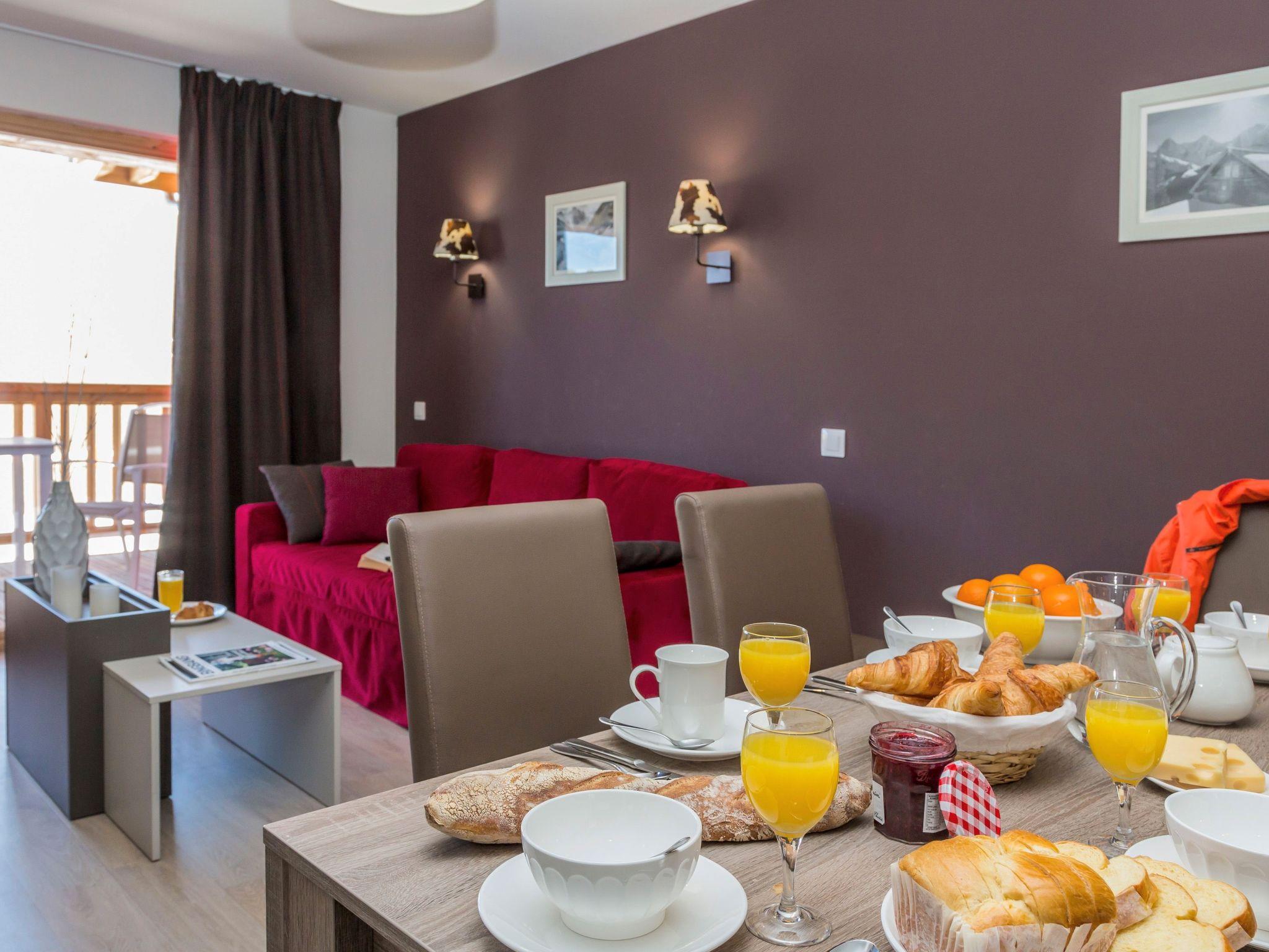 "Odalys Référence Front de Neige", 2-room apartment 39 m2. Modern and tasteful furnishings: living/sleeping room with 1 pull-out bed (2 pers.), dining table and satellite TV. 1 room with 1 french bed. Small alcove with 1 x 2 bunk beds. Open kitchen (dishwasher, 4 ceramic glass hob hotplates, toaster, kettle, microwave, electric coffee machine). Sep. WC, bath or shower. Electric heating. Balcony or terrace. Beautiful view of the mountains. Facilities: Internet (WiFi, free). Maximum 1 pet/ dog allowed. Instead of an enclosed bedroom, some sleeping areas are located in an open-plan area (gallery, alcove, etc.).
