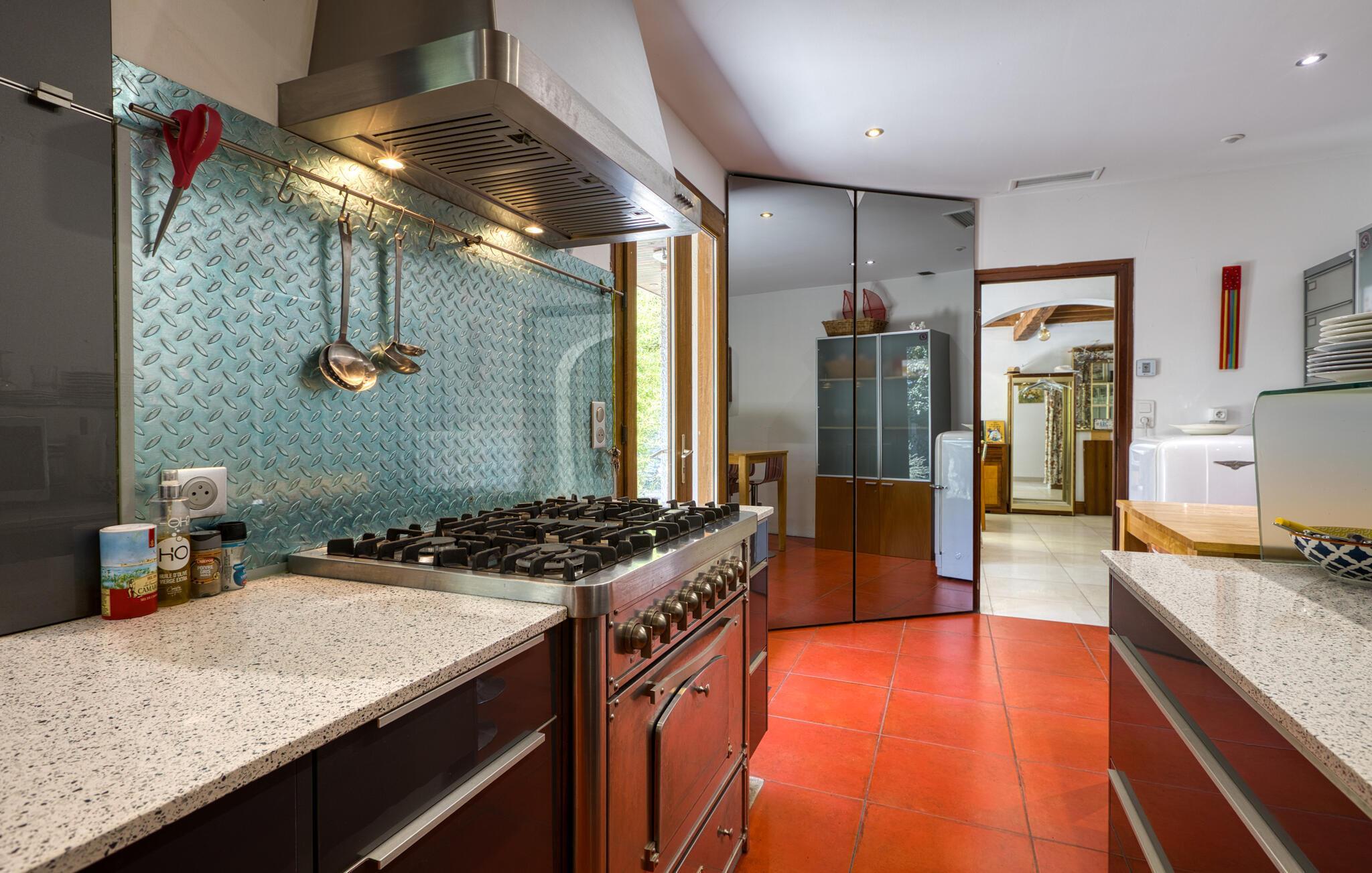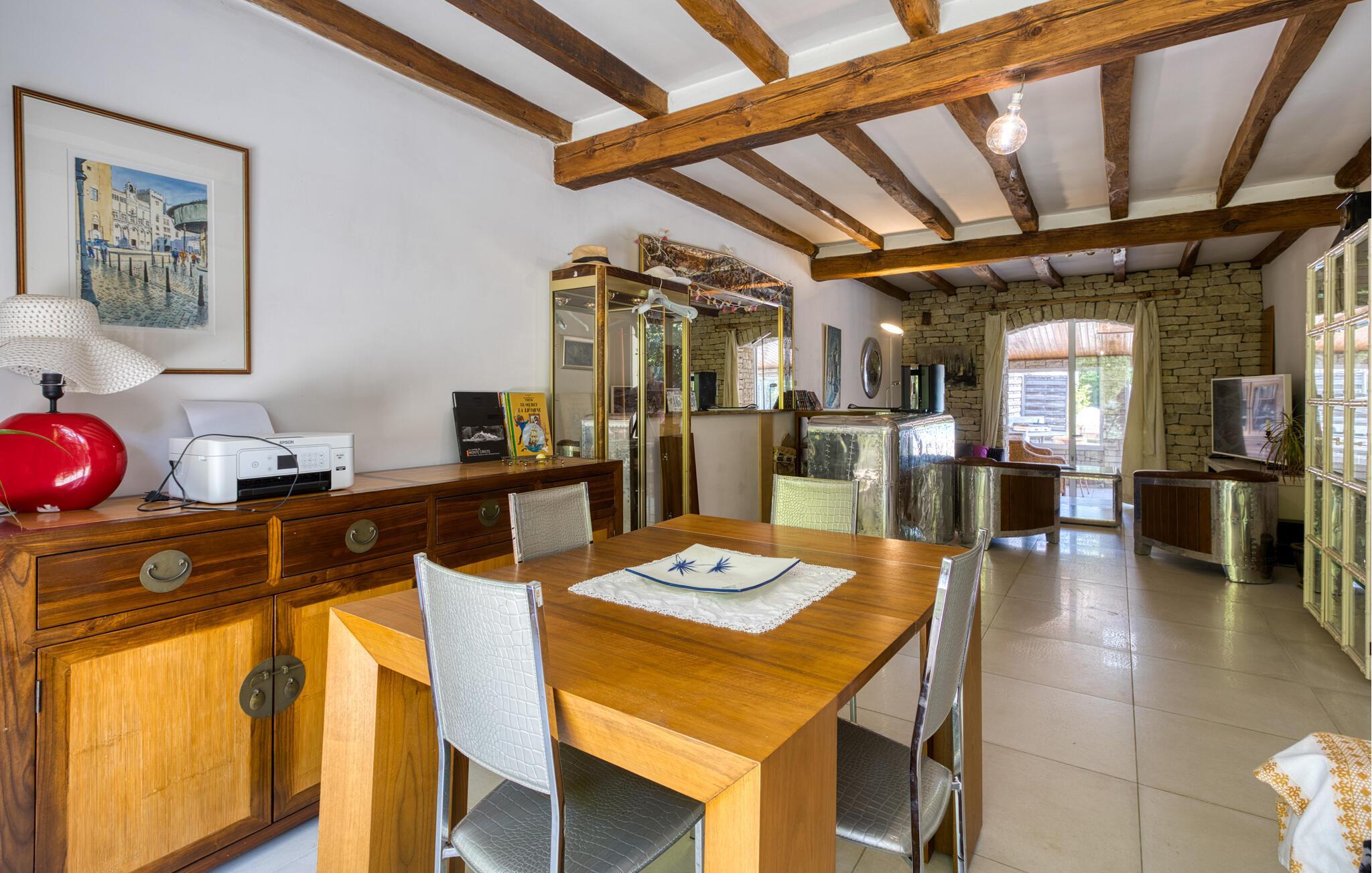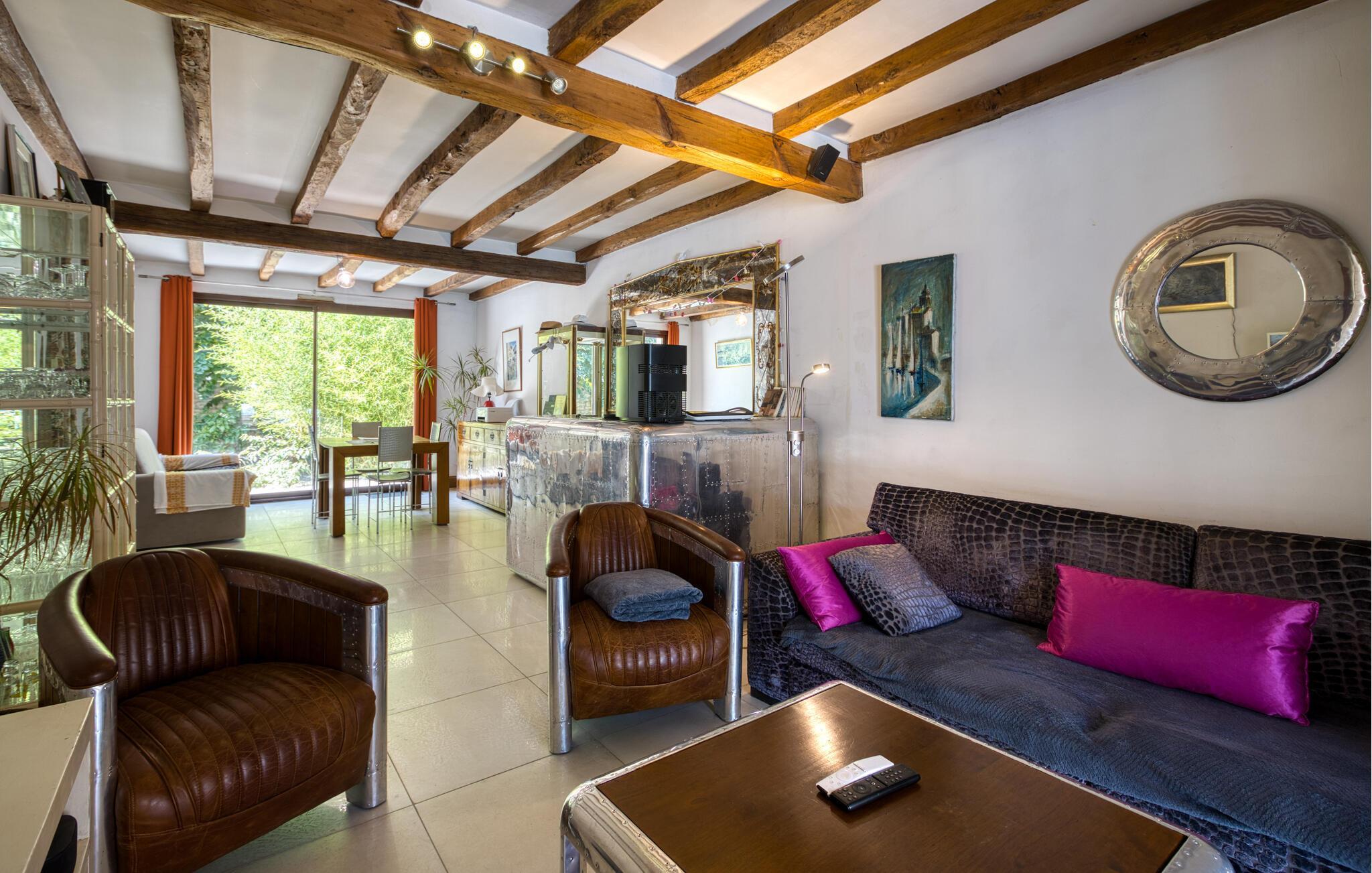 Treten Sie ein und lassen Sie sich von der originellen und stilvollen Einrichtung dieses geräumigen Ferienhauses begeistern. Zaubern Sie in der einladenden Küche gemeinsam französische Köstlichkeiten und zelebrieren Sie das Ergebnis im hellen Wintergarten. Kuscheln Sie sich nach einem langen Tag auf das gemütliche Sofa, spielen Sie ein Gesellschaftsspiel oder entspannen Sie bei einem guten Film.