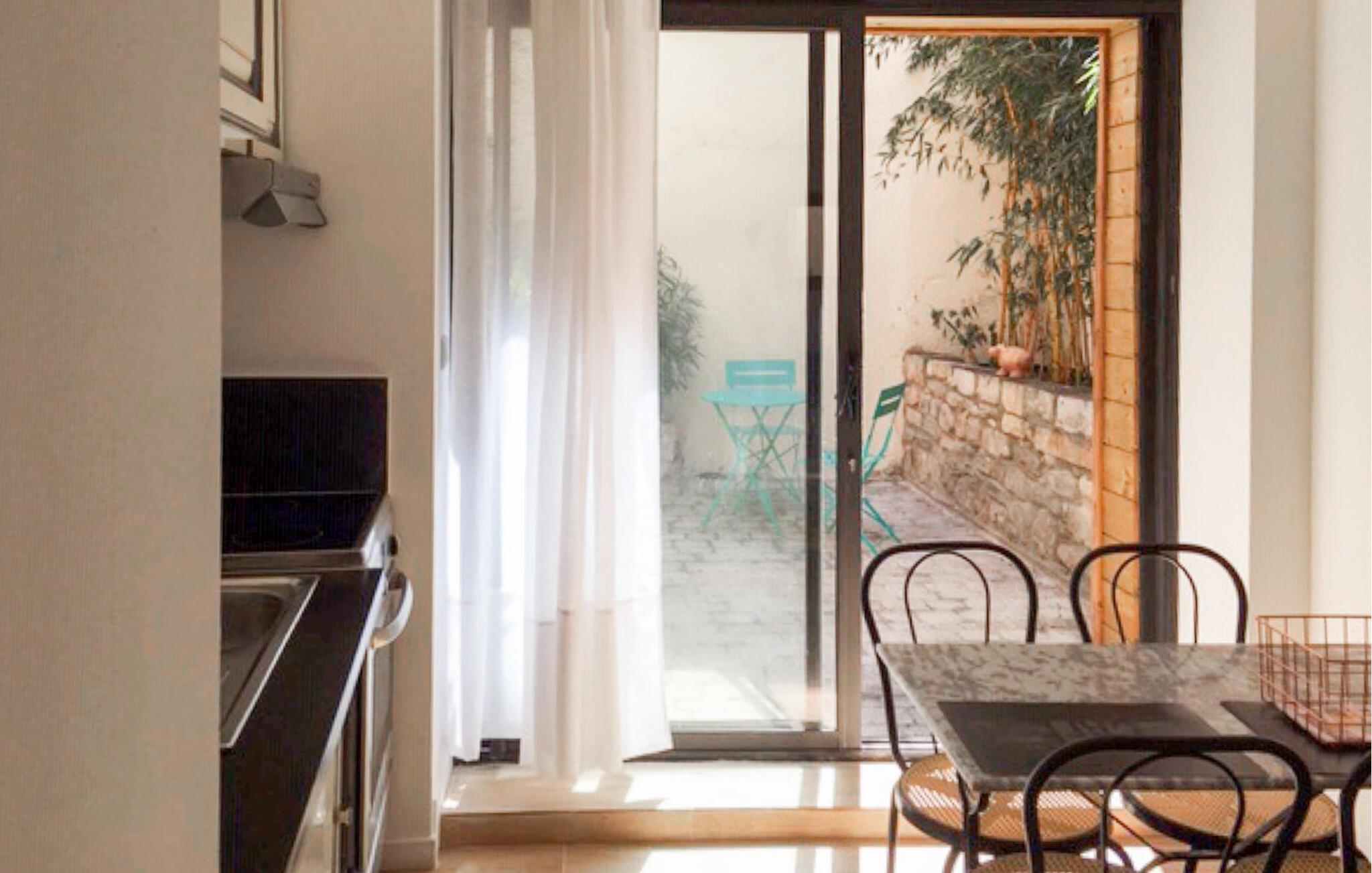Öffnen Sie die Terrassentür und nehmen Sie Platz an der kleinen Sitzgruppe. Lassen Sie hier den Tag bei einem Glas Wein ausklingen. Genießen Sie die ruhige Atmosphäre der bepflanzten Ecke mit großen Pflanzenkübeln, die dem Hof seinen besonderen Charme verleihen. Finden Sie Ruhe abseits des Trubels und entspannen Sie ungestört im Freien.