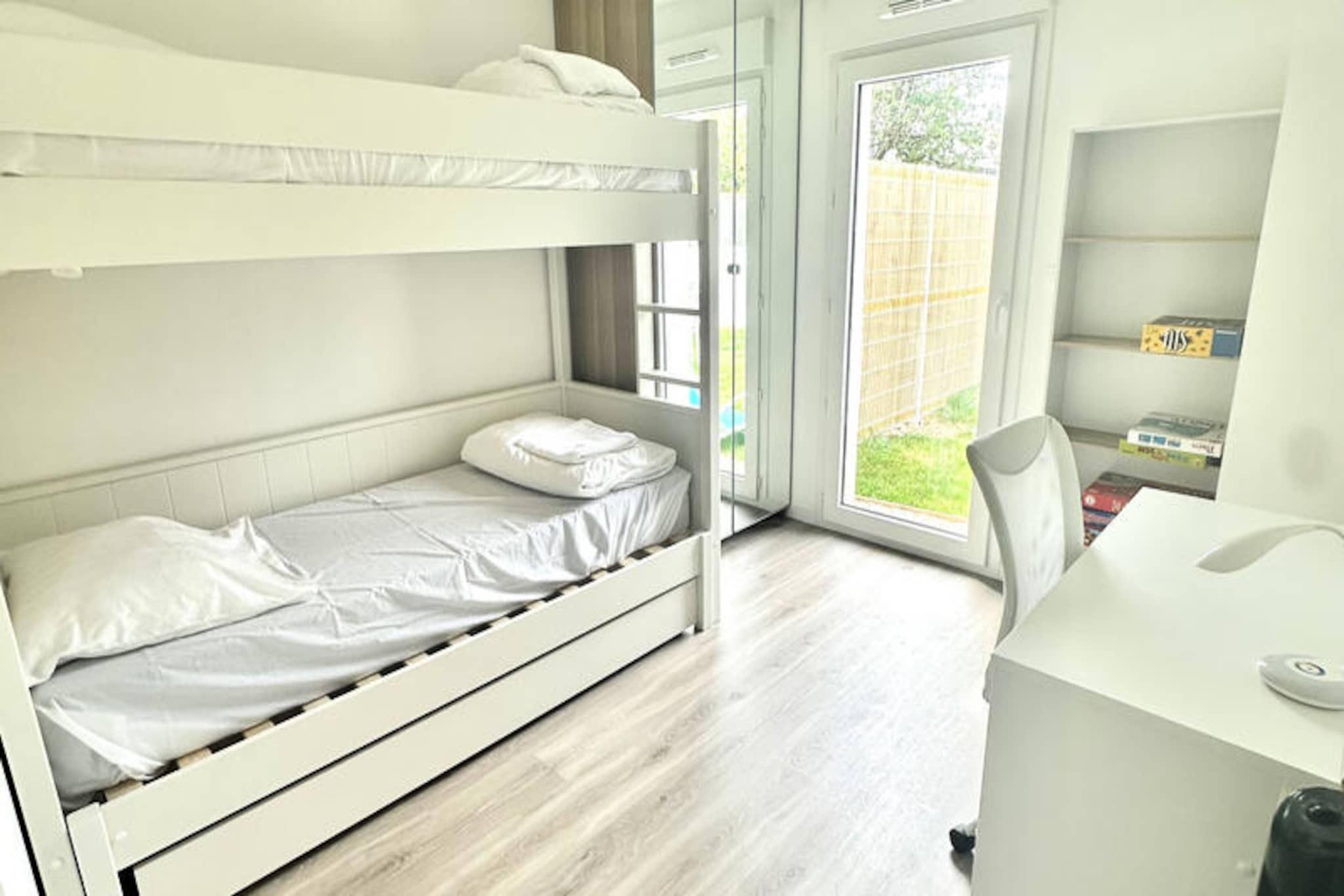 Hidden in a serene corner of La Rochelle, this charming ground-floor apartment offers a perfect blend of modern comfort and tranquil living. Just a short distance from the train station, this property is ideal for those seeking convenience without sacrificing peace and quiet. The secure, contemporary residence ensures a safe and relaxing stay, while the private enclosed garden invites you to unwind with a morning coffee or an evening barbecue amidst the fresh coastal air. Inside, the apartment is thoughtfully designed to accommodate up to four guests. The living room is a cozy space to relax, while the fully equipped kitchen provides everything you need to prepare delicious meals, from a refrigerator and oven to a coffee maker and toaster. The sleeping arrangements include a bedroom with a comfortable double bed and a second bedroom with versatile bunk beds that can be combined into a double bed. Two modern shower rooms, one with a laundry area, ensure convenience for all guests. Additional amenities such as Wi-Fi, a washing machine, dryer, and electric heating make this apartment a true home away from home. Located in the picturesque town of La Rochelle, you’ll find yourself close to the vibrant harbor, historic streets, and sandy beaches. Explore the local markets, dine on fresh seafood, or take a stroll along the iconic Vieux Port. Whether you’re here for a romantic getaway or a family retreat, this apartment places you at the heart of it all. With bed linen, towels, and cleaning included, your stay will be as effortless as it is memorable.