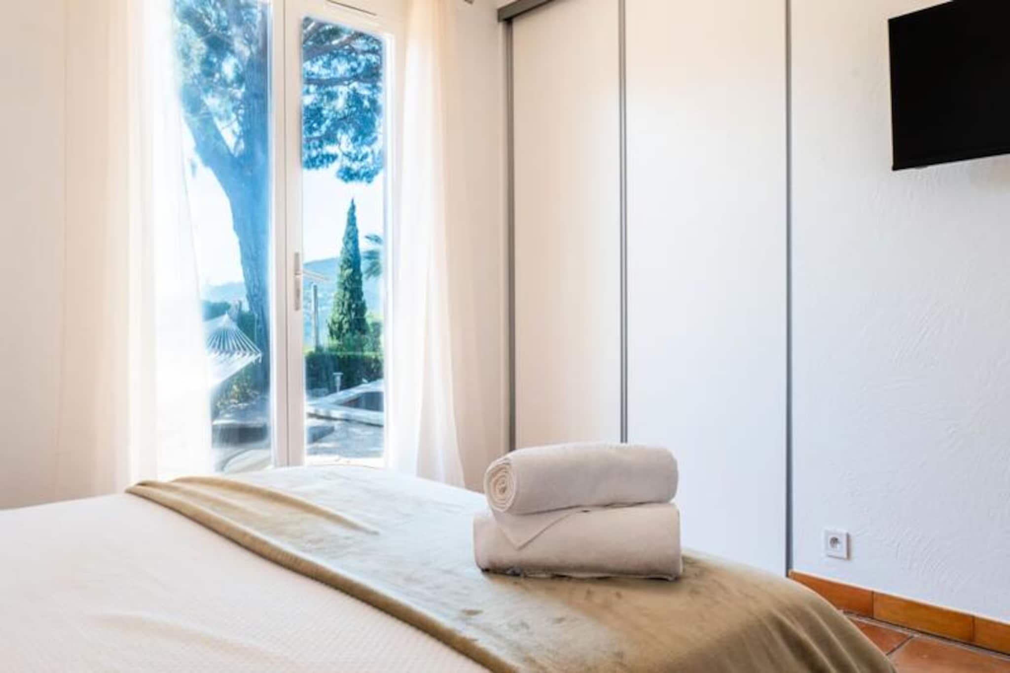 High above the serene hills of La Roquette-sur-Siagne, this enchanting villa offers a luxurious retreat just 12 minutes from the sparkling beaches of Cannes-La-Bocca. Imagine waking up to breathtaking sea views, lounging by the newly renovated pool, and enjoying the absolute tranquility of this hidden gem. Whether you're seeking a peaceful escape or a vibrant family holiday, this property promises unforgettable moments under the Mediterranean sun. \n\nStep inside the beautifully designed 170m² villa, where every detail has been thoughtfully curated. The double living room invites relaxation with its cozy lounge and TV area, while the open-plan kitchen is fully equipped for culinary adventures. Five bedrooms, including a master suite with a private terrace and sea views, ensure comfort for all guests. The east wing features a sauna, a spacious bathroom, and charming bedrooms, while the separate studio below the house offers privacy and convenience. Outdoors, the 10x5m heated pool, furnished terraces, and gas barbecue set the stage for endless enjoyment. \n\nLocated just minutes from local shops and the picturesque village of La Roquette, this villa is perfectly situated for exploring the French Riviera. Discover the glamour of Cannes and its iconic Croisette, or venture to Mougins for golf, tennis, and nature trails. Mandelieu’s beaches and restaurants are also within easy reach, offering a variety of activities for every taste. \n\nWith its seamless blend of luxury, comfort, and location, this villa is your gateway to the best of the Côte d'Azur. Let the Mediterranean breeze and stunning vistas create lasting memories for you and your loved ones.