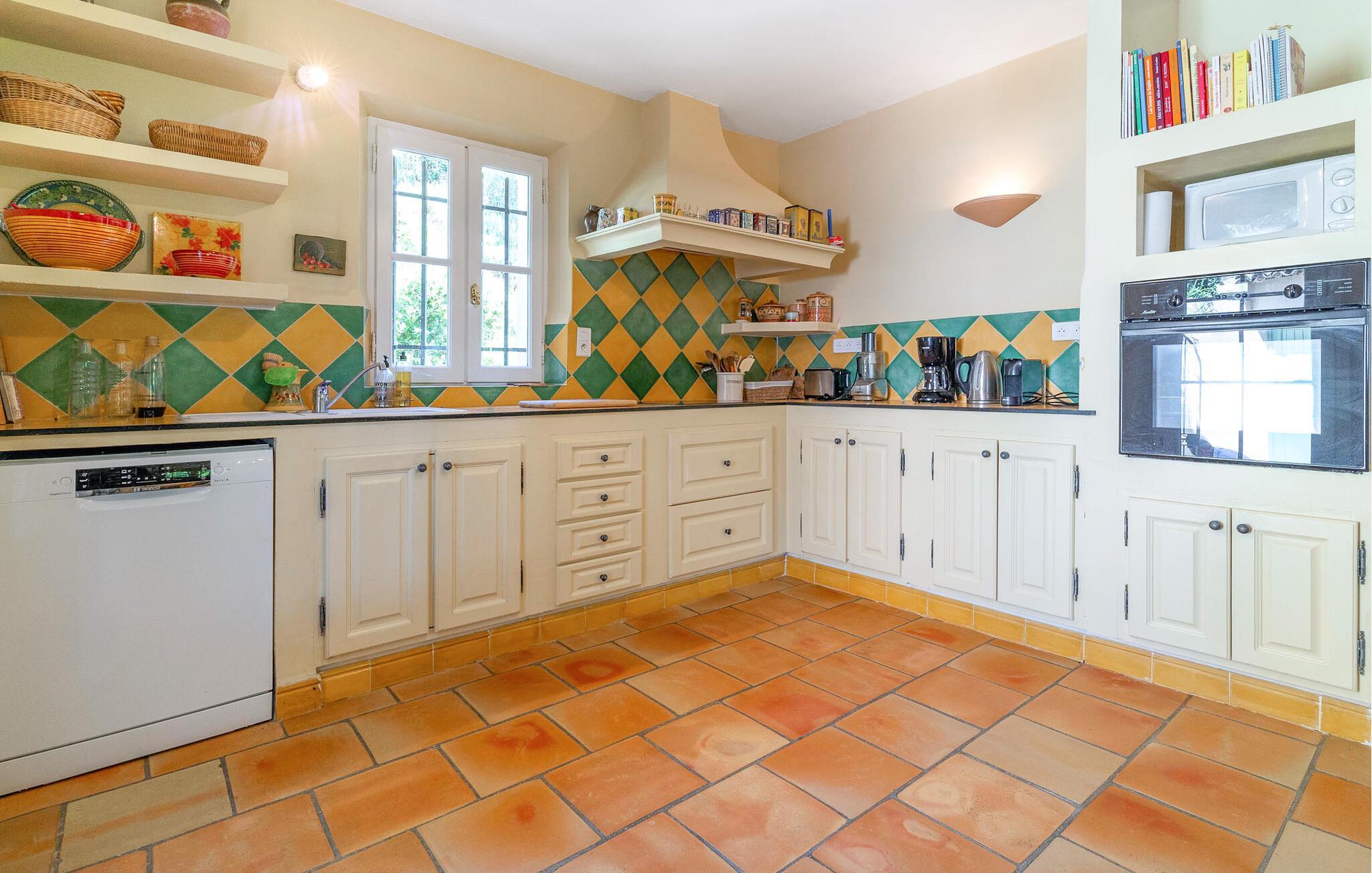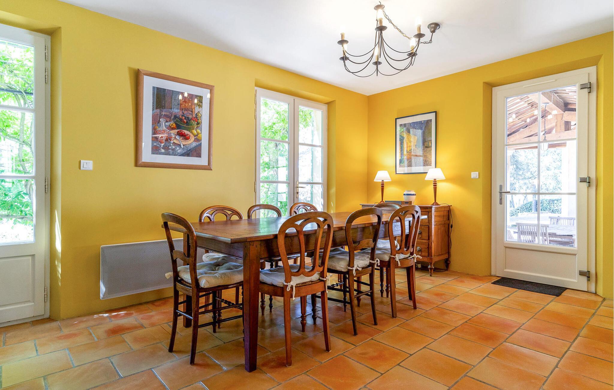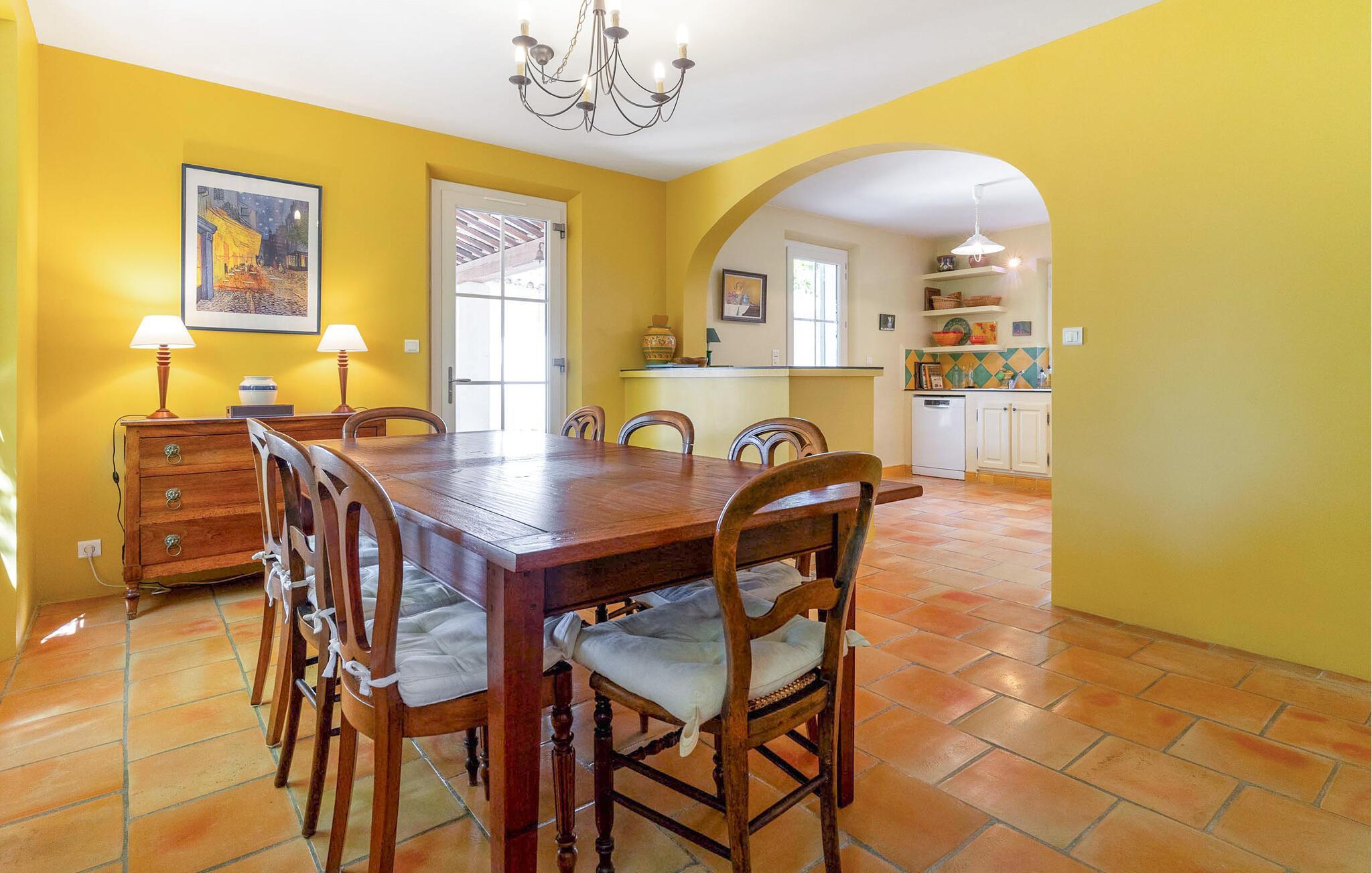 Dieses charmante provenzalische Ferienhaus in La Tour-d'Aigues ist ein perfekter Rückzugsort für alle, die Ruhe und Entspannung in der Provence suchen. Die großzügigen Innenräume sind geschmackvoll eingerichtet und bieten einen einladenden Wohnbereich mit offener Küche. Genießen Sie die fröhlichen Farben und die klassischen Holzmöbel, die es Ihnen einfach machen, sich auf den zwei Etagen zu entspannen und erholt Ihrem Ferienalltag nachzugehen.
