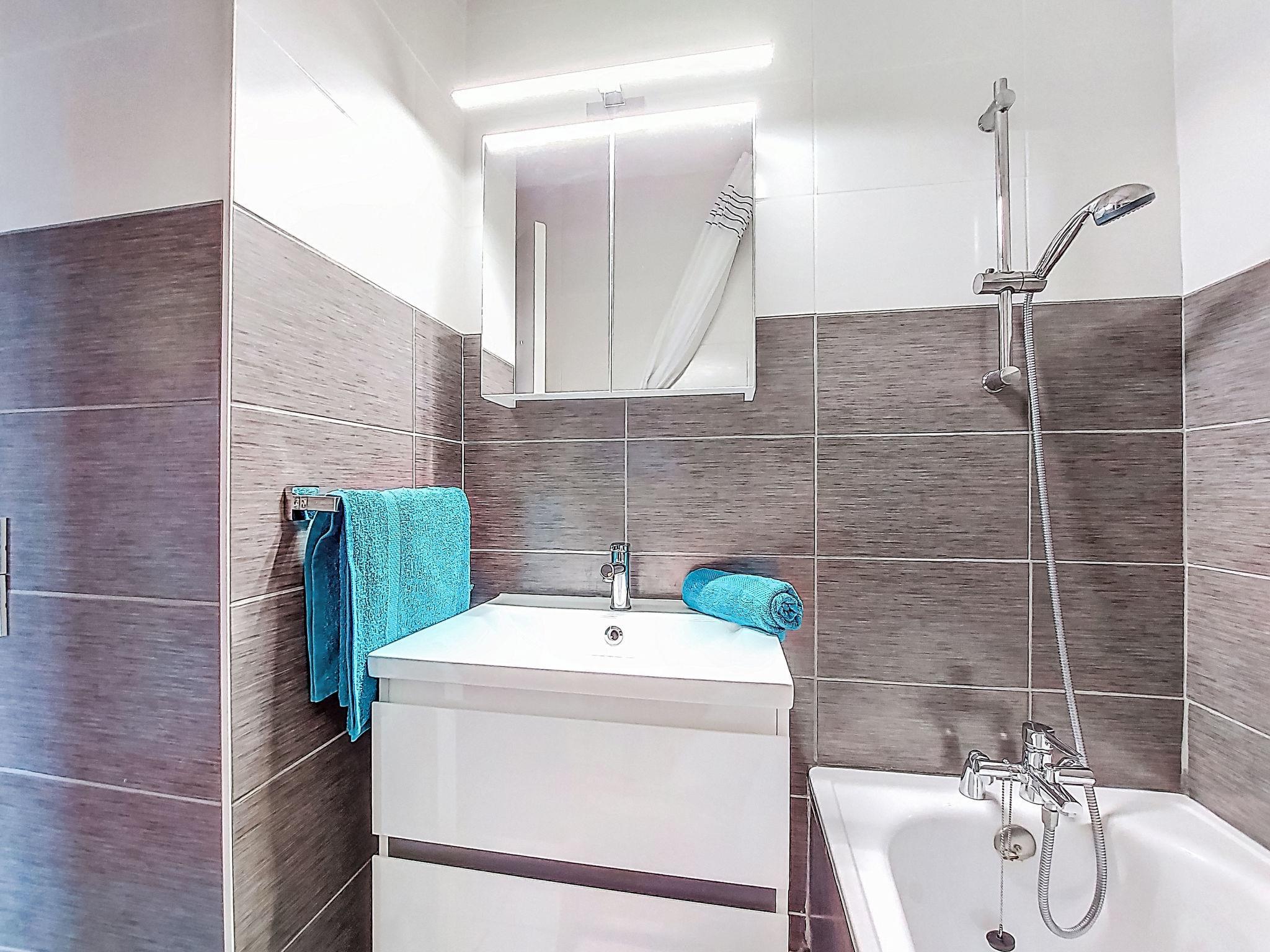 2-room apartment 32 m2 on 2nd floor, south facing position. Very beautiful and cosy furnishings: living/dining room with 1 double sofabed (140 cm, length 190 cm), TV (flat screen), DVD and electric shutters. Exit to the balcony, south facing position. 1 room with 1 x 2 bunk beds (90 cm, length 190 cm), electric shutters. Exit to the balcony, south facing position. Small kitchen (oven, dishwasher, 2 induction hot plates, toaster, kettle, microwave, electric coffee machine). Bathroom, sep. WC. Heating. Carpet. Balcony 6 m2, south facing position. Balcony furniture. Beautiful view of the mountains and the resort. Facilities: hair dryer. Internet (WiFi, extra). Please note: non-smokers only. Smoke alarm. Offer by a private individual according to Art. 155, IV of CGI.