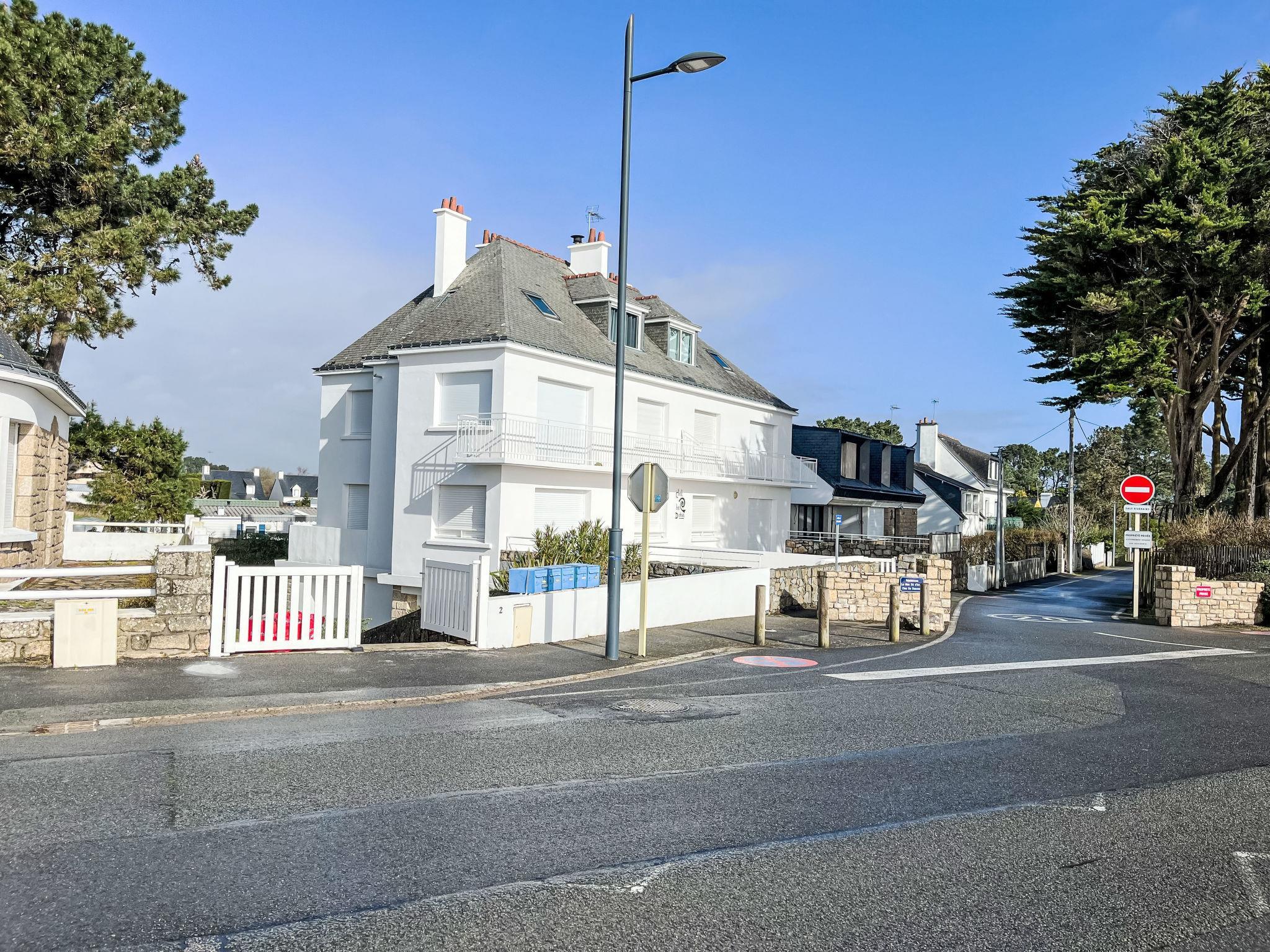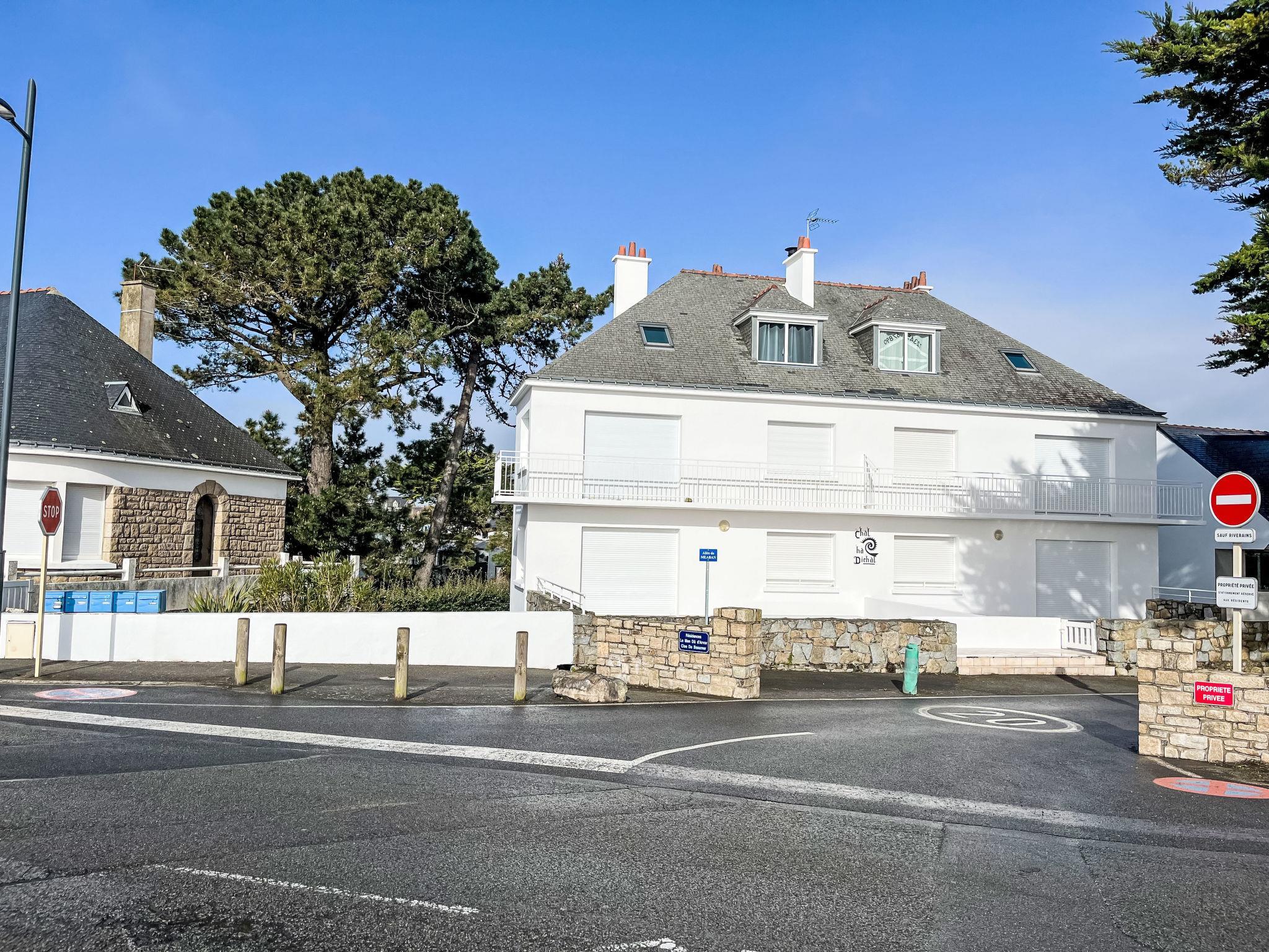 Apartment block "Chal Ha Dichal", 3 storeys. On the outskirts, 2 km from the centre of Carnac Plage, 10 m from the sea, 10 m from the beach. For shared use: property (fenced), public parking on the road. Shop 2 km, grocery 750 m, supermarket, restaurant 10 m, bakery 1.8 km, café, sandy beach "Le Men Du" 10 m, thermal baths "Thalazur" 2.5 km. Sports harbour 2.7 km, golf course (18 hole) 15 km, surf school 9 km, sailing school 2 km, tennis 750 m. Nearby attractions: Grande Plage de Carnac 1.6 km, Port de La Trinité sur mer 5 km, Auray et le port de Saint Goustan 15 km, Presqu'île de Quiberon 18 km, Vannes 33 km, Lorient 38 km.
