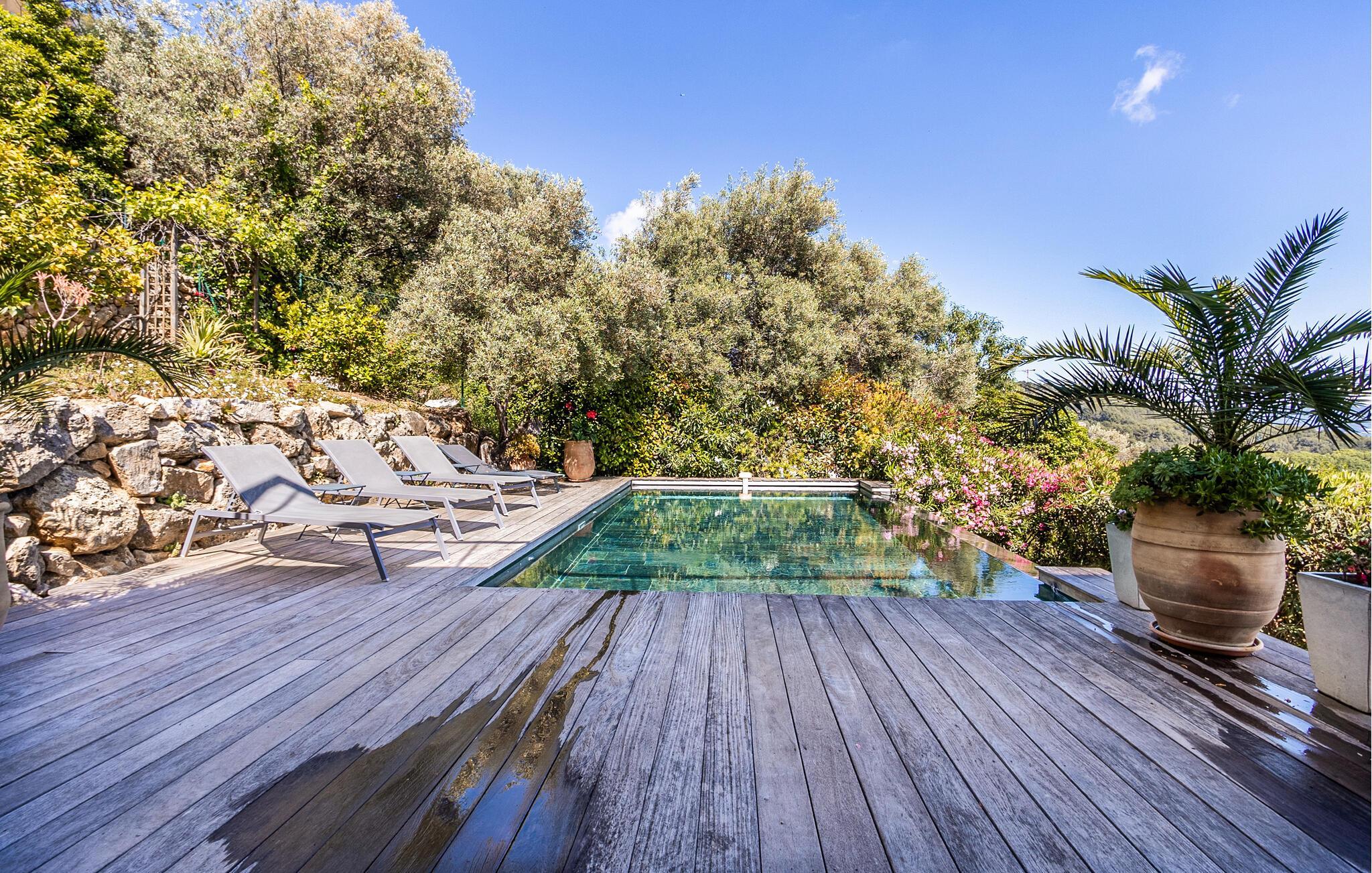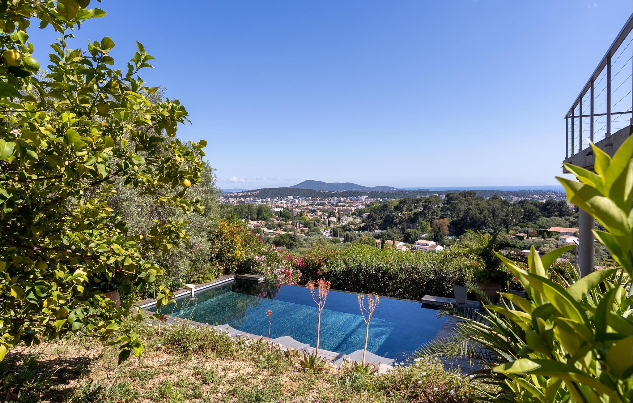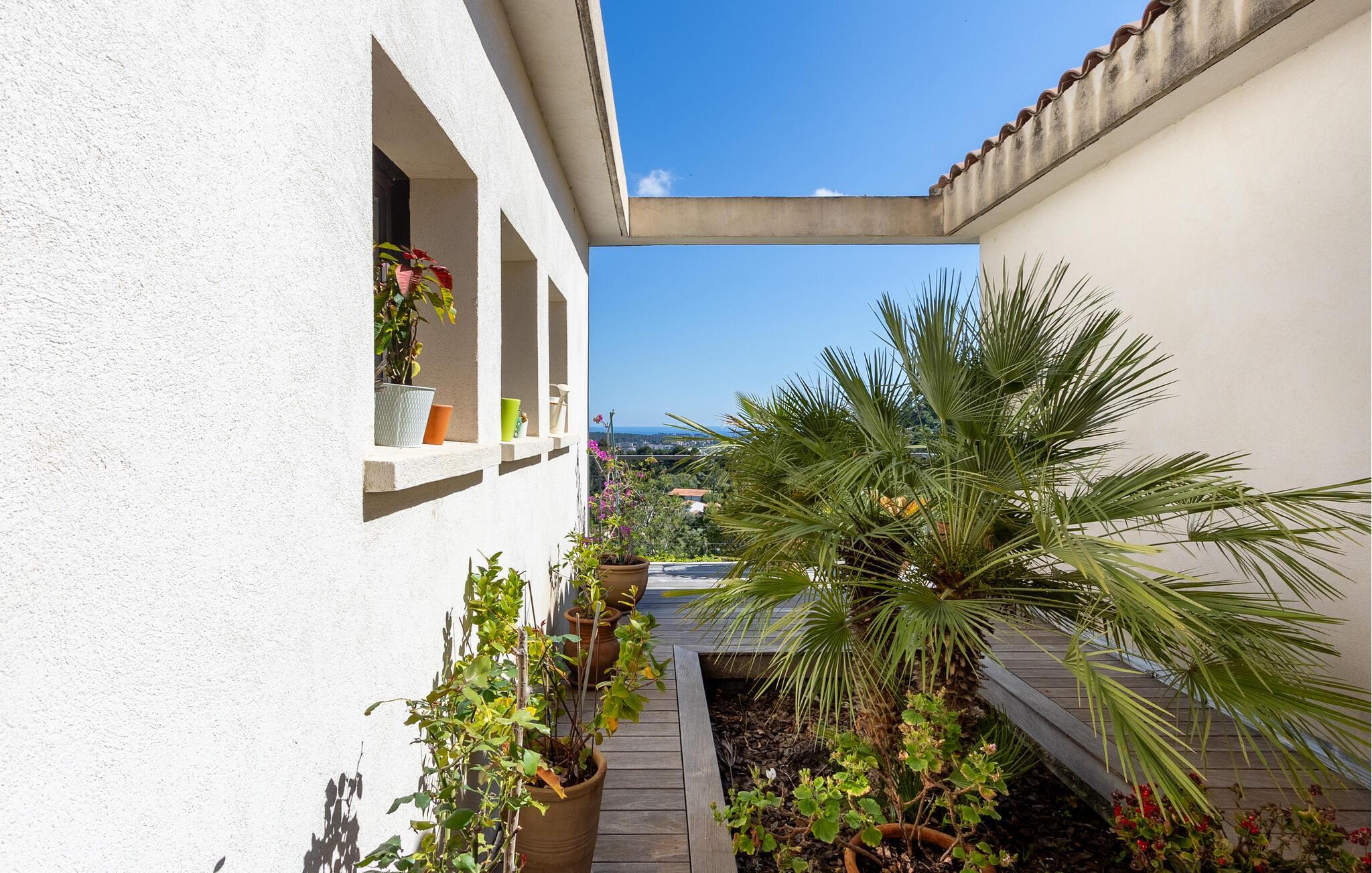Dieses Haus liegt zwischen dem Mont Faron und dem Mont Coudon und bietet fantastische Blicke über die Bucht von Le Pradet und die Goldenen Inseln. Alle Zimmer, einschließlich der Schlafzimmer, haben große, gläserne Türen und Meeresblicke, während das Wohnzimmer auf eine hölzerne Terrasse mit einem überdachten Außenbereich und einem Pool geht. Die Küche hat einen Ausgang zu einem unabhängigen Patio, wo sie Ihr Frühstück genießen können. Le Pradet ist ein reizender Badeort zwischen Hyères und Toulon, der sich über 7 km der Küste entlang erstreckt. Wilde Buchten wechseln sich mit Sandstränden ab und sind von schönen Mittelmeerpflanzen umgeben. Die Îles d’Or sind die Juwelen der Küste und voller Erinnerungen an ihre aufgeregte Geschichte. Innentreppe ohne Geländer.