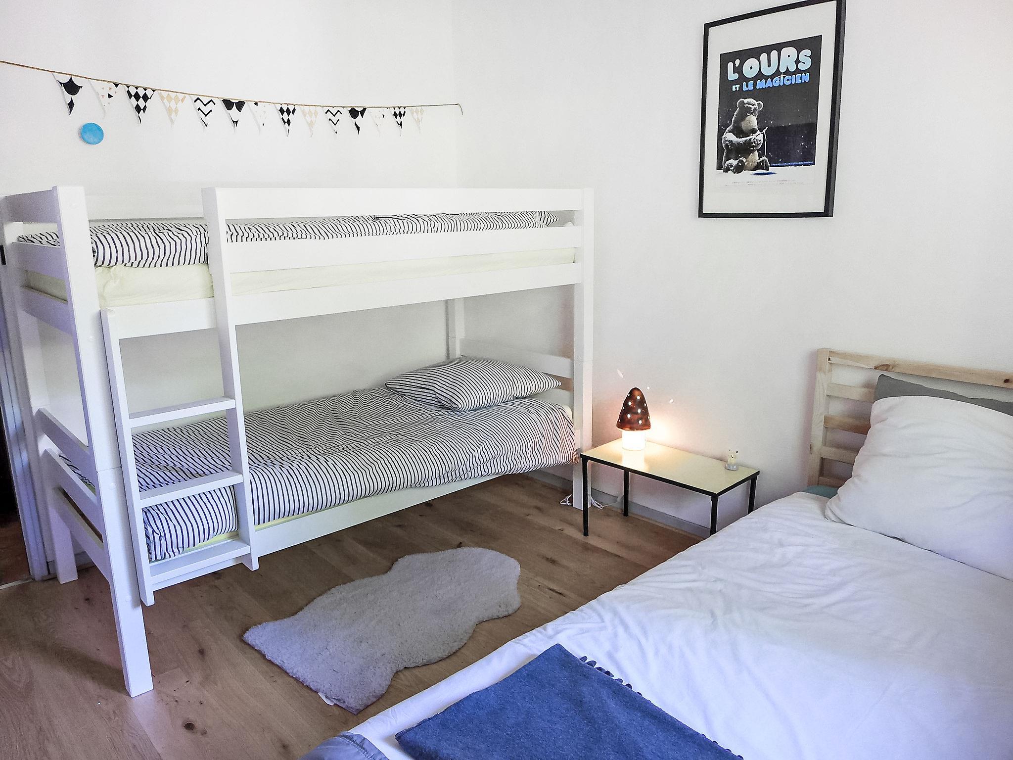 3-room house 80 m2. Living/dining room with 1 sofabed (100 cm, length 190 cm), open-hearth fireplace, TV, hi-fi system and DVD. Exit to the veranda. 1 room with 1 french bed (1 x 160 cm, length 190 cm). 1 room with 1 bed (90 cm, length 190 cm), 1 x 2 bunk beds (90 cm, length 190 cm). Open kitchen (4 hot plates, oven, dishwasher, microwave). Shower, sep. WC. Large terrace 24 m2, south facing position. Terrace furniture, deck chairs (3). Facilities: washing machine. Internet (WiFi, extra). Please note: non-smokers only. Maximum 1 pet/ dog allowed. Smoke alarm.