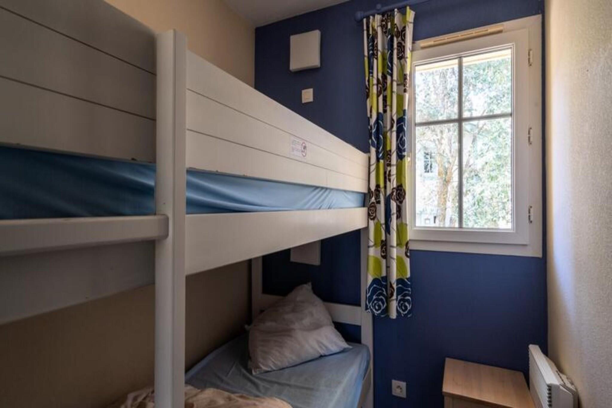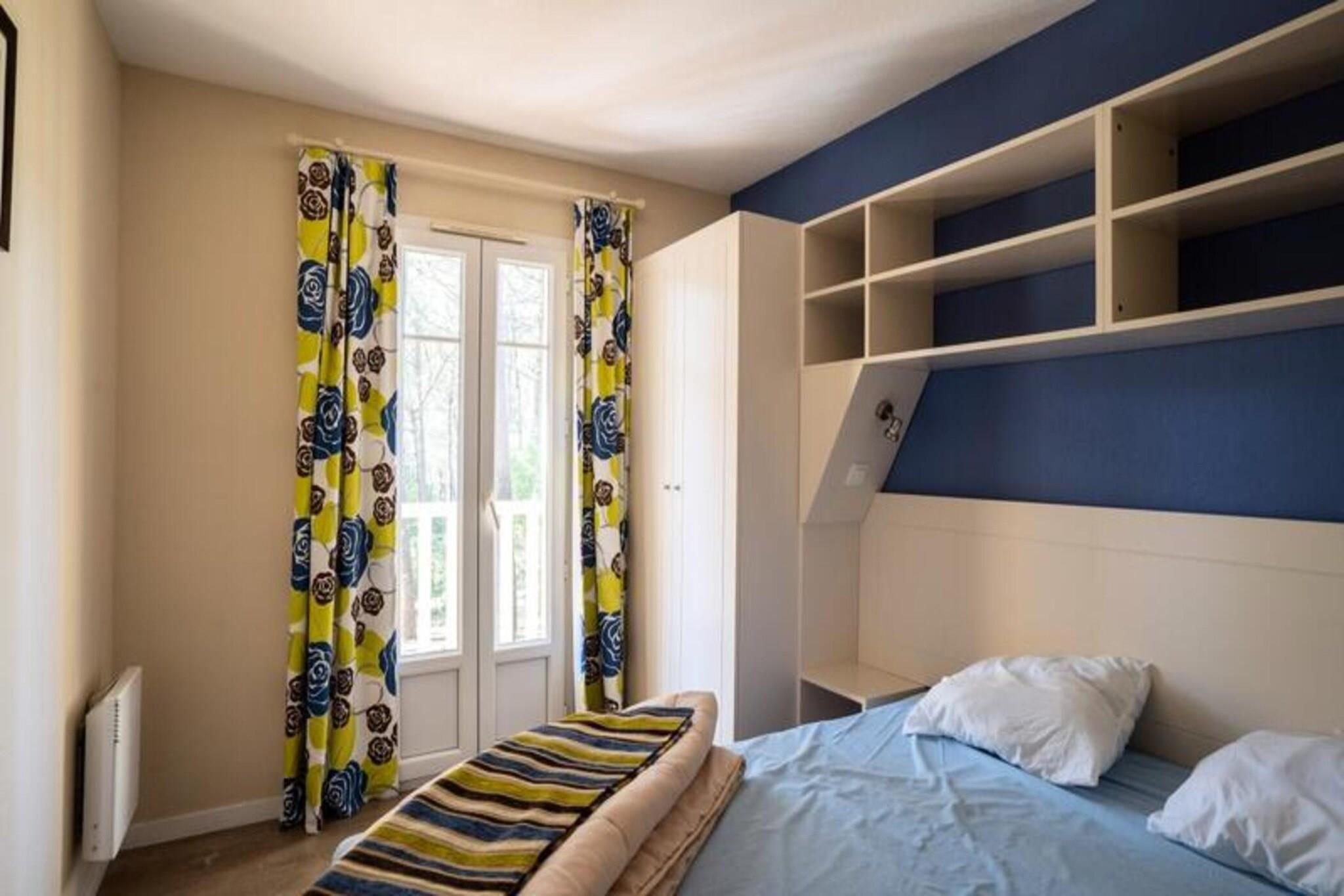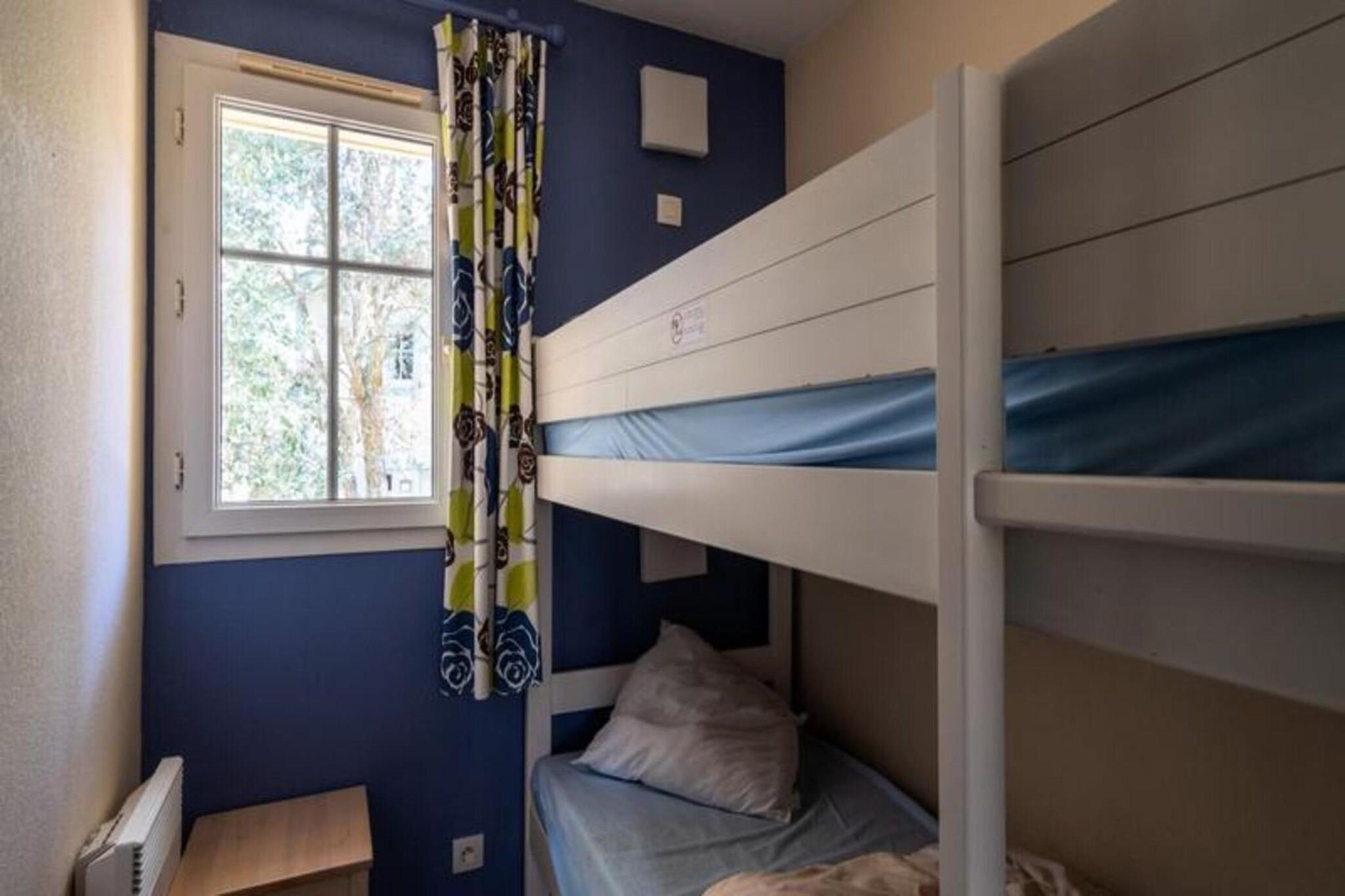 These private holiday homes, nestled within the serene pine forest of La Résidence Lacanau Les Pins, offer a charming retreat for families or small groups. The 54m² houses are designed in typical Landes-style with colorful pastel tones, and comfortably sleep up to 6 guests. The ground floor features a living room with a sofa bed, a semi-open kitchen, and a dining area with seating for 6. Upstairs, there are two bedrooms—one with a double bed and the other with two single beds—plus a cabin area with bunk beds, making it ideal for children. The property is non-pet-friendly, ensuring a peaceful stay for all guests. A separate bathroom with a bathtub-shower, a second shower room with WC, and an additional separate toilet ensure convenience for all. Just 2 kilometers from the beach, this location offers outdoor activities for all ages, including two golf courses, a swimming pool, volleyball, multi-sport, and pétanque courts. Cycling paths along the coast and Lacanau's surfing beaches are nearby. Guests can also rent bikes or join yoga and swimming lessons. This house features a fully equipped semi-open kitchen, living area, and a private garden with a terrace. Free outdoor parking is available, with additional amenities like Wi-Fi, bed linen, towels, and end-of-stay cleaning for an extra charge. Guests also enjoy free access to the aquatic area and discounts at the nearby Vital Parc spa.