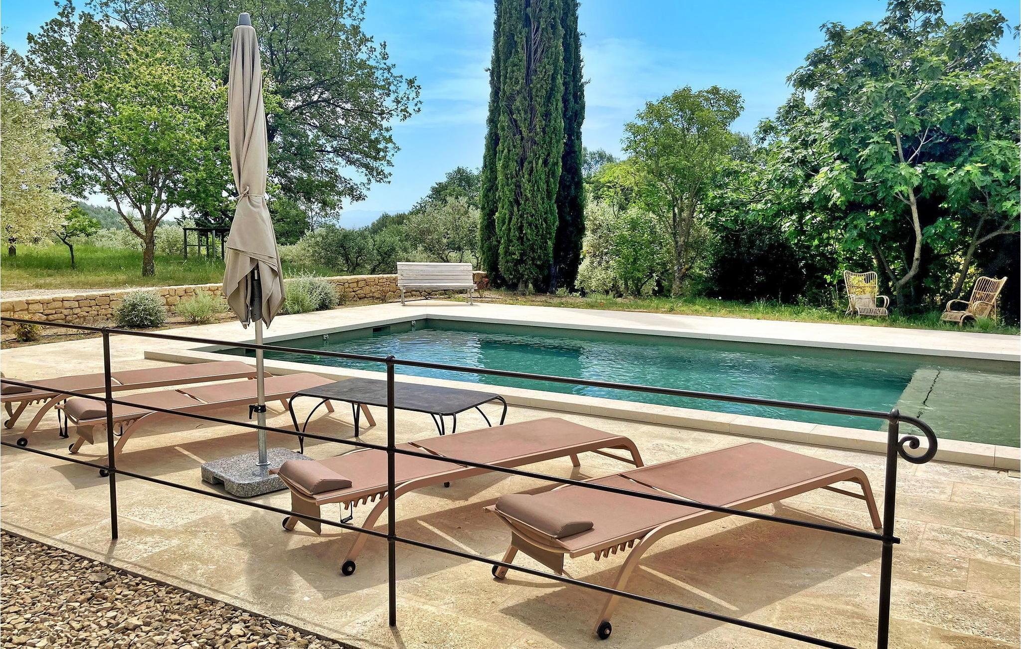 Der Pool (8m x 4,5m) ist mit einem Rollladen gesichert und verfügt über Liegestühle zum Entspannen. Das Haus liegt mitten in einem Waldgebiet mit direktem Zugang zu den Spazier- und Wanderwegen des Luberon.