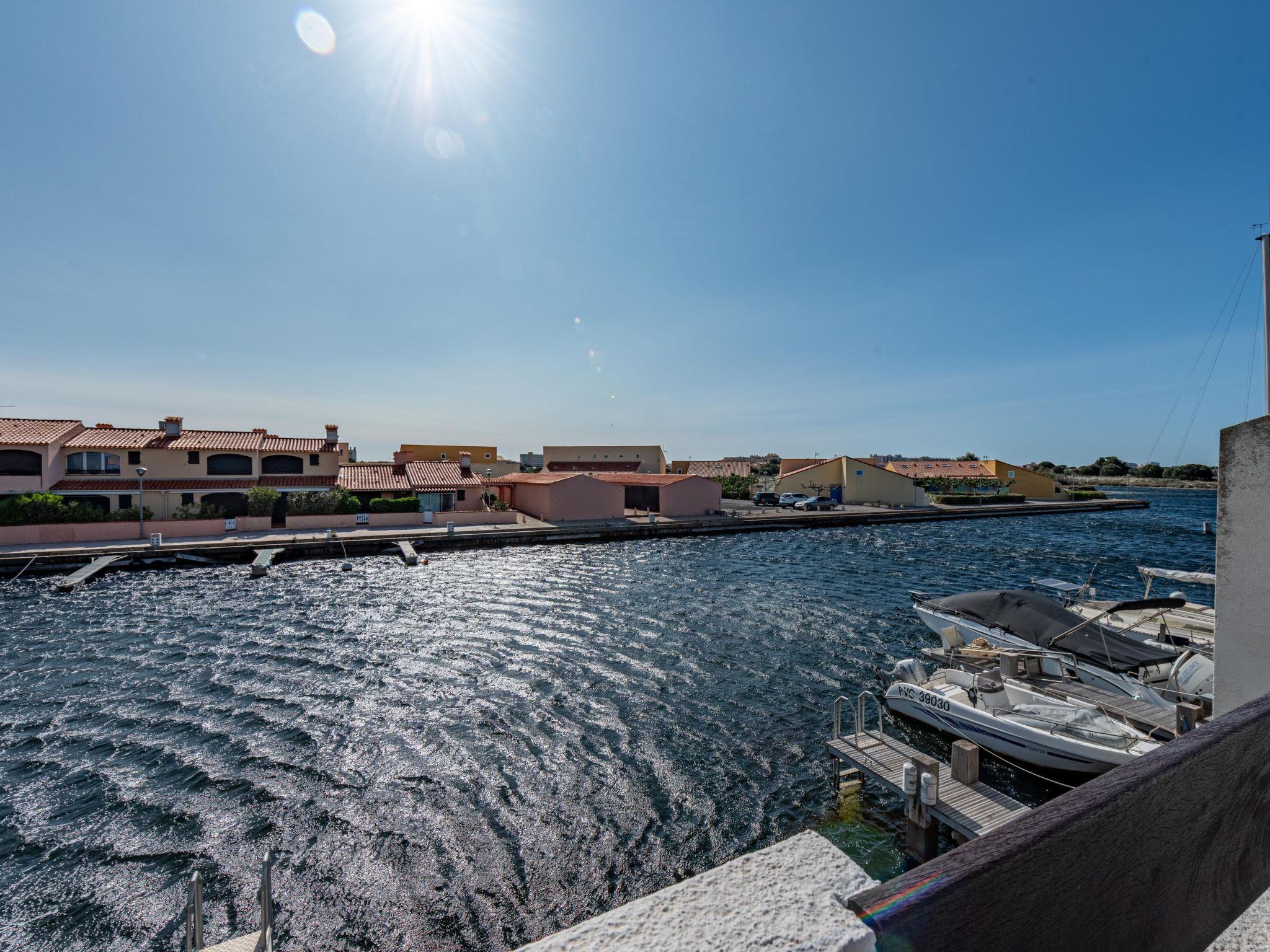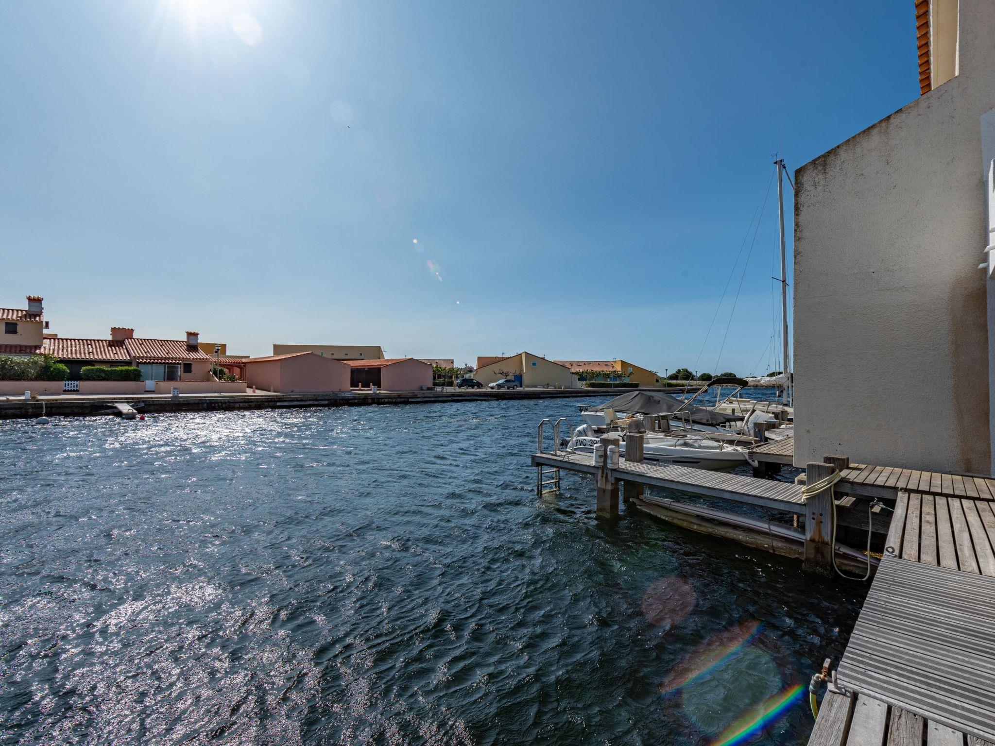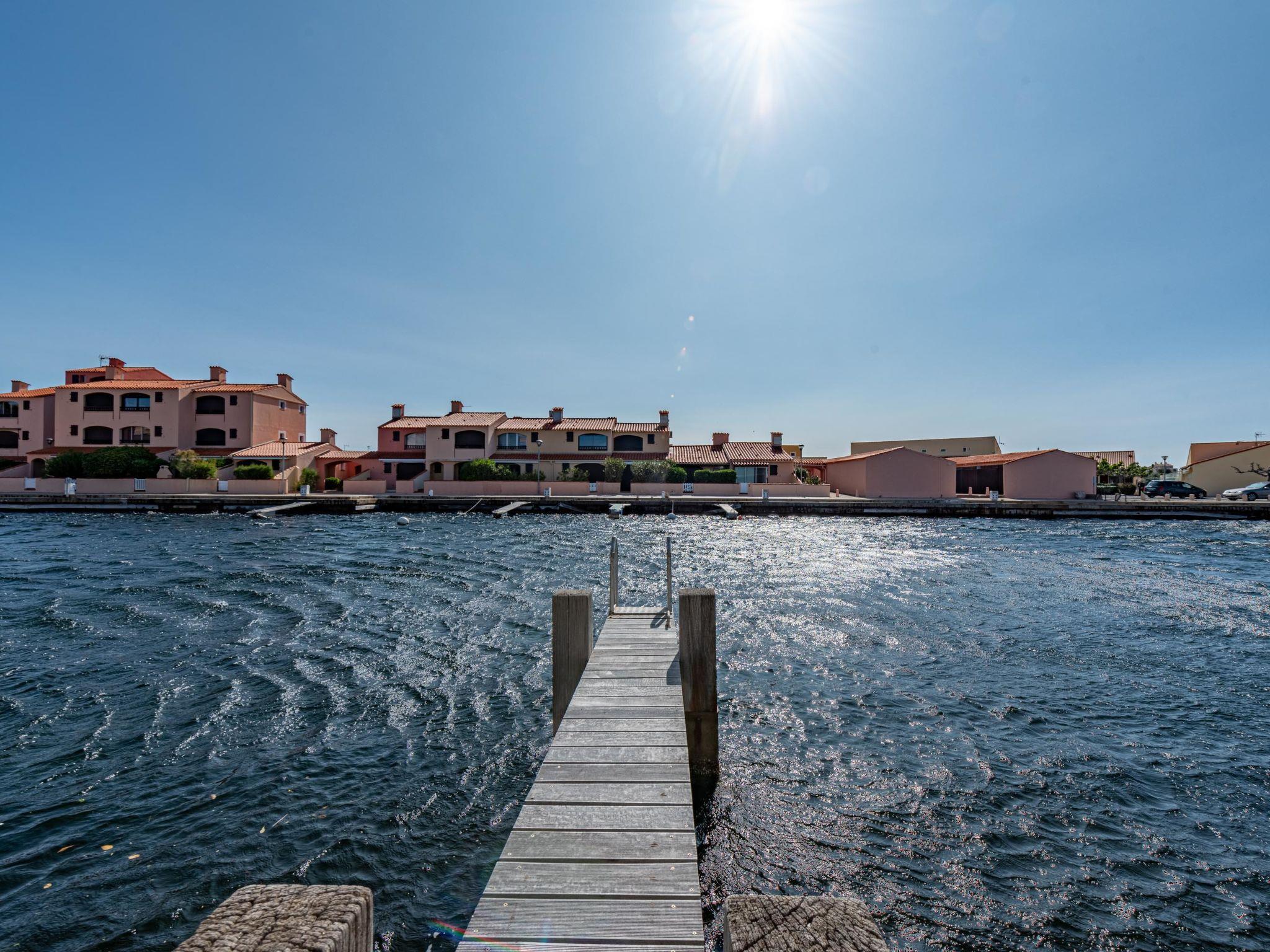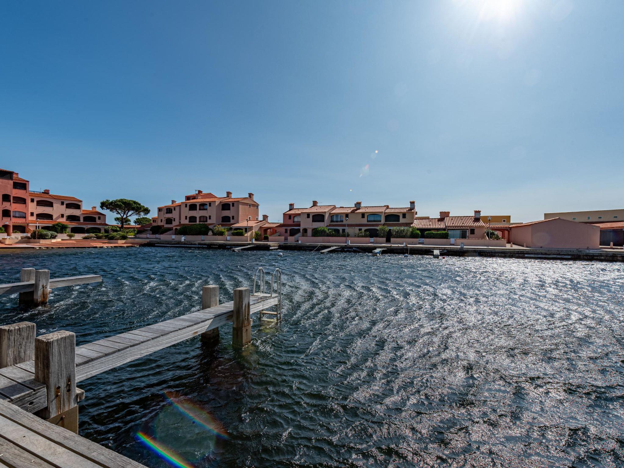 Residence "Les Brigantins". On the outskirts, 3 km from the sea, 50 m from the lake, 3 km from the beach, in a cul-de-sac. For shared use: natural pond, public parking 80 m. Grocery 3 km, supermarket 5 km, shopping centre 4 km, restaurant 2 km, bar 2 km, bakery 3 km, bus stop "Le Barcarès" 600 m, railway station "La Franqui" 16 km, sandy beach 3 km, diving center 6 km, outdoor swimming pool 4 km, nudist beach 5 km. Sports harbour 7 km, surf school 1 km, sailing school 3 km, tennis 3 km, minigolf 5 km, riding stable 9 km. Nearby attractions: Aqualand Port Leucate 7 km, Réserve Africaine de Sigean 41 km, Fort de Salses 20 km, Narbonne 55 km, Perpignan 25 km, Barcelone 215 km. Well-known lakes can easily be reached: Etang de Leucate ou Salses 7 km, Lac de Villeneuve de La Raho 28 km. Hiking paths: Sentier du guetteur 8 km, Station meteorologique de Opoul Perillos 25 km, Sentier du littoral Collioure 40 km. Please note: car recommended. Residence with electric gates. The photograph shows a typical example. Additional accommodations can be booked. Protection barrier on the pontoon.