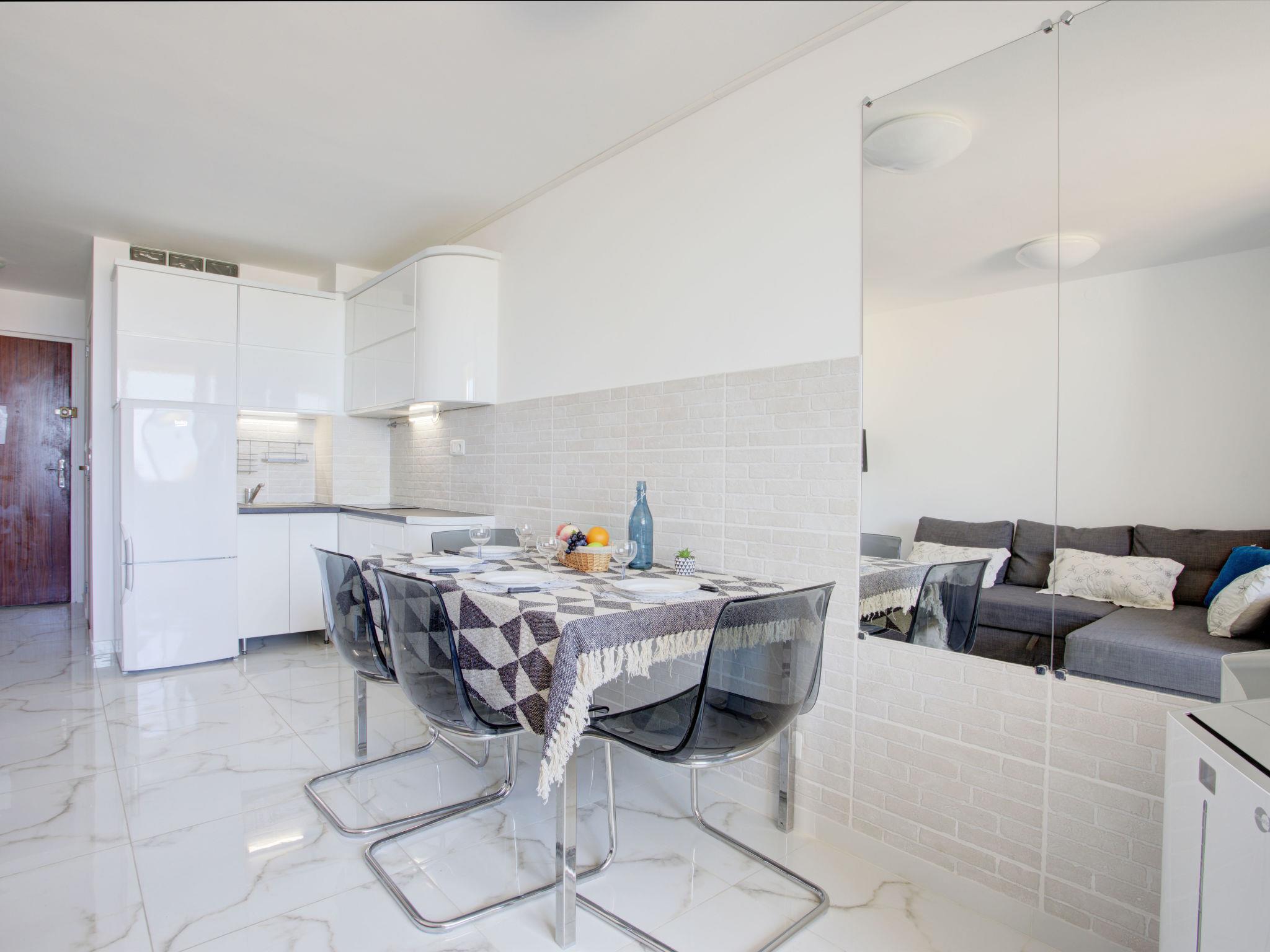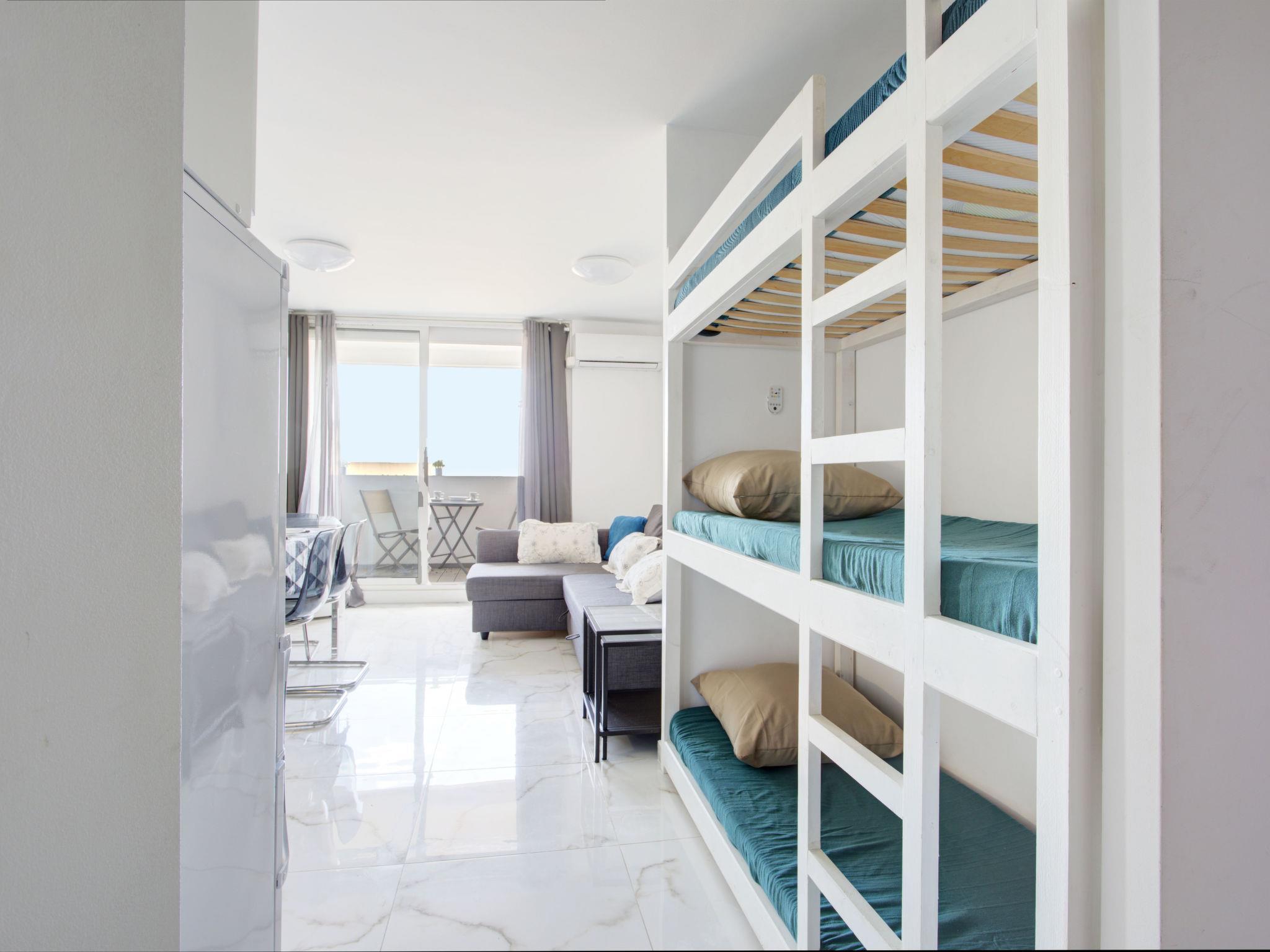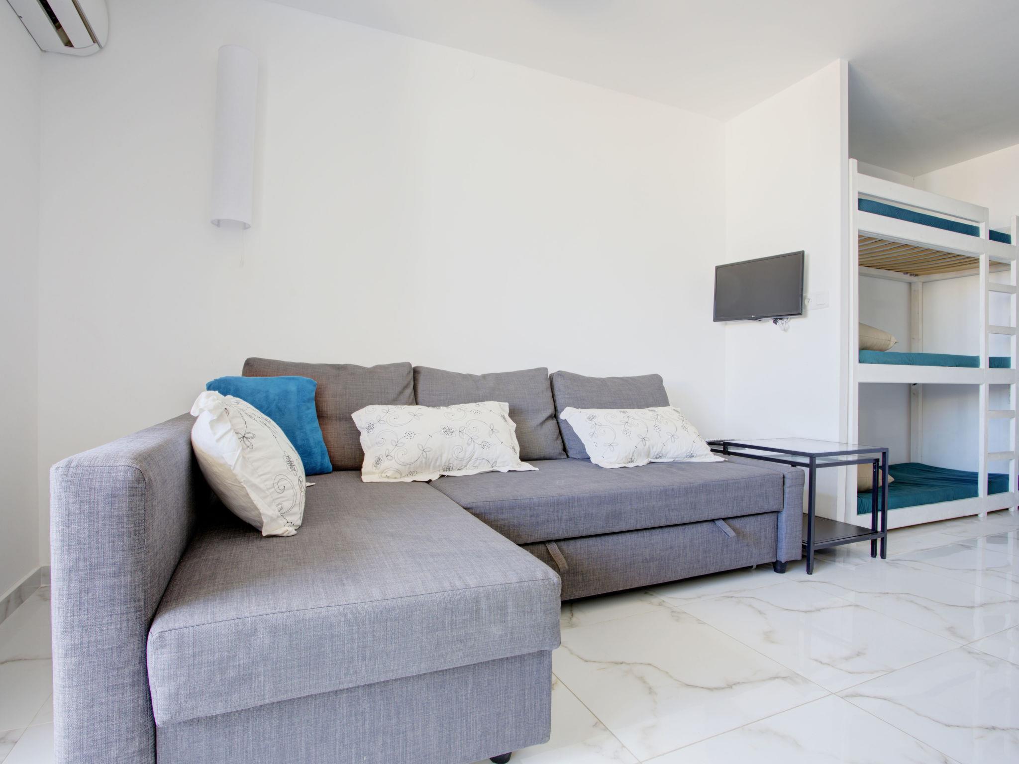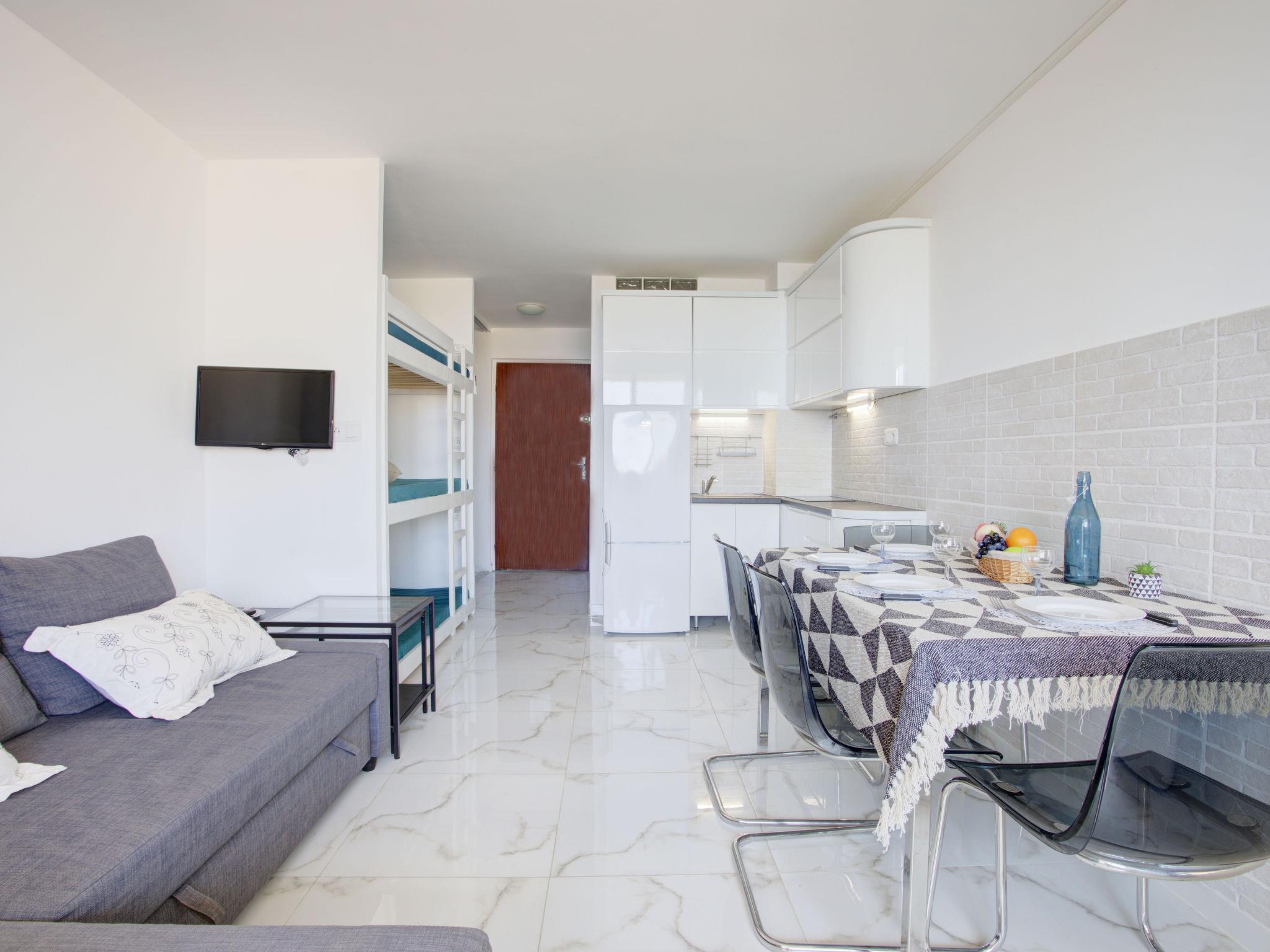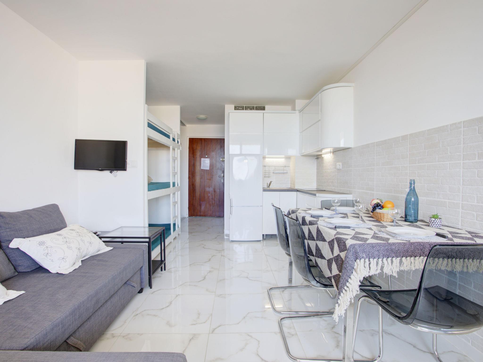 1-room studio 20 m2. Living/dining room with 1 sofabed (140 cm, length 190 cm), 1 x 3 bunk beds (90 cm, length 190 cm), TV. Exit to the terrace. Kitchenette (2 ceramic glass hob hotplates, microwave, electric coffee machine). Shower/WC. No heating option. Terrace. Terrace furniture. View of the sea. Facilities: Internet (WiFi, free). Parking. Please note: smoke alarm.