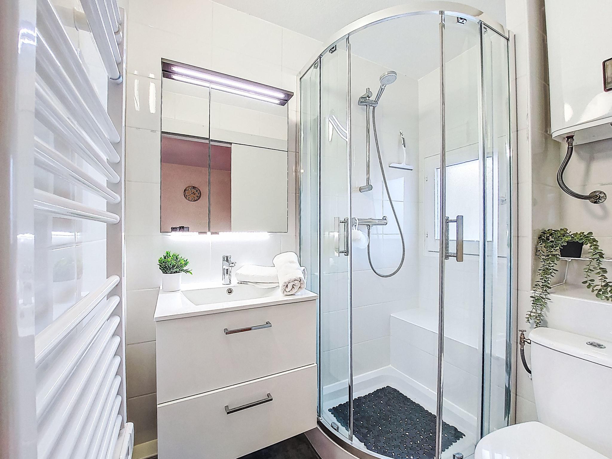 2-room apartment 27 m2 on 2nd floor. Living/dining room with 1 sofabed (140 cm, length 190 cm), TV (flat screen), electric heating and air conditioning. Exit to the terrace. 1 room with 1 french bed (1 x 140 cm, length 190 cm). Kitchenette (4 ceramic glass hob hotplates, toaster, kettle, microwave, electric coffee machine). Shower/WC. Electric heating. Terrace 5 m2. Terrace furniture. Beautiful view of the sea. Facilities: washing machine, iron. Internet (WiFi, extra). Parking. Please note: non-smokers only. Smoke alarm.