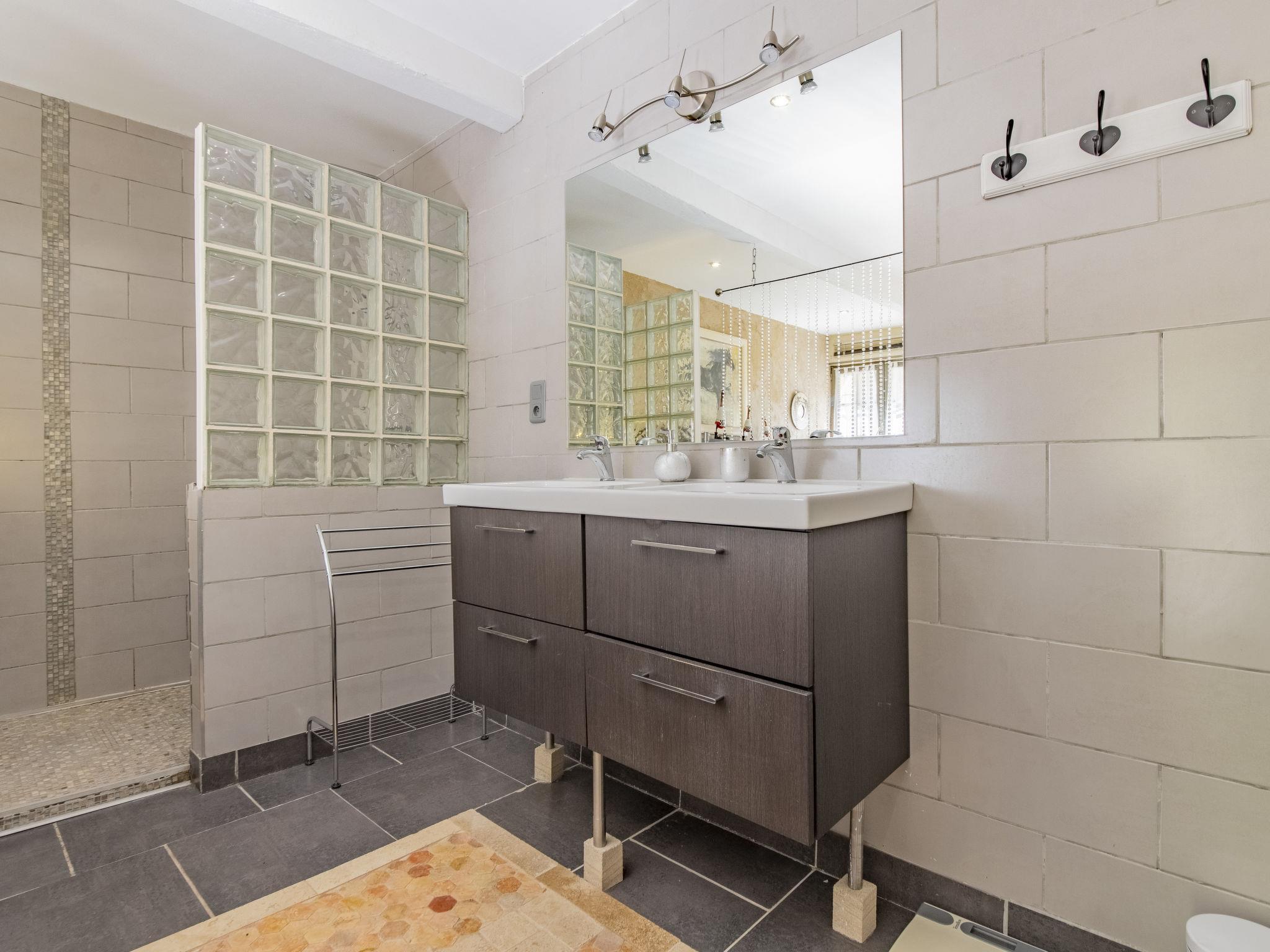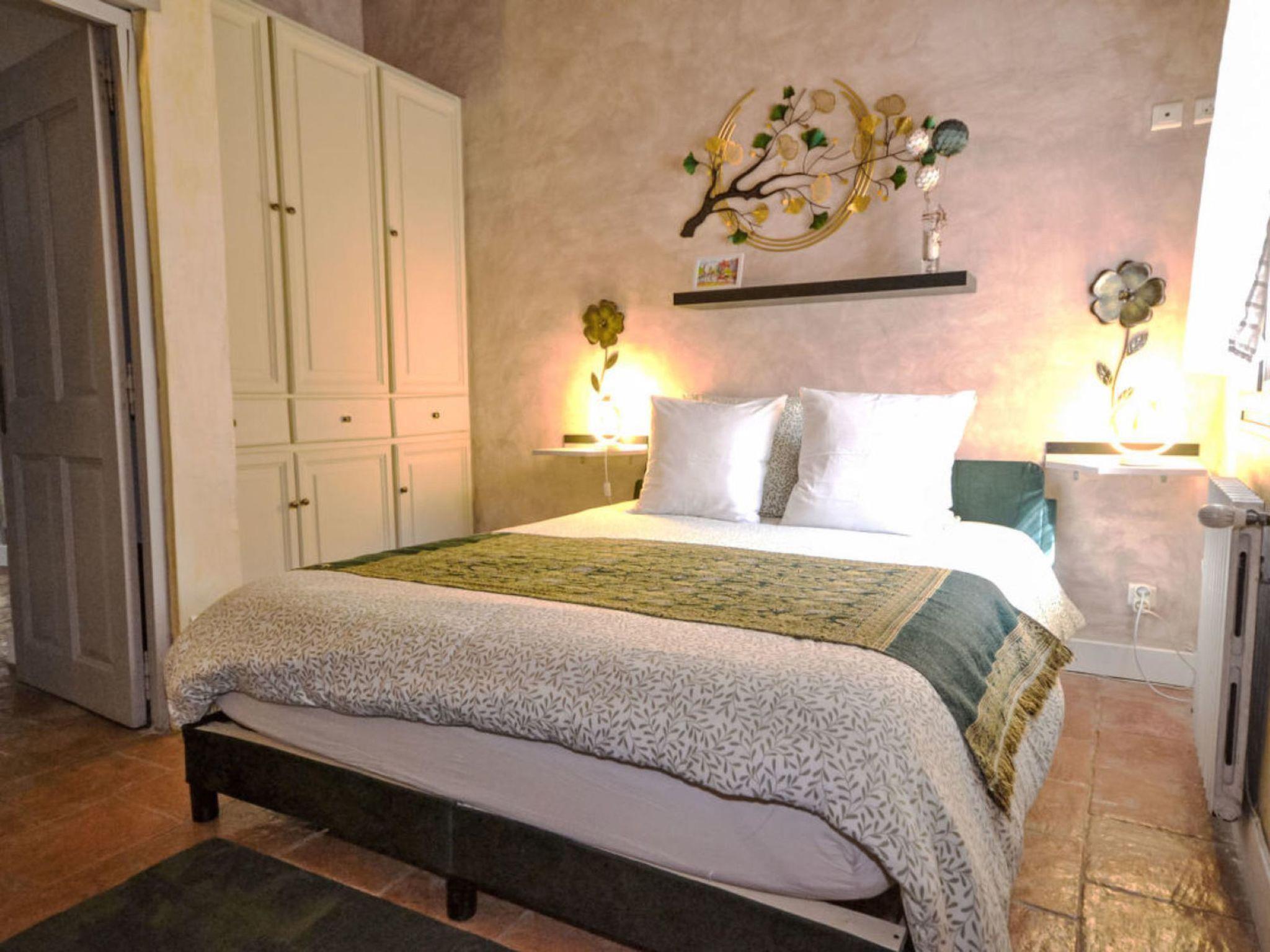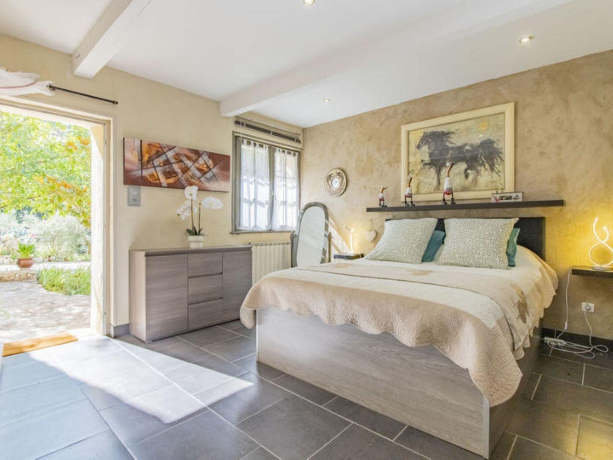 "L'Oliveraie", 5-room villa 250 m2 on 2 levels. Living/dining room 55 m2 with TV and flat screen. Exit to the garden. 1 room with 1 french bed (160 cm, length 200 cm), shower. Exit to the garden. 1 room with 1 french bed (160 cm, length 200 cm). Open kitchen (4 hot plates, oven, dishwasher, microwave, electric coffee machine, Capsules for coffee machine (Nespresso) extra). Shower, sep. WC. Heating. Upper floor: 1 room with 2 beds (90 cm), shower. 1 room with 1 french bed (160 cm, length 200 cm), TV (flat screen). Bath/shower, sep. WC. Garden. Terrace furniture. Facilities: washing machine, iron, children's high chair, baby cot for up to 2 year olds, hair dryer. Internet (WiFi, free). Parking (2 cars). Please note: suitable for families. Maximum 1 pet/ dog allowed. Smoke alarm, fire extinguisher. Please note: electric charging station 2km away in Caromb. No charging possible in the villa.