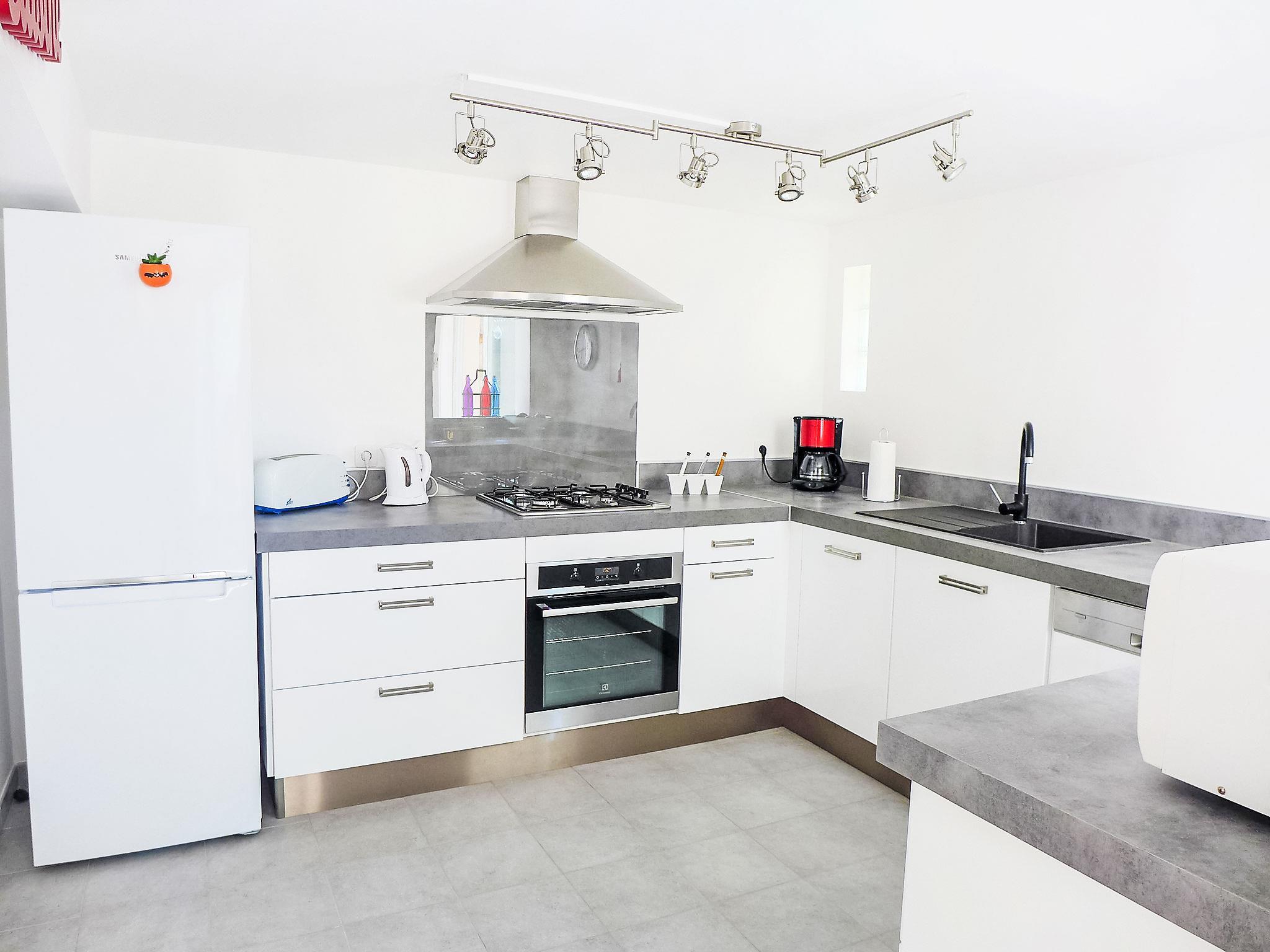 3-room apartment 85 m2, on the ground floor. Comfortable furnishings: living/dining room with 1 double sofabed (160 cm, length 190 cm), TV (flat screen). Exit to the terrace. 1 room with 1 french bed (140 cm, length 190 cm), TV (flat screen). 1 room, window onto the living room with 1 french bed (140 cm, length 190 cm). Open kitchen (4 hot plates, oven, dishwasher, microwave, freezer, electric coffee machine). Shower/WC. Electric heating. Terrace 60 m2, south facing position. Terrace furniture, barbecue, deck chairs. View of the valley. Facilities: washing machine, iron, baby cot for up to 2 year olds. Internet (WiFi, free). Please note: maximum 1 pet/ dog allowed. TV only FR. Smoke alarm. 83035 000022 KS