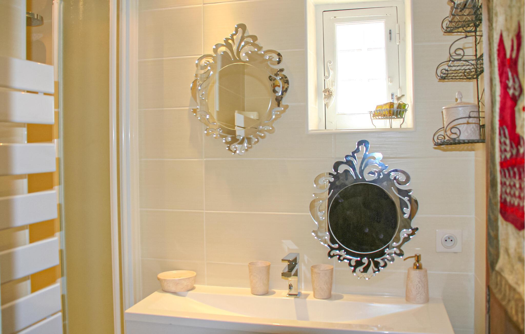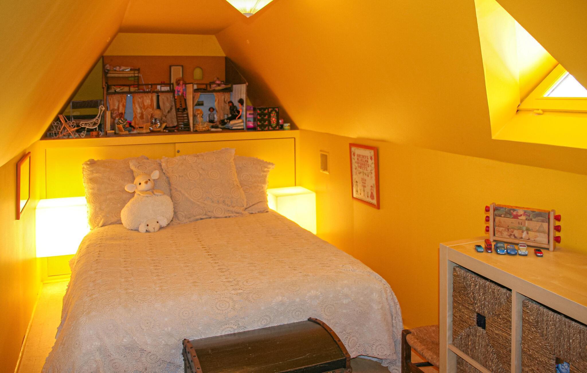 Diese Ferienunterkunft verfügt im Gartengeschoss über einen Wohnraum mit Wohnzimmer, geschlossenem Kamin, Küchenzeile und Essbereich. Außerdem gibt es ein Elternschlafzimmer mit Dusche und WC. Im Obergeschoss gibt es ein Kinderzimmer und ein kleines Zimmer mit Waschbecken, die jeweils ein Doppelbett haben und somit auch für größere Kinder geeignet sind. Alle unsere Zimmer sind klimatisiert.