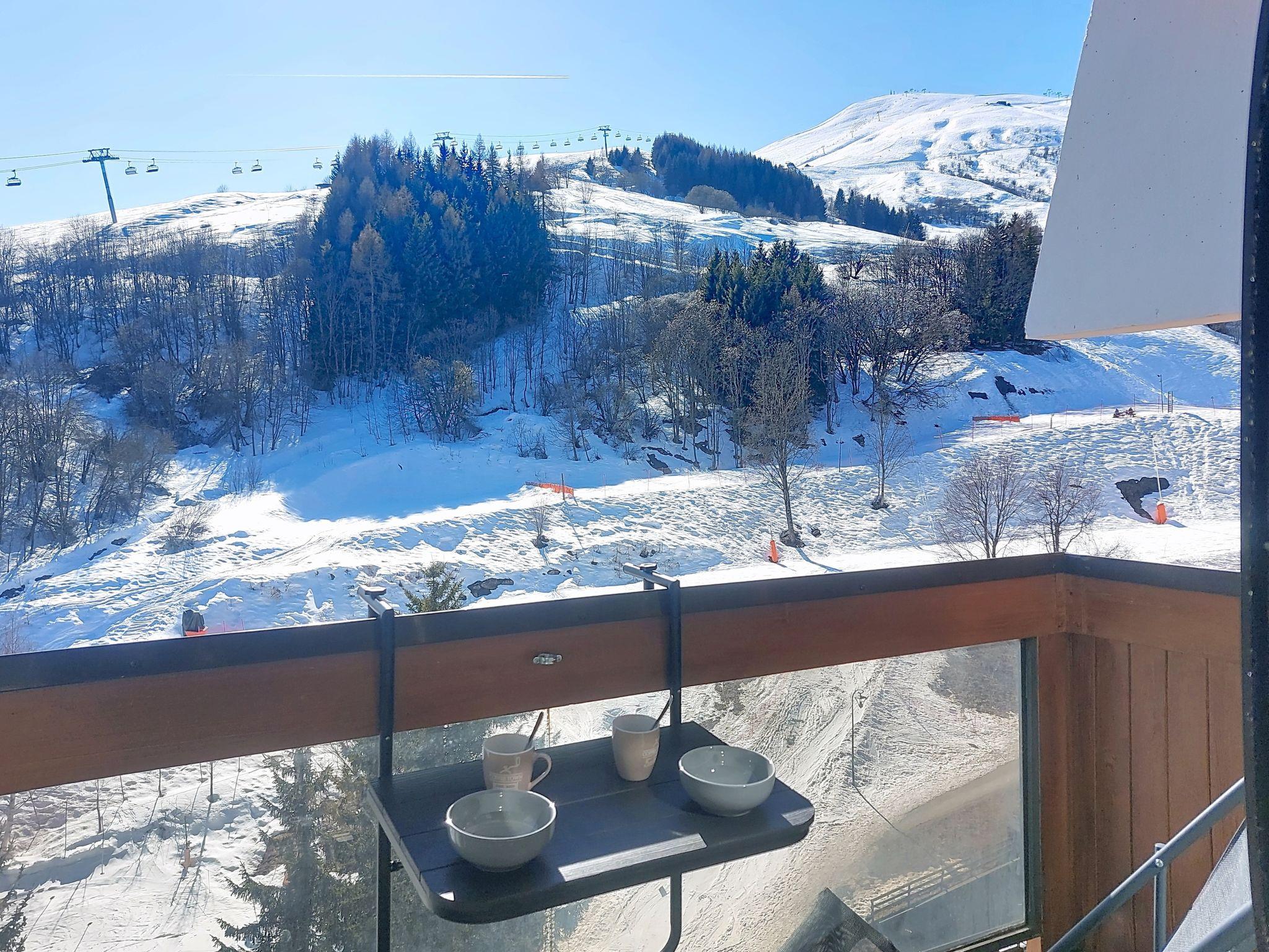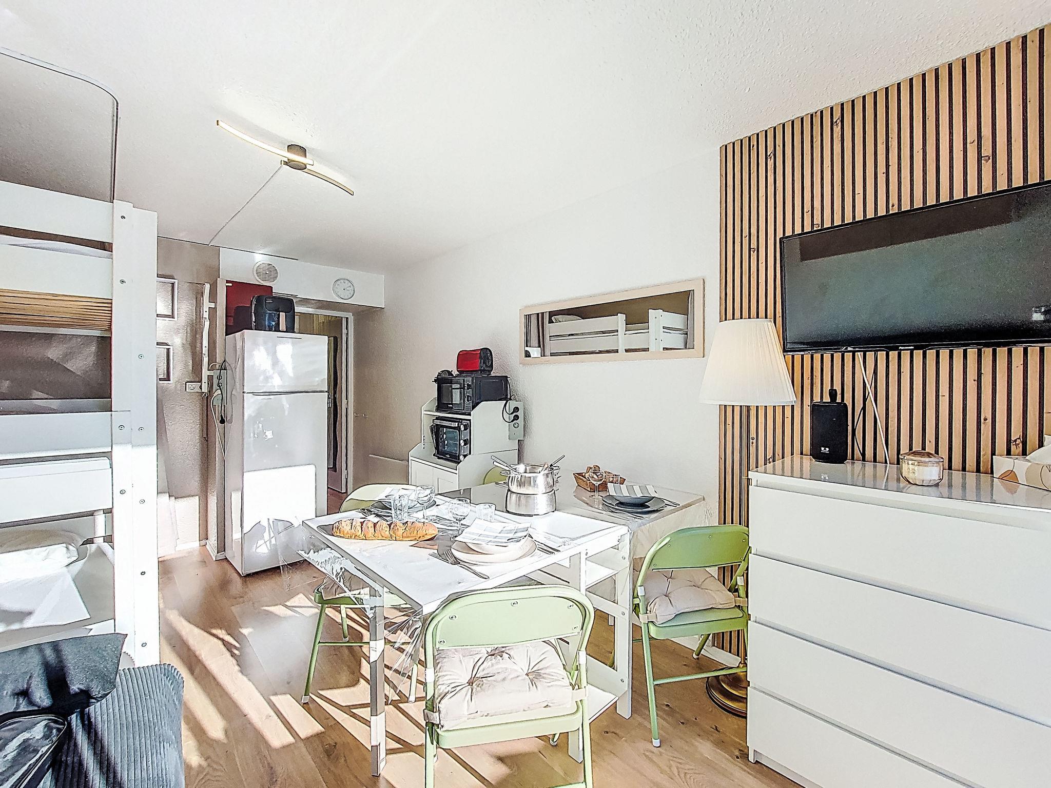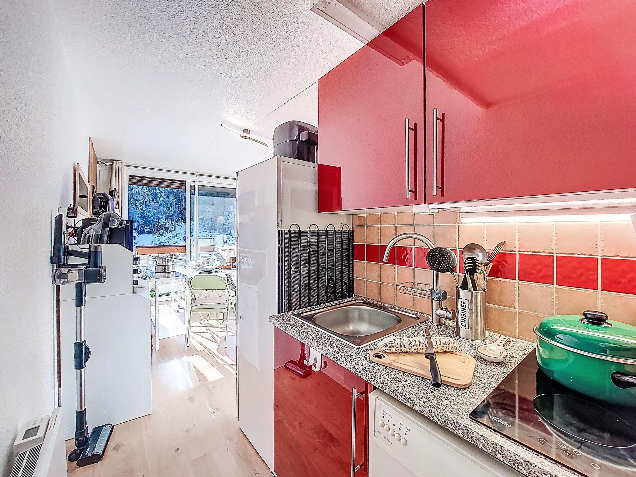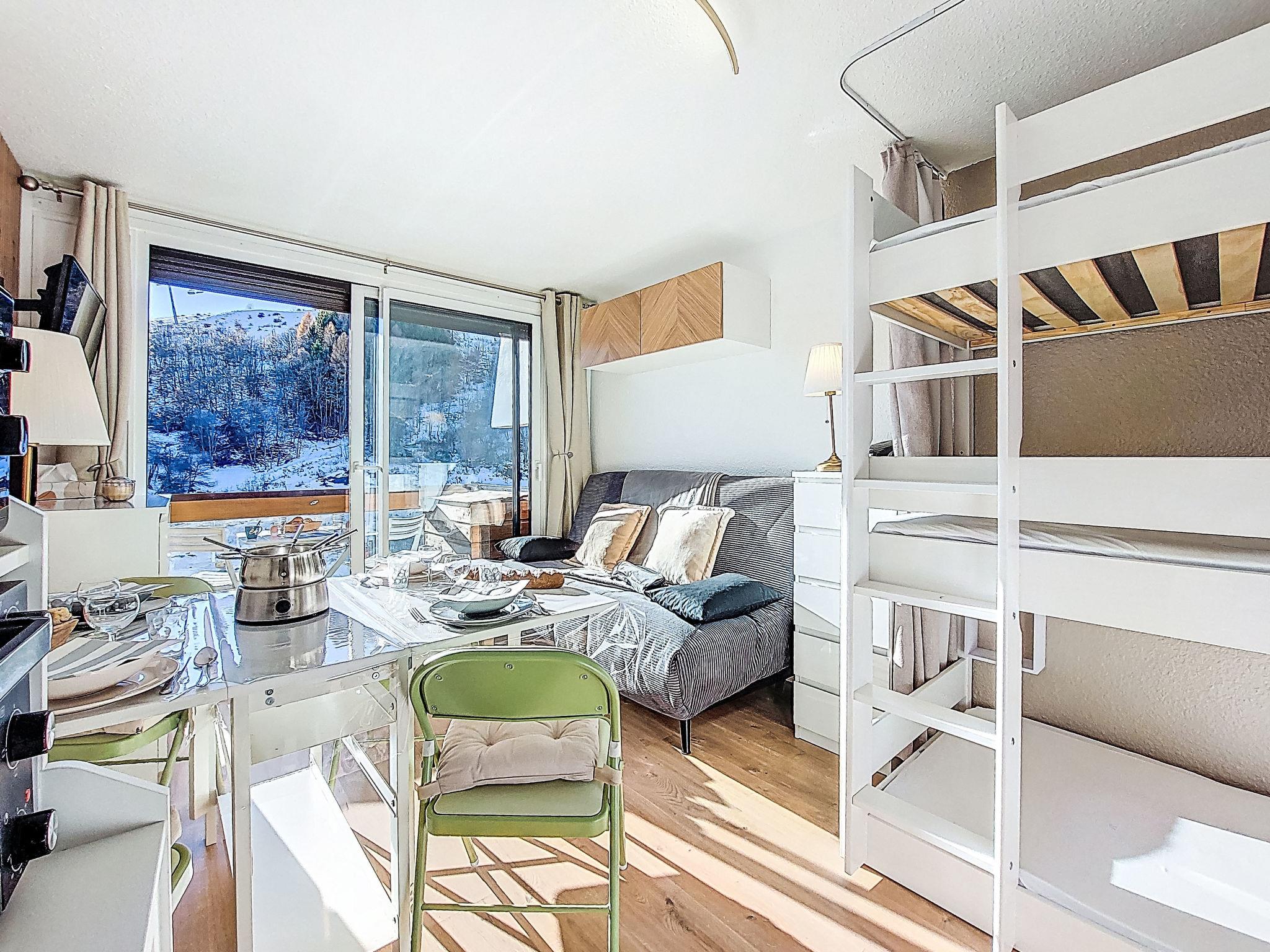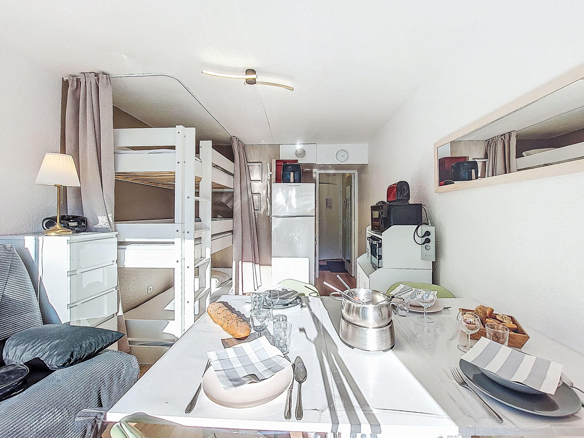1-room studio 22 m2 on 9th floor, south facing position. Beautiful and modern furnishings: living/dining room with 1 double sofabed (140 cm, length 190 cm), 1 x 2 bunk beds (90 cm, length 190 cm), TV. Exit to the balcony, south facing position. Small kitchen (mini-oven, oven, dishwasher, 2 induction hot plates, kettle, microwave, freezer, electric coffee machine, Capsules for coffee machine (Dolce Gusto) extra, raclette grill). Bath/WC. Electric heating. Balcony 4 m2, south facing position. Balcony furniture, deck chairs (2). View of the ski run. Facilities: washing machine, iron, hair dryer. Internet (WiFi, extra). Please note: non-smokers only. Smoke alarm. Offer by a private individual according to Art. 155, IV of CGI.
