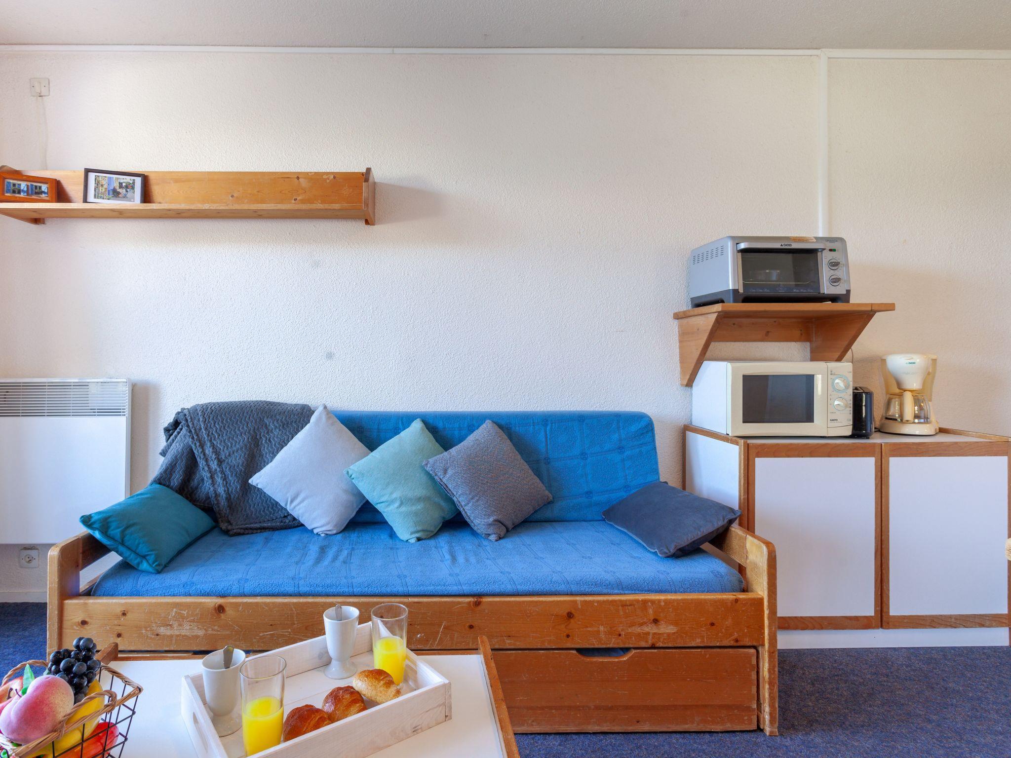 2-room apartment 32 m2 on 5th floor, north-west facing position. Simple furnishings: living/dining room with 1 pull-out bed (2 pers. 2 x 80 cm, length 190 cm), TV (flat screen). Exit to the balcony, north facing position. 1 room with 1 x 2 bunk beds (90 cm, length 190 cm). Exit to the balcony, west facing position. Kitchenette (2 hot plates, oven, toaster, kettle, microwave, electric coffee machine). Bathroom, sep. WC. Electric heating. Carpet. 2 balconies 3 m2, north facing position and west facing position. View of the valley. Facilities: hair dryer. Internet (WiFi, extra). Please note: maximum 1 pet/ dog allowed. Smoke alarm. Offer by a private individual according to Art. 155, IV of CGI.