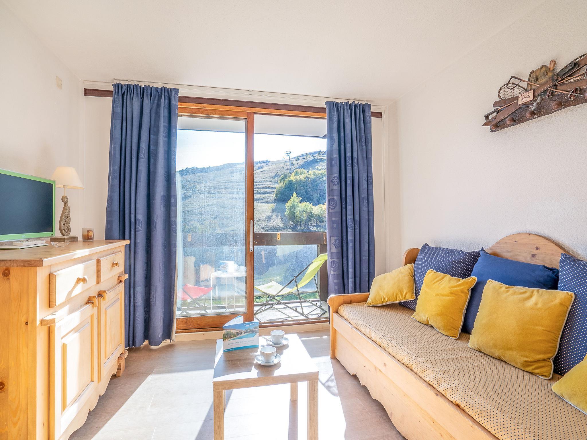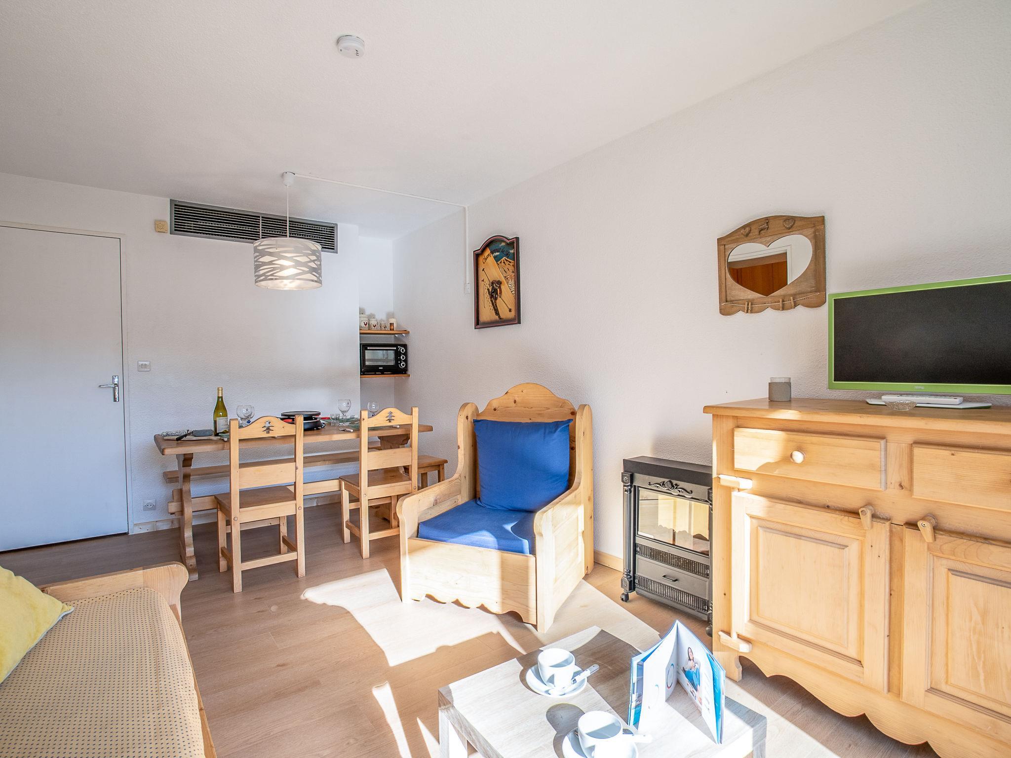 1-room studio 28 m2 on 14th floor, south facing position. Comfortable and beautiful furnishings: living/dining room with 1 pull-out bed (2 pers. 2 x 80 cm, length 190 cm), TV (flat screen). Exit to the balcony, south facing position. Alcove with curtain with 1 double bed (140 cm, length 190 cm). Kitchenette (2 hot plates, mini-oven, dishwasher, toaster, kettle, microwave, freezer, electric coffee machine, Capsules for coffee machine (SENSEO), raclette grill). Bathroom, sep. WC, double hand-basin. Heating. Parquet floors. Balcony 4 m2, south facing position. Deck chairs (2). View of the ski run. Facilities: iron, hair dryer. Internet (WiFi, extra). Please note: non-smokers only. Maximum 1 pet/ dog allowed. Smoke alarm. Instead of an enclosed bedroom, some sleeping areas are located in an open-plan area (gallery, alcove, etc.). Offer by a private individual according to Art. 155, IV of CGI.