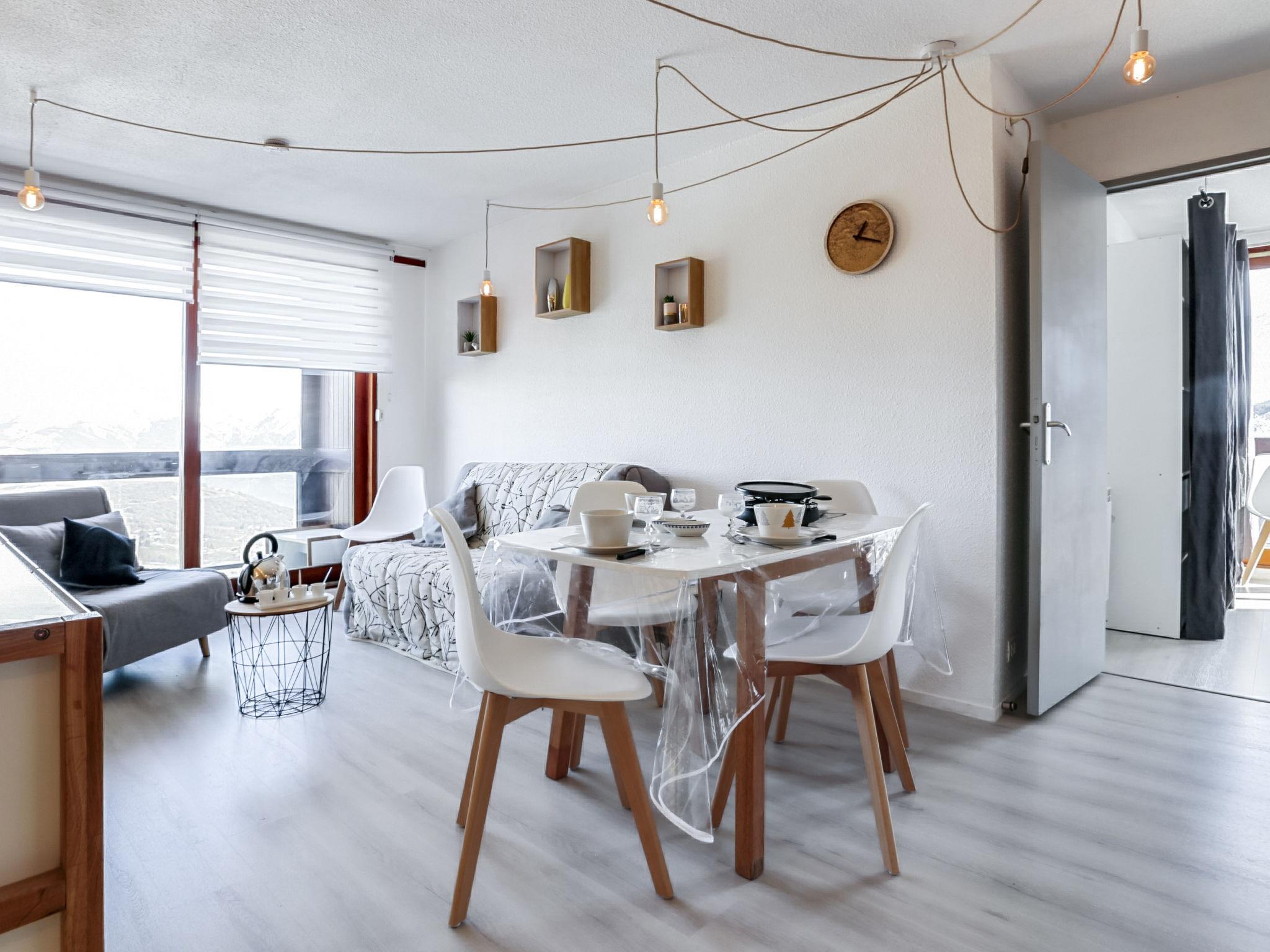 2-room apartment 33 m2 on 17th floor, north facing position. Fully renovated in 2019, modern furnishings: living/dining room with 1 double sofabed (140 cm, length 190 cm), flat screen. Exit to the balcony, north facing position. 1 room with 1 x 1 bunk beds (90 cm, length 190 cm), 1 french bed (140 cm, length 190 cm), radio and electric shutters. Exit to the balcony, east facing position. Kitchen-/living room (dishwasher, 2 induction hot plates, toaster, kettle, freezer, electric coffee machine, raclette grill, combination microwave). Bathroom, sep. WC. Electric heating. Parquet floors. Balcony 4 m2, north facing position, balcony 5 m2, east facing position. Balcony furniture, deck chairs (2). View of the mountains. Facilities: iron, hair dryer. Internet (WiFi, extra). Please note: non-smokers only. Smoke alarm. Offer by a private individual according to Art. 155, IV of CGI.