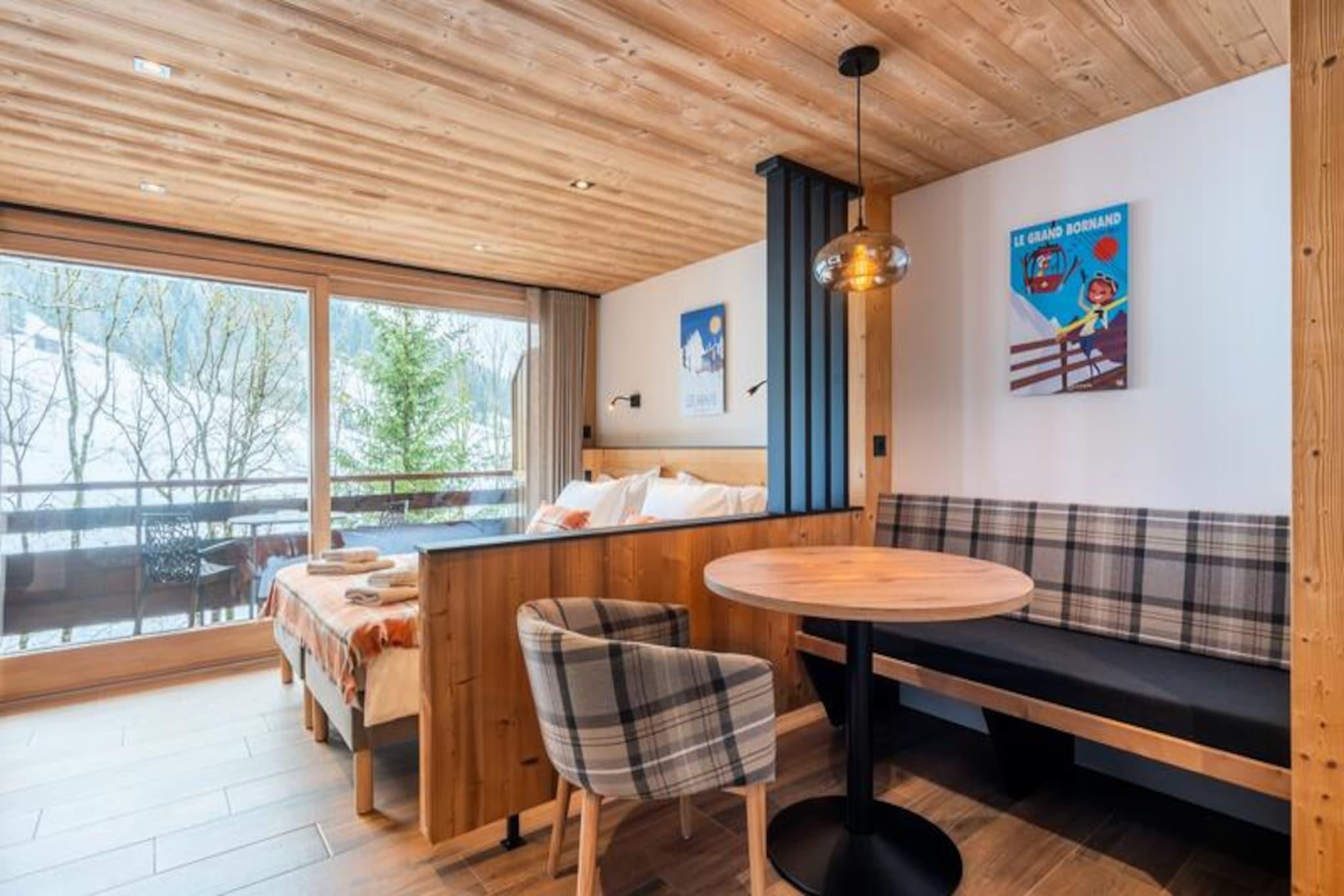 In the picturesque village of Le Grand-Bornand, surrounded by the majestic peaks of the Aravis range, this charming studio apartment offers a serene escape for couples seeking a cozy alpine retreat. The south-facing balcony invites you to bask in the sunlight while savoring panoramic views of the surrounding mountains, creating a perfect backdrop for your holiday. Whether you’re visiting for a winter ski adventure or a summer getaway, this property is designed to provide comfort and convenience in equal measure. \n\nThe 24 m² studio is thoughtfully arranged to maximize space and comfort, featuring a well-equipped kitchenette, a cozy sleeping area, and a bright living space that opens onto the balcony. Located on the first floor of a quiet residence, the apartment is ideal for unwinding after a day of exploring the nearby slopes or trails. Essential amenities such as parking, cleaning services, and provided linens ensure a hassle-free stay, allowing you to focus on enjoying your time in the Alps. \n\nPerfectly situated just 600 meters from both downhill and cross-country ski trails, the property offers easy access to outdoor adventures year-round. A free shuttle stop is conveniently located only 50 meters away, connecting you to the village center, which is just 1 kilometer from the residence. Here, you’ll find charming shops, restaurants, and local markets that showcase the region’s rich culinary traditions. For those arriving by bus, the station is only 1.2 kilometers away, making travel seamless. \n\nWhether you’re drawn to the thrill of skiing, the tranquility of mountain hikes, or simply the charm of Le Grand-Bornand’s alpine ambiance, this studio provides the perfect base for creating unforgettable memories in the heart of the French Alps.
