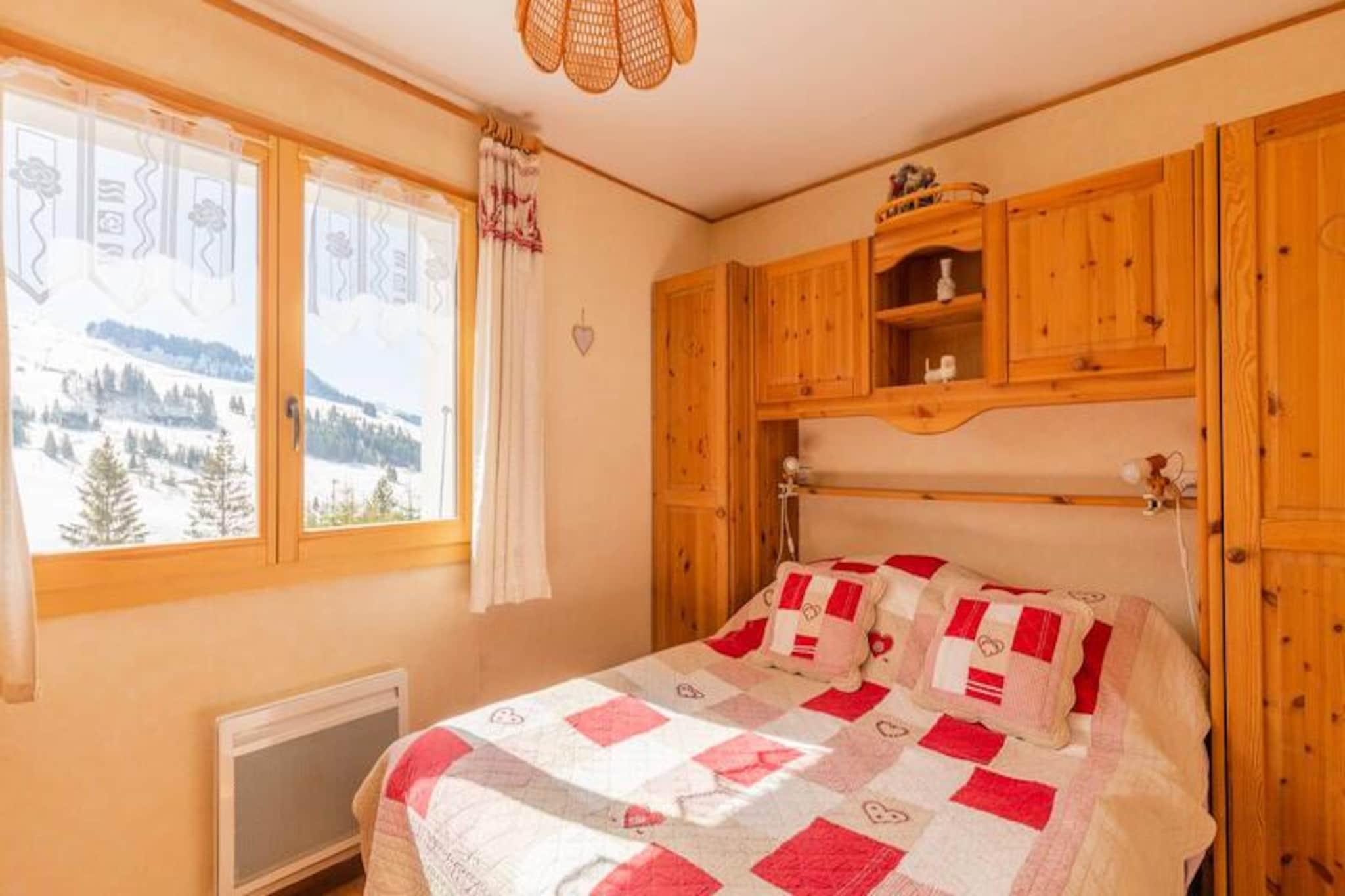 High above the valley, where the crisp alpine air invigorates your senses, this charming apartment offers a tranquil retreat with breathtaking panoramic views. Perfectly situated in the heart of the French Alps, this cozy 40 m² residence is designed for those seeking both relaxation and adventure. Whether you're gazing out from the spacious south-facing balcony or exploring the nearby slopes, every moment here feels like a celebration of nature's beauty. \n\nInside, the apartment comfortably accommodates up to five guests, making it ideal for families or small groups. The thoughtfully designed layout includes a warm and inviting living room with a double sofa bed, a fully equipped kitchen for preparing hearty meals, and a serene bedroom featuring a double bed. A mountain alcove with a fold-down single bed adds a touch of alpine charm, while the renovated shower room ensures modern comfort. Built-in closets and wardrobes in every room provide ample storage, and the private parking and free ski bus at the residence's doorstep make your stay hassle-free. \n\nBeyond the apartment, the region beckons with endless possibilities. From exhilarating ski runs to scenic hiking trails, the surrounding area offers activities for every season. The nearby village is alive with authentic French culture, offering delightful restaurants, shops, and après-ski options. In summer, the mountains transform into a haven for outdoor enthusiasts, with opportunities for paragliding, cycling, and exploring the pristine landscapes of the Tarentaise Valley. \n\nWhether you're here to carve through fresh powder or simply unwind amidst stunning alpine vistas, this apartment is your gateway to unforgettable memories in the French Alps.