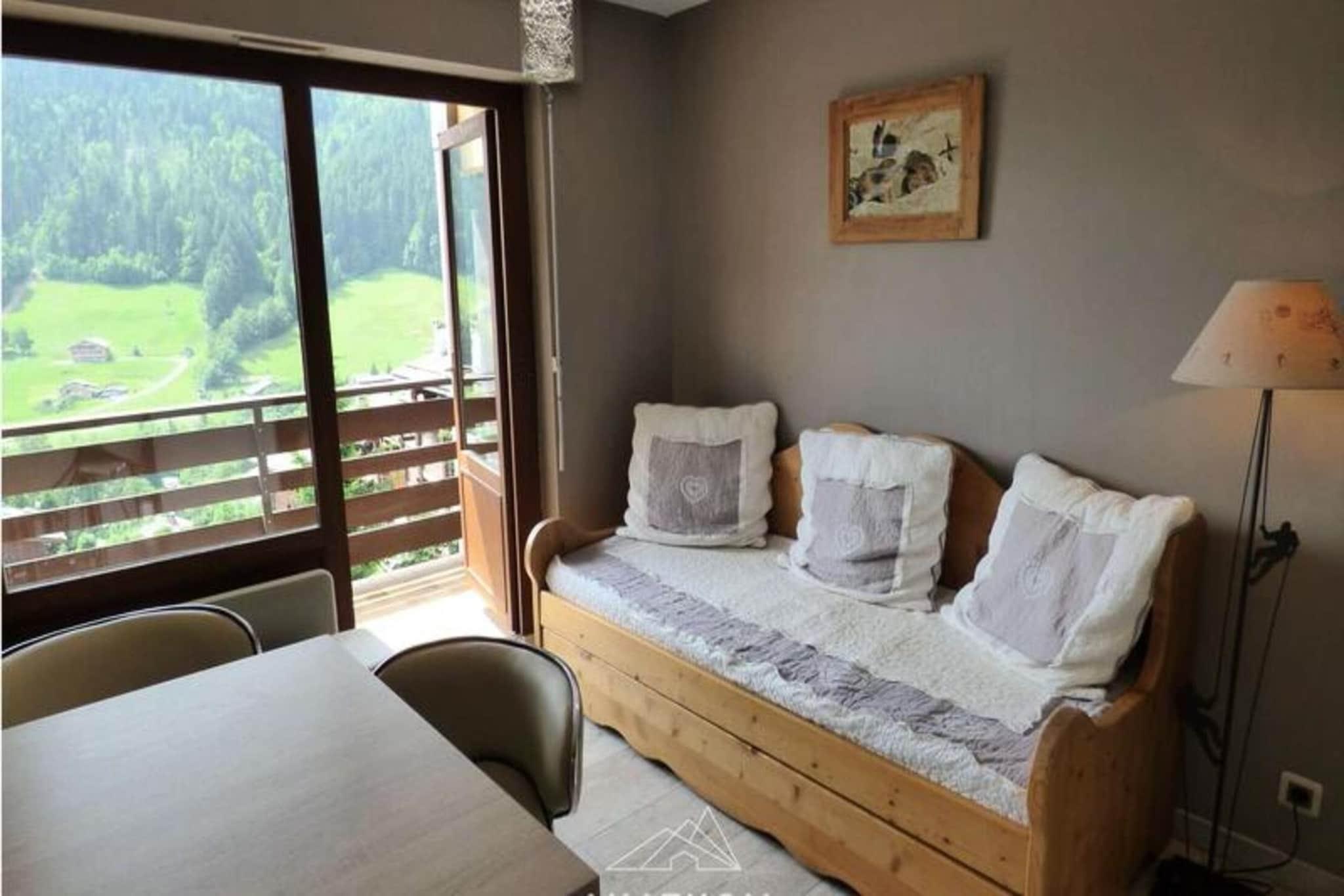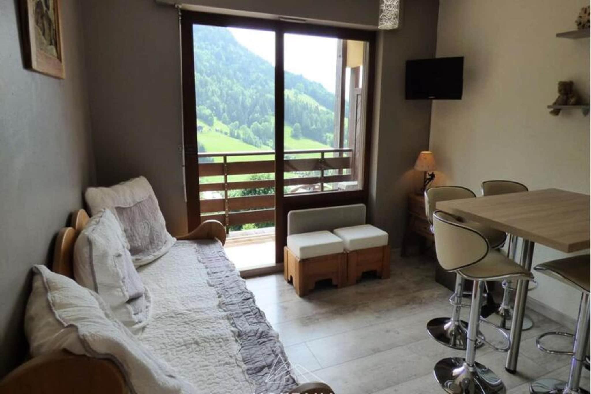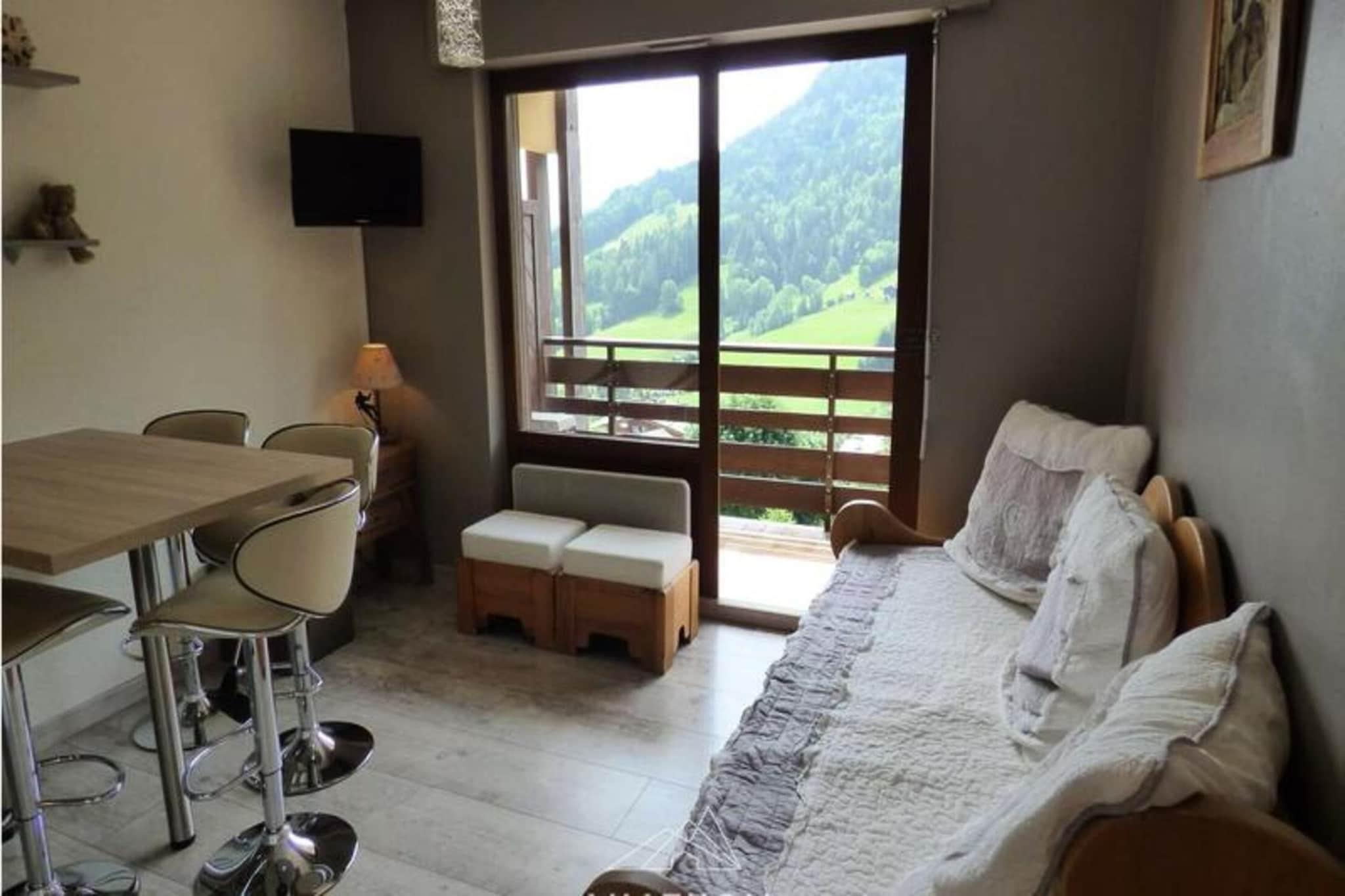 This beautifully renovated 20 m² studio is ideal for up to 4 people and is located in the Nant Robert area, just 5 minutes by car from the center of the village and shops. The apartment offers a south-west facing balcony with stunning views of the village and the surrounding Aravis mountain range. Inside, the studio features a double bed (140 cm) in the sleeping area, a living room with a 2x80 pull-out sofa, and a shower room with a WC. The apartment is situated on the first floor (fourth from the foot of the residence) and is rated 2 stars for 2 people. Guests can enjoy the peaceful setting and scenic views, while being close to the village amenities. Sheets and towels are not provided, and tourist taxes are payable for adults (18+ years). The property is conveniently located with easy access to transport links: Annecy SNCF train station is 32 km away, Geneva Airport is 52 km, and Lyon Airport is 155 km.