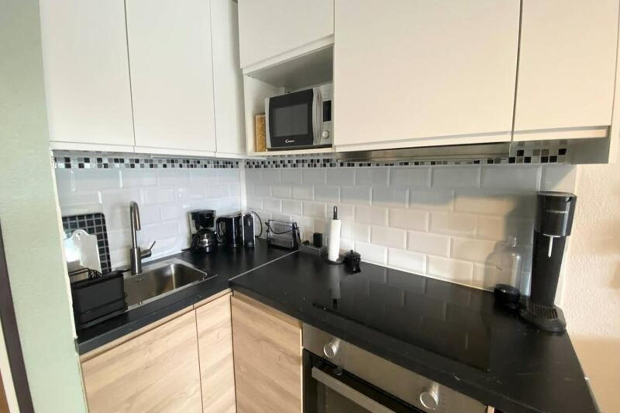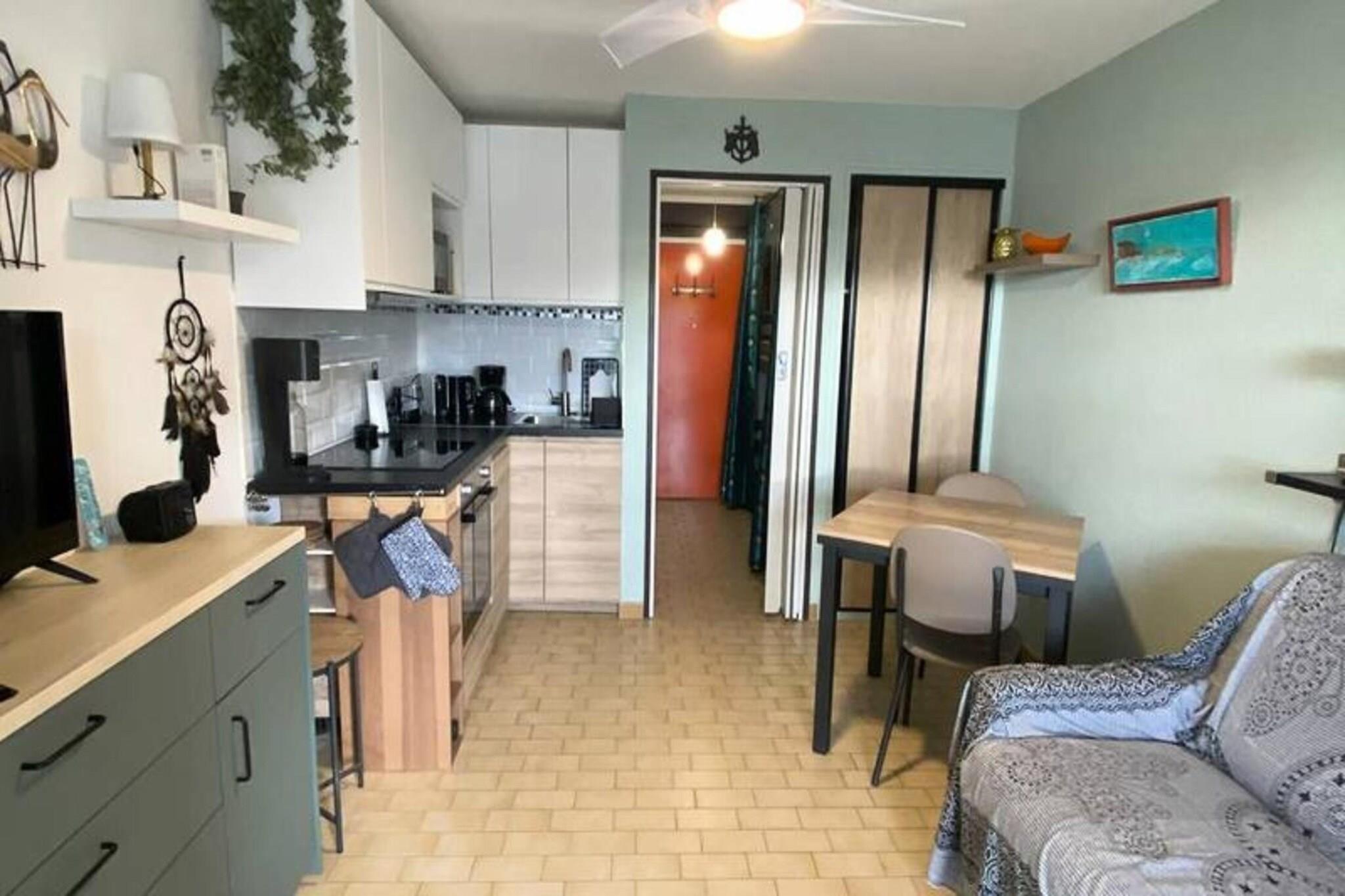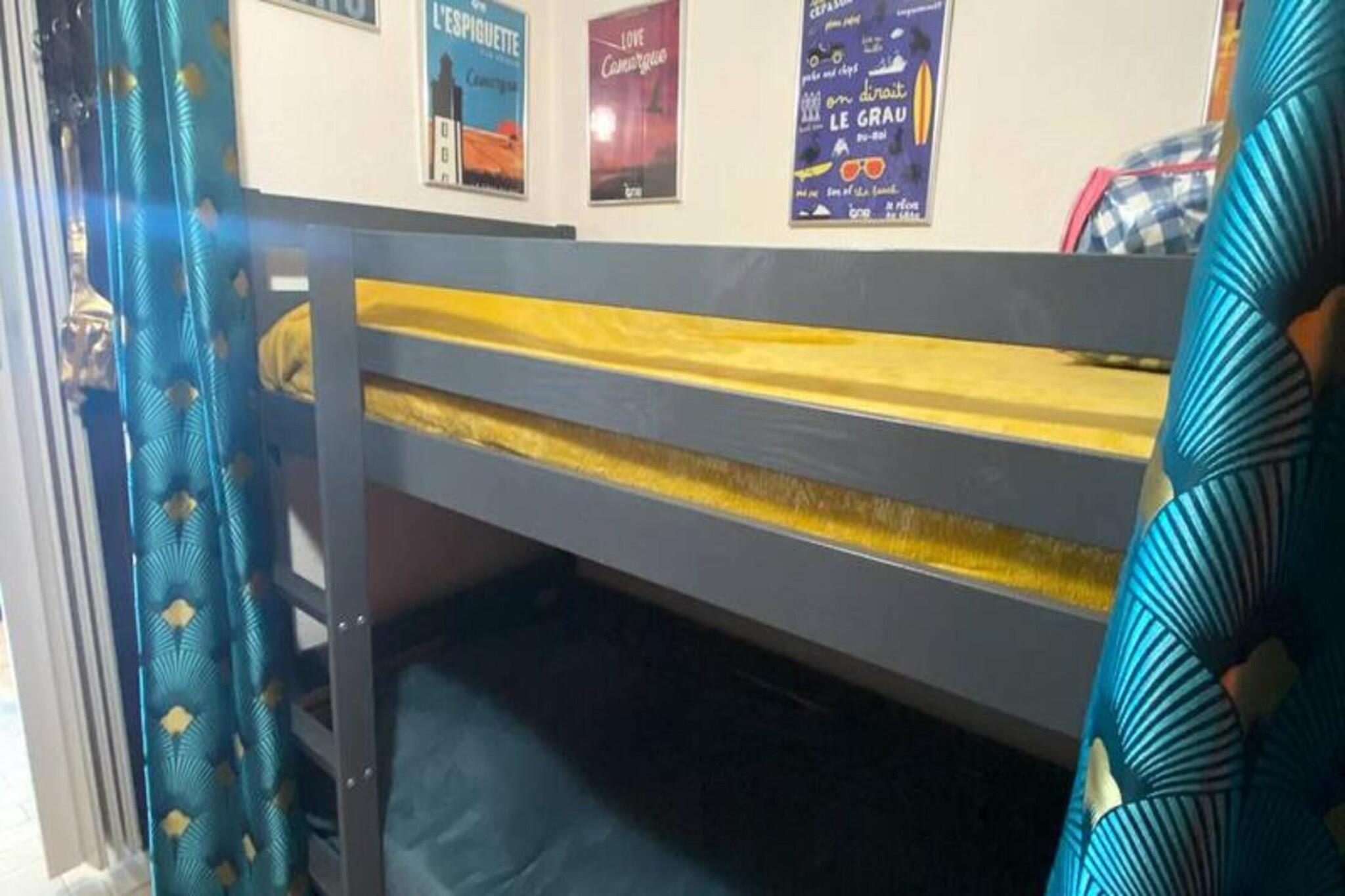 This 22m² studio cabin, located on the 2nd floor, offers a comfortable stay for up to 4 people. The living area includes a 140 cm sofa bed, TV, air conditioning, and Wi-Fi, creating a cozy space for relaxation. A cabin with 2 bunk beds (90 cm each) provides additional sleeping arrangements. The property is not pet-friendly, ensuring a peaceful environment for all guests. It opens onto a 5m² terrace with outdoor furniture and a barbecue, perfect for enjoying the fresh air. The apartment is ideally situated near local shops and the beach, just 200 meters away, making it easy to explore the surrounding area. Enjoy nearby cafes and markets, where you can indulge in local flavors and pick up essentials. Whether you're looking for a relaxing day at the beach or a stroll through the vibrant local area, this location offers the best of both worlds. The kitchen is fully equipped with modern amenities, including a microwave, oven, fridge/freezer, hob, and dishwasher, making meal preparation convenient. The bathroom is functional with a toilet, ensuring all basic needs are met. Private parking is available for added convenience, providing a secure spot for your vehicle.