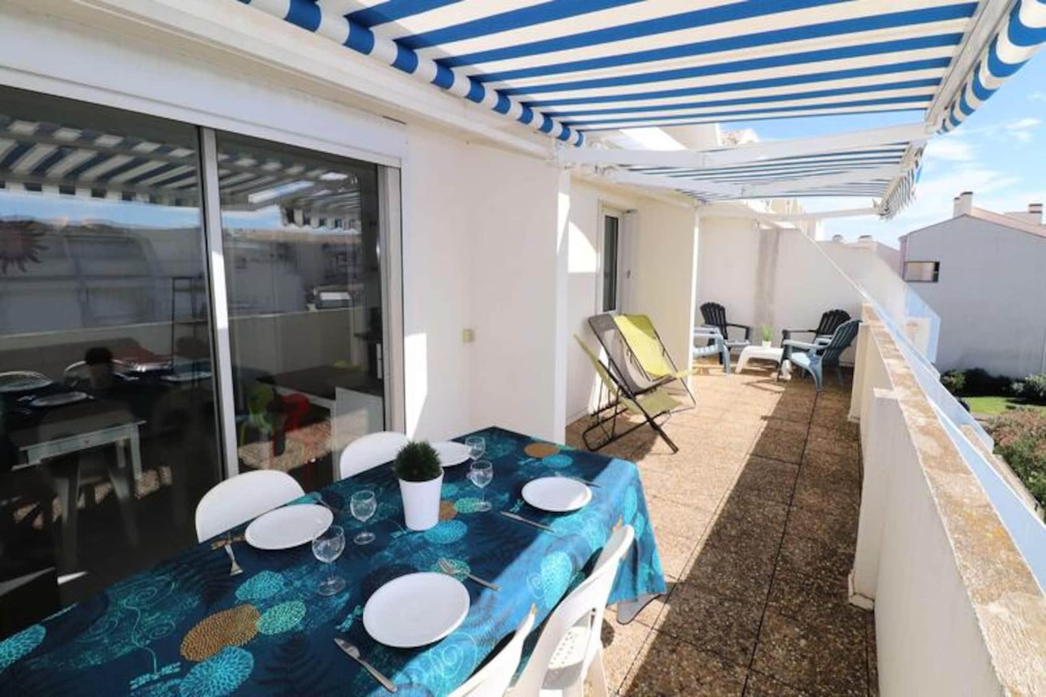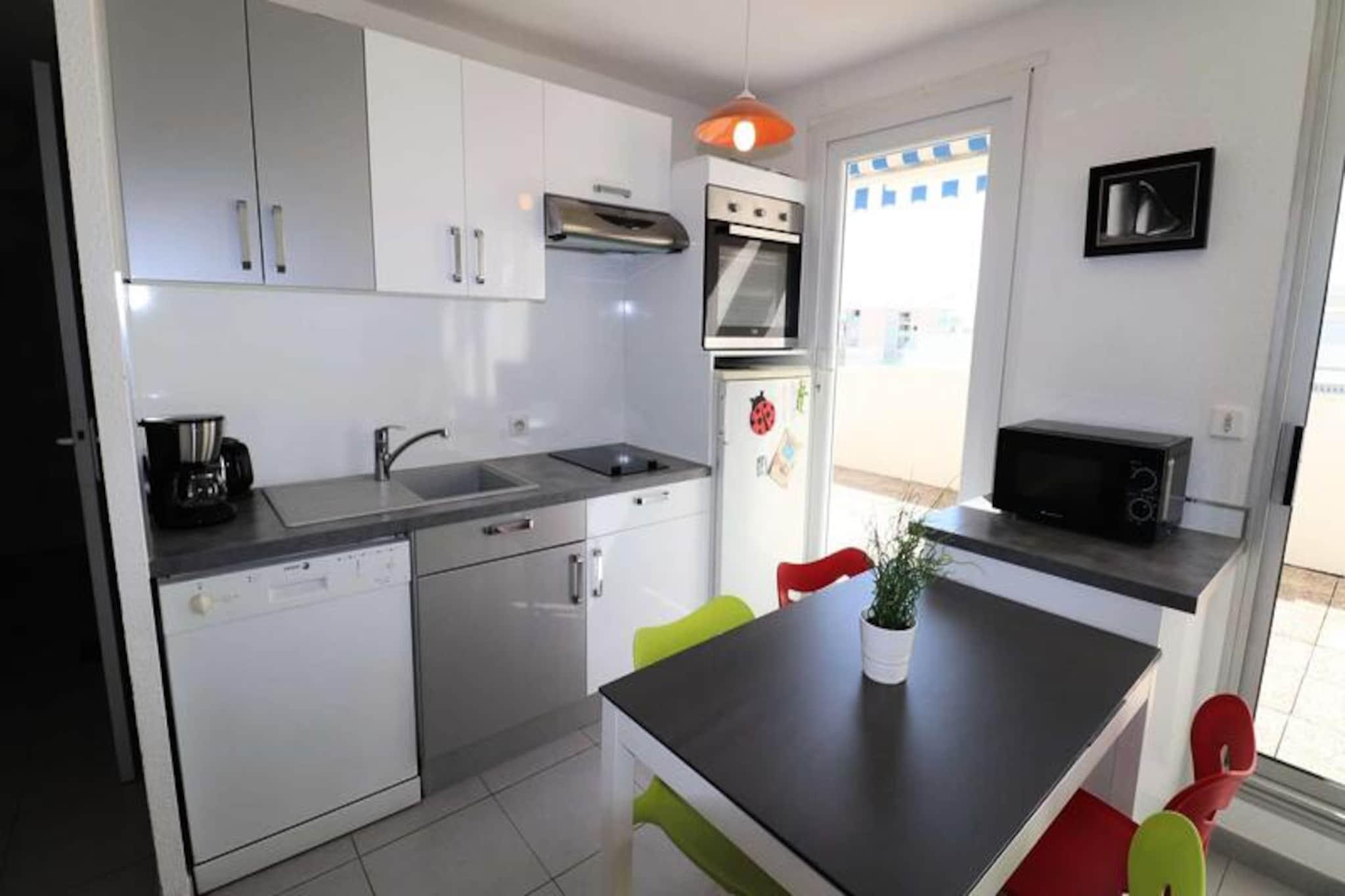 Bask in the Mediterranean charm of this delightful two-bedroom apartment, perfectly situated in the sought-after Floralies 2 Residence in Grau-du-Roi. Perched on the third and top floor, this bright and airy retreat boasts a spacious 23m² furnished terrace, inviting you to soak up the sun or enjoy al fresco dining under the southern skies. Whether you're savoring a morning coffee or unwinding after a day of exploration, the terrace offers a serene escape with views of the vibrant surroundings. Inside, the apartment is thoughtfully designed for comfort and convenience. The open-plan living area features a fully equipped kitchen with modern appliances, including a dishwasher, washing machine, oven, and microwave, making meal preparation a breeze. The sleeping arrangements are perfect for families or friends, with one cozy bedroom offering a double bed and another with two single beds. A sleek bathroom with a walk-in shower and a separate toilet add to the ease of your stay. The residence itself is a haven of leisure, offering access to swimming pools, pétanque courts, and a children’s playground. Just a short stroll away, you’ll find the golden sands of the beach, bustling shops, the charming town center, and the lively port. Private underground parking ensures a stress-free arrival and departure, while optional services like WiFi and linen rentals cater to your every need. Whether you’re here to relax by the pool, explore the natural beauty of the Camargue region, or indulge in the local cuisine, this apartment is your gateway to an unforgettable holiday. Experience the perfect blend of comfort, convenience, and coastal allure in Grau-du-Roi.