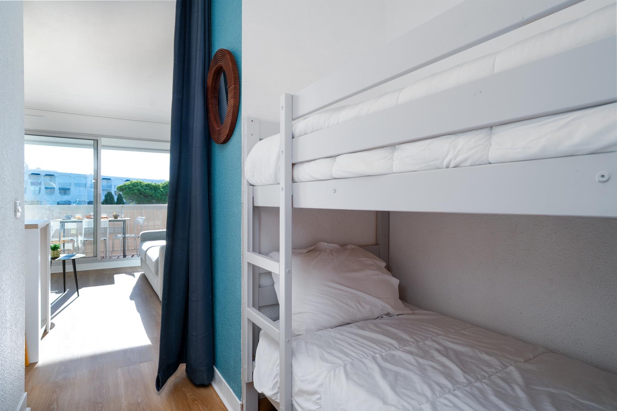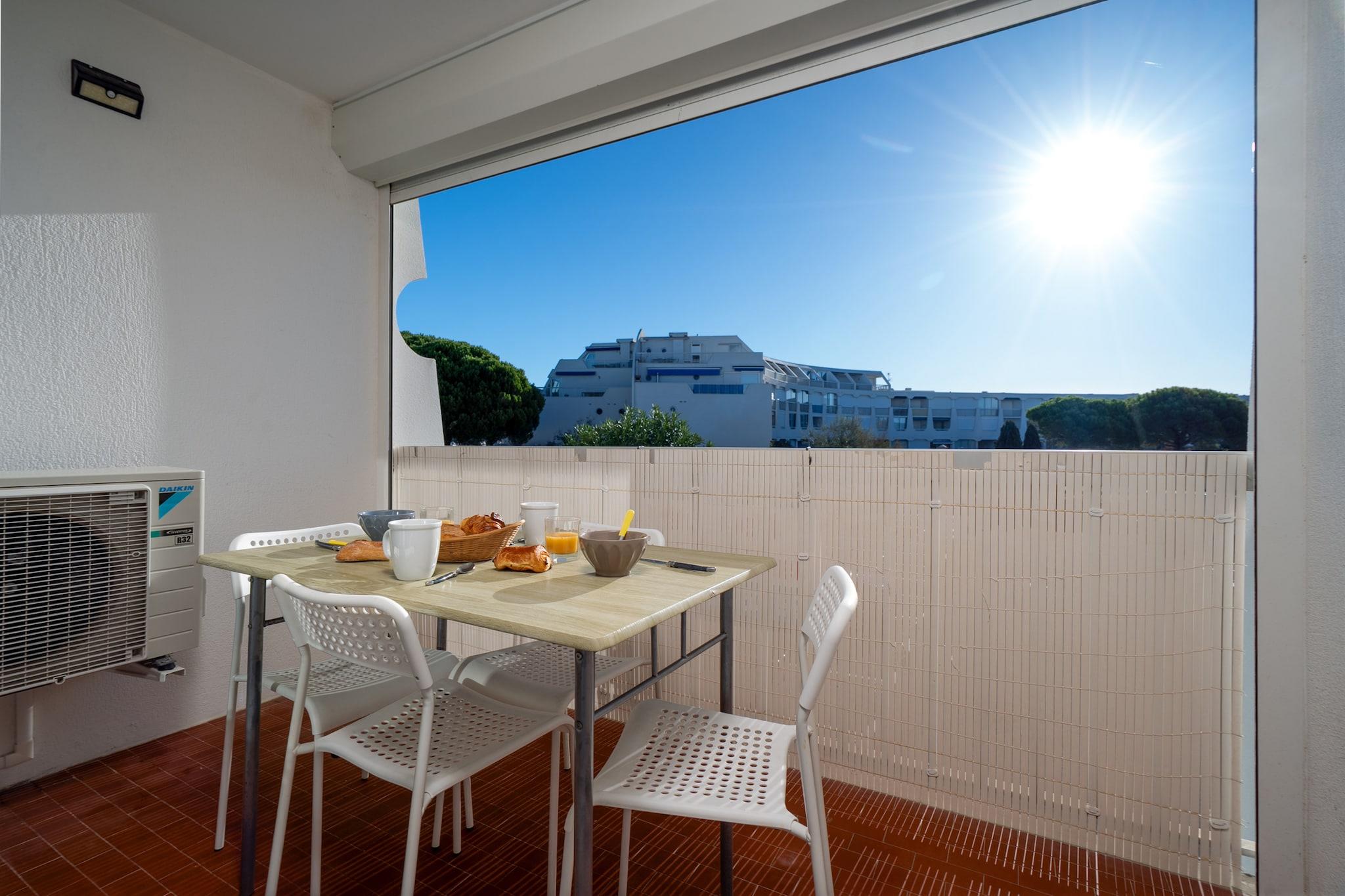 The studio in Le Grau-du-Roi has capacity for 4 persons. Accommodation of 20 m² cozy and is very light. The property is located 400 m supermarket "SPAR", 450 m the restaurant, 600 m sand beach "Plage de Port Camargue" and it is located in a a family-friendly zone and next to the sea. The accommodation is equipped with the following items: internet (Wi-Fi), balcony, electric heating, air-conditioned. The open plan kitchen, electric, is equipped with refrigerator, microwave, dishes/cutlery, kitchen utensils, coffee machine, toaster and kettle.