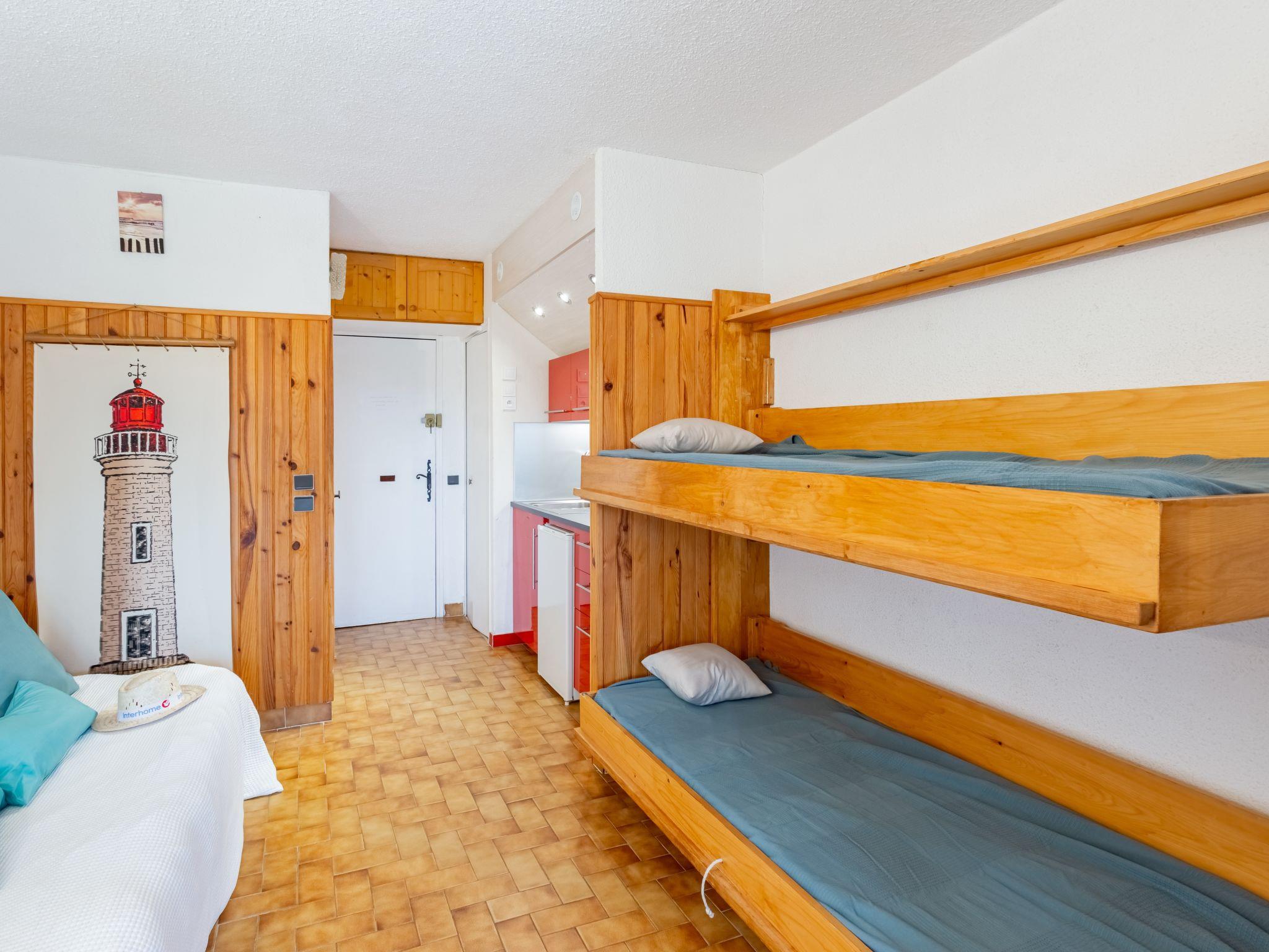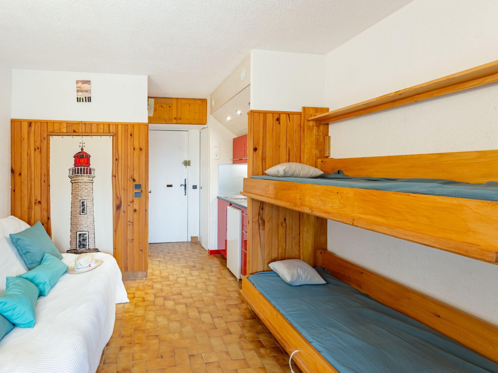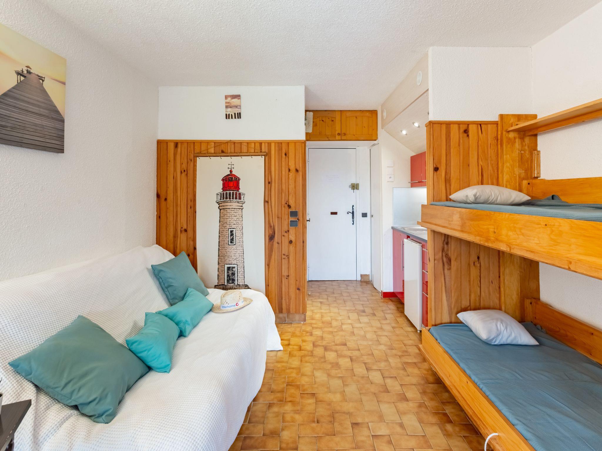 1-room studio 24 m2, on the ground floor. Object suitable for 2 adults + 2 children. Beautiful furnishings: living/dining room with panoramic window with 1 double sofabed (140 cm, length 190 cm), 1 x 2 bunk beds (90 cm, length 190 cm), TV (flat screen), air conditioning. Exit to the garden. Small kitchenette (2 ceramic glass hob hotplates, toaster, kettle, microwave, electric coffee machine, Capsules for coffee machine (Senseo) extra). Shower/WC. Electric heating. Small terrace. Terrace furniture. Facilities: hair dryer. Internet (WiFi, extra). Parking space n 134. Please note: non-smokers only. Smoke alarm. 83070001486VF