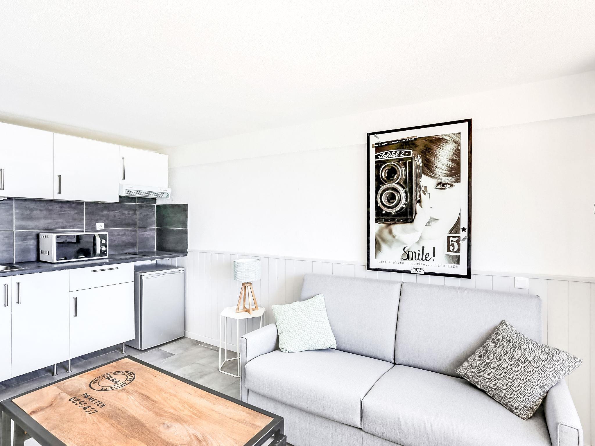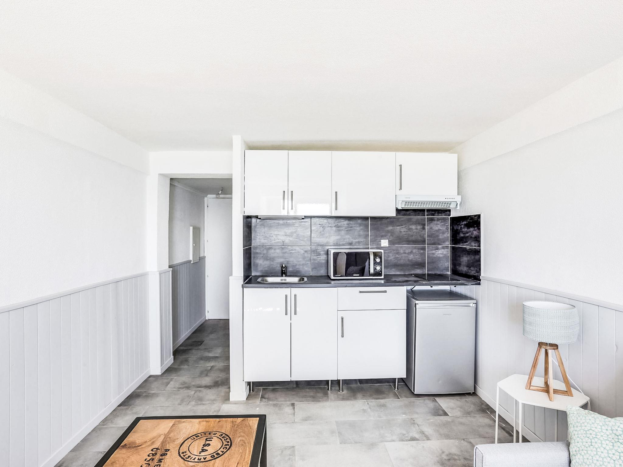 1-room studio 20 m2, on the ground floor. Simple and beautiful furnishings: living/dining room with 1 double sofabed (140 cm, length 190 cm), dining table and TV (flat screen). Kitchenette (2 ceramic glass hob hotplates, toaster, kettle, electric coffee machine, combination microwave). Shower/WC. No heating option. View of the sea. Facilities: Internet (WiFi, extra). Please note: no parking. Maximum 1 pet/ dog allowed. TV only FR. Smoke alarm. 8307000091231