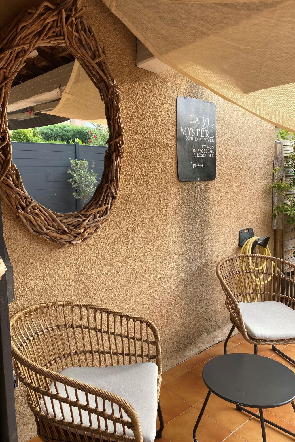 3-room terraced house 55 m2 on 2 levels. Comfortable and beautiful furnishings: living/dining room with TV (flat screen), air conditioning. Open kitchen (oven, dishwasher, 4 induction hot plates, toaster, kettle, microwave, electric coffee machine). Sep. WC. Electric heating. Upper floor: 1 room with 1 french bed (160 cm, length 200 cm), TV (flat screen), air conditioning. Open gallery with sloping ceilings with rooflight with 1 french bed (140 cm, length 190 cm), air conditioning. Shower/WC. Terrace 30 m2. Terrace furniture, barbecue, deck chairs (4). Facilities: washing machine, iron. Internet (WiFi, extra). Parking at the house. Please note: non-smoking house. TV only FR. Smoke alarm. Instead of an enclosed bedroom, some sleeping areas are located in an open-plan area (gallery, alcove, etc.). 83070 000994 74