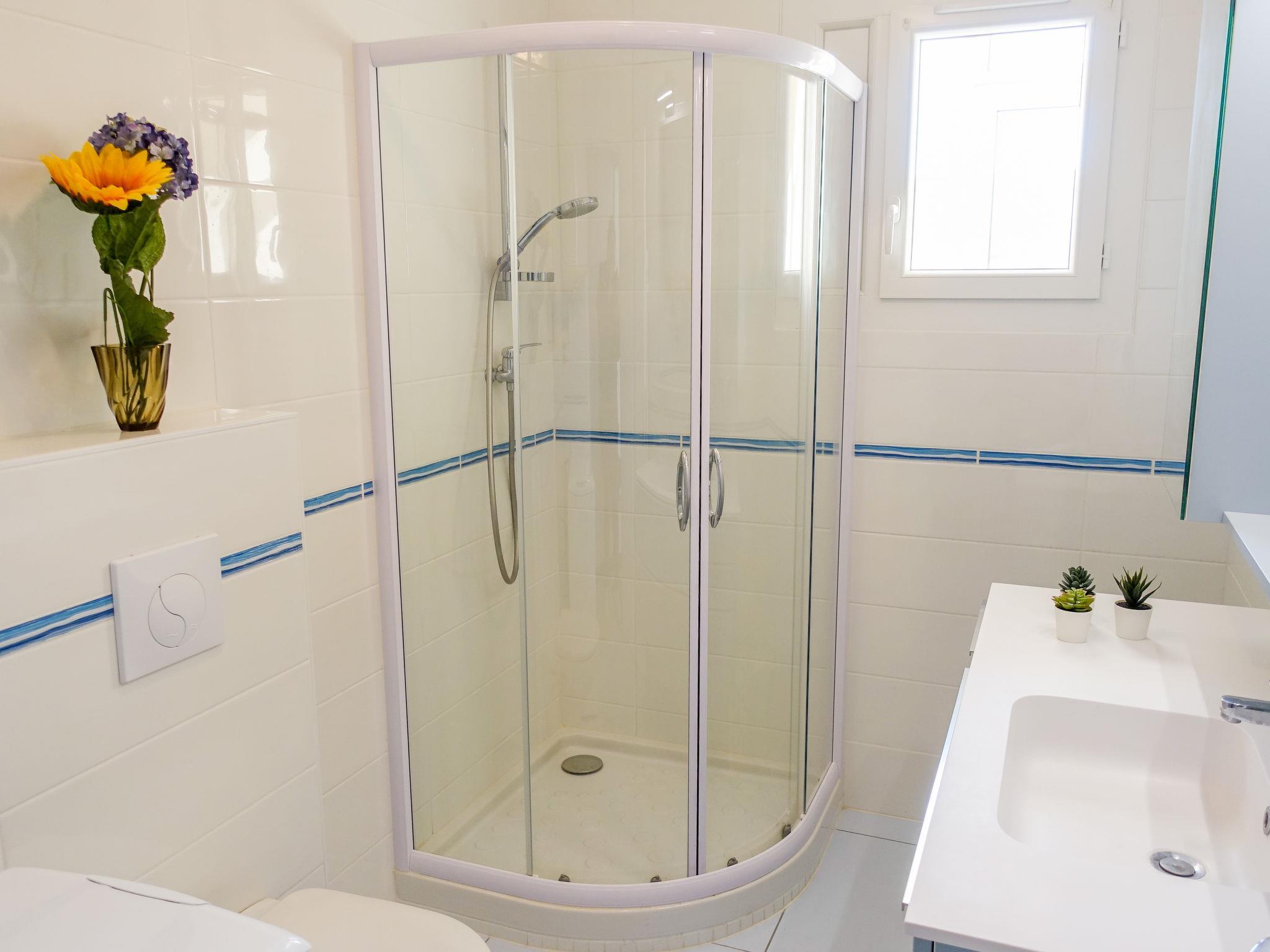 2-room apartment 52 m2 on 2nd floor. Object suitable for 2 adults + 3 children. Comfortable furnishings: living/dining room with panoramic window with 1 double sofabed (140 cm, length 190 cm), TV and flat screen. Exit to the balcony. 1 room with 1 x 2 bunk beds (90 cm, length 190 cm), 1 french bed (140 cm, length 190 cm), air conditioning. Kitchen (oven, dishwasher, 3 induction hot plates, toaster, kettle, microwave, freezer, electric coffee machine) with small dining table. Exit to the loggia. Shower/WC. Electric heating, boiler (100 litres). Balcony 10 m2. Balcony furniture. View of the swimming pool. Facilities: washing machine, iron, hair dryer. Internet (WiFi, extra). Parking space n 25 (1 car). Please note: non-smokers only. TV only FR. Smoke alarm, no lift. Bed layout is flexible. There are more sleeping options available than the maximum number of people allowed which may, however, not be exceeded. 830700013918C