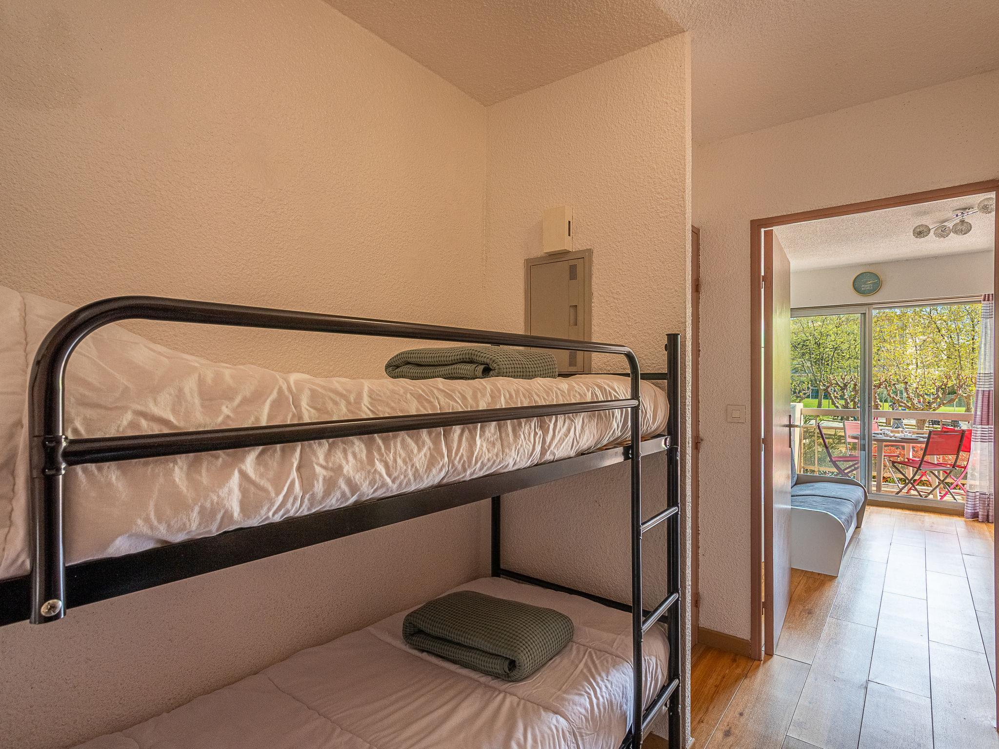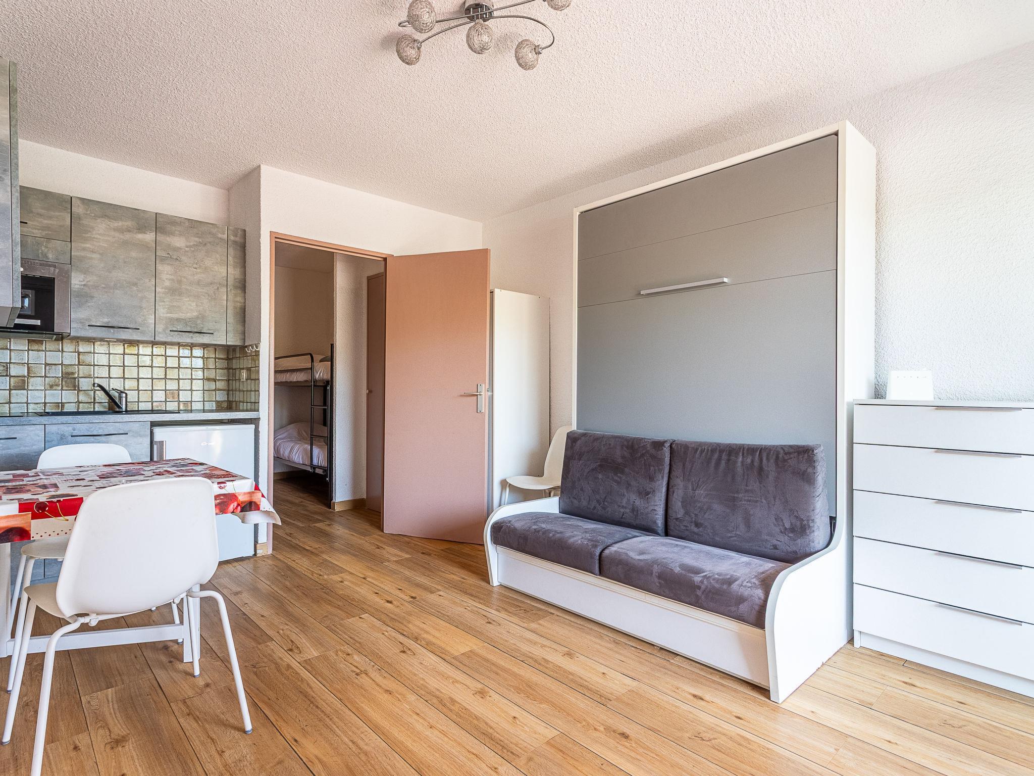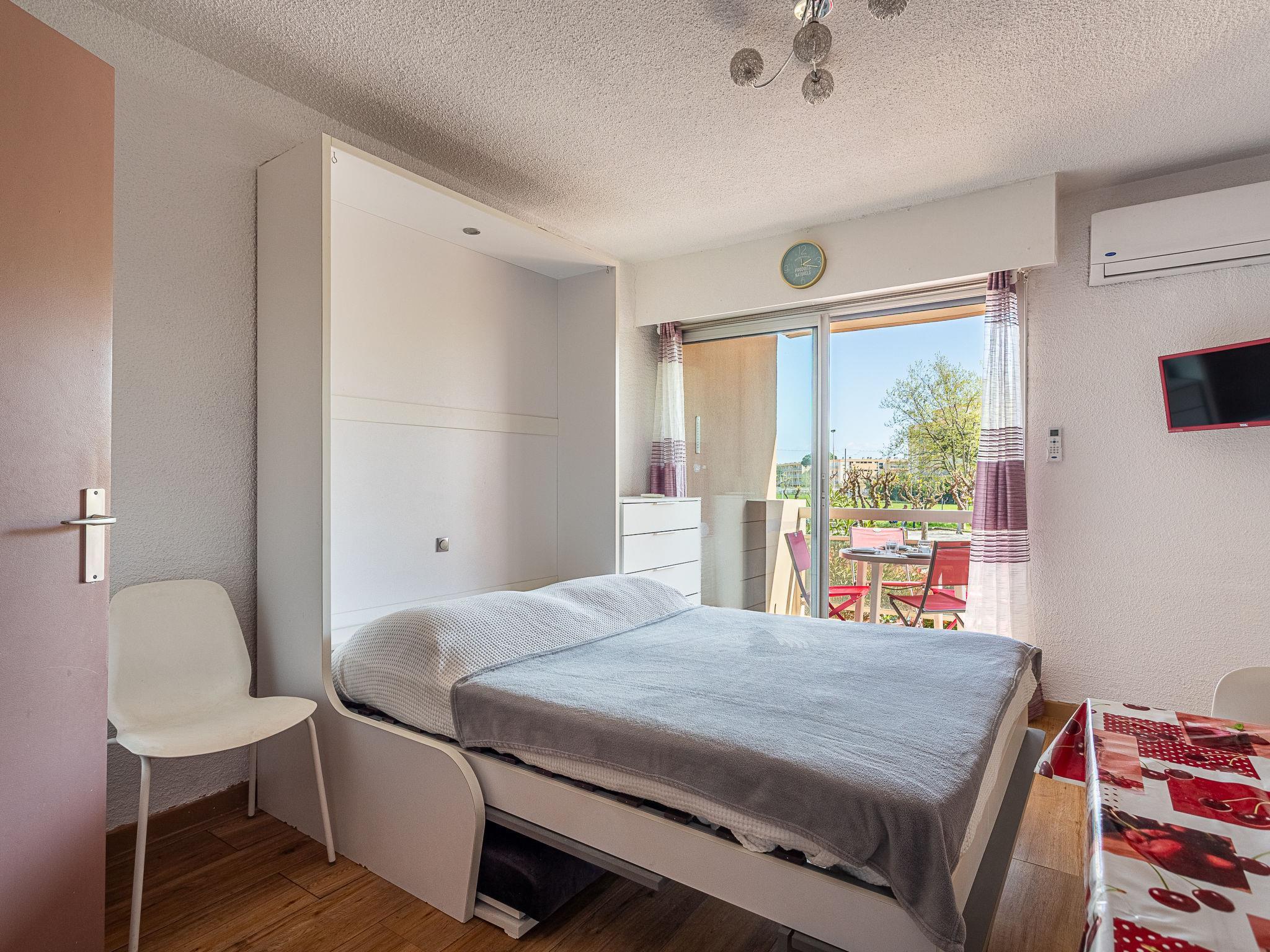 1-room studio 21 m2, on the ground floor, south facing position. Comfortable furnishings: living/dining room with 1 double fold-away bed (140 cm, length 190 cm), TV (flat screen). Exit to the terrace. Sleeping alcove with 1 x 2 bunk beds (80 cm, length 190 cm). Kitchenette (2 ceramic glass hob hotplates, toaster, kettle, electric coffee machine, Capsules for coffee machine (Nespresso) extra, combination microwave). Shower, sep. WC. Electric heating, air-conditioning. Small terrace 6 m2, south facing position. Terrace furniture. View of the countryside. Facilities: washing machine, iron, hair dryer. Internet (WiFi, extra). Please note: non-smokers only. Maximum 1 pet/ dog allowed. TV only FR. Smoke alarm. Offer by a private individual according to Art. 155, IV of CGI. 83070003116MA