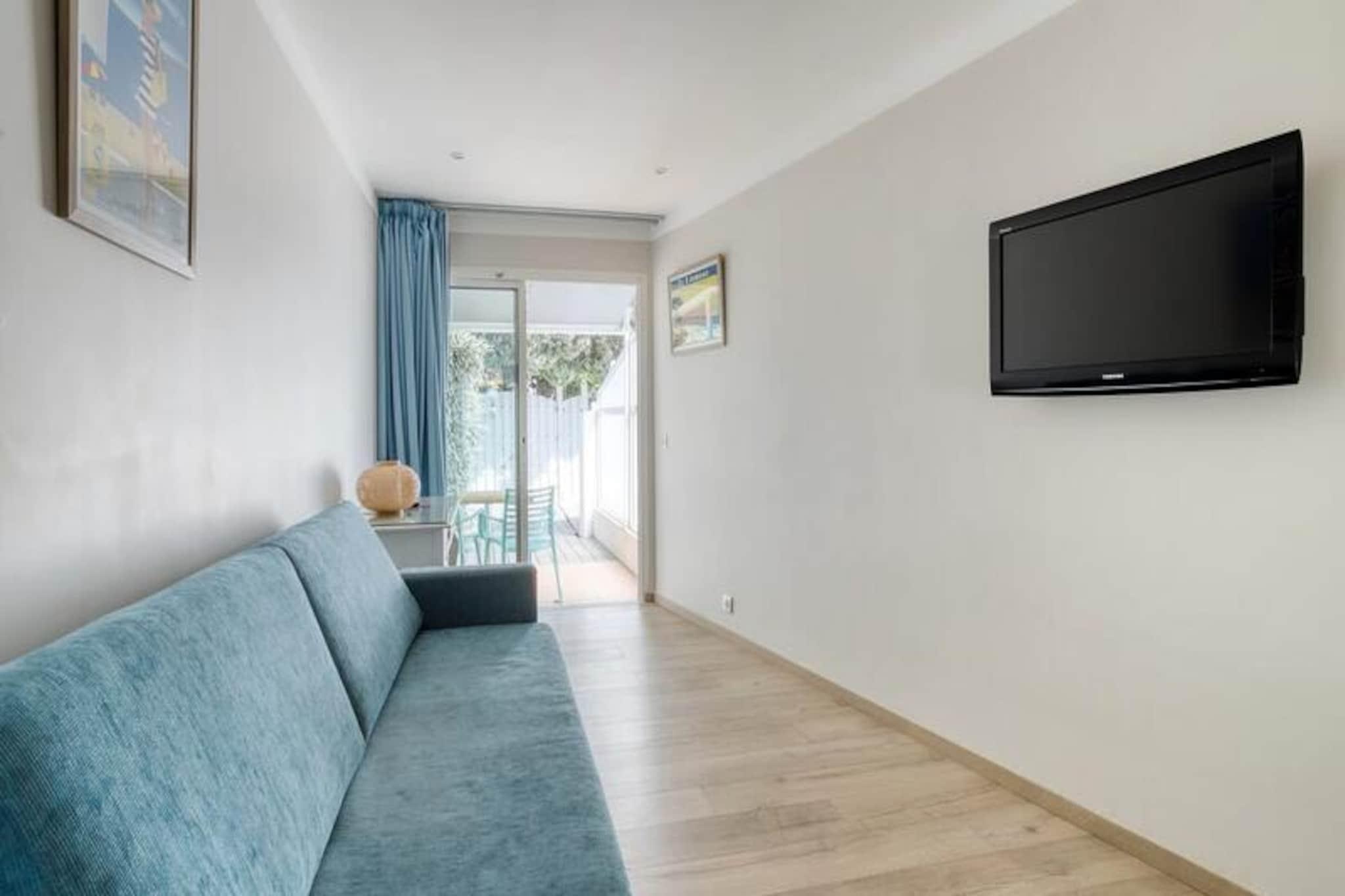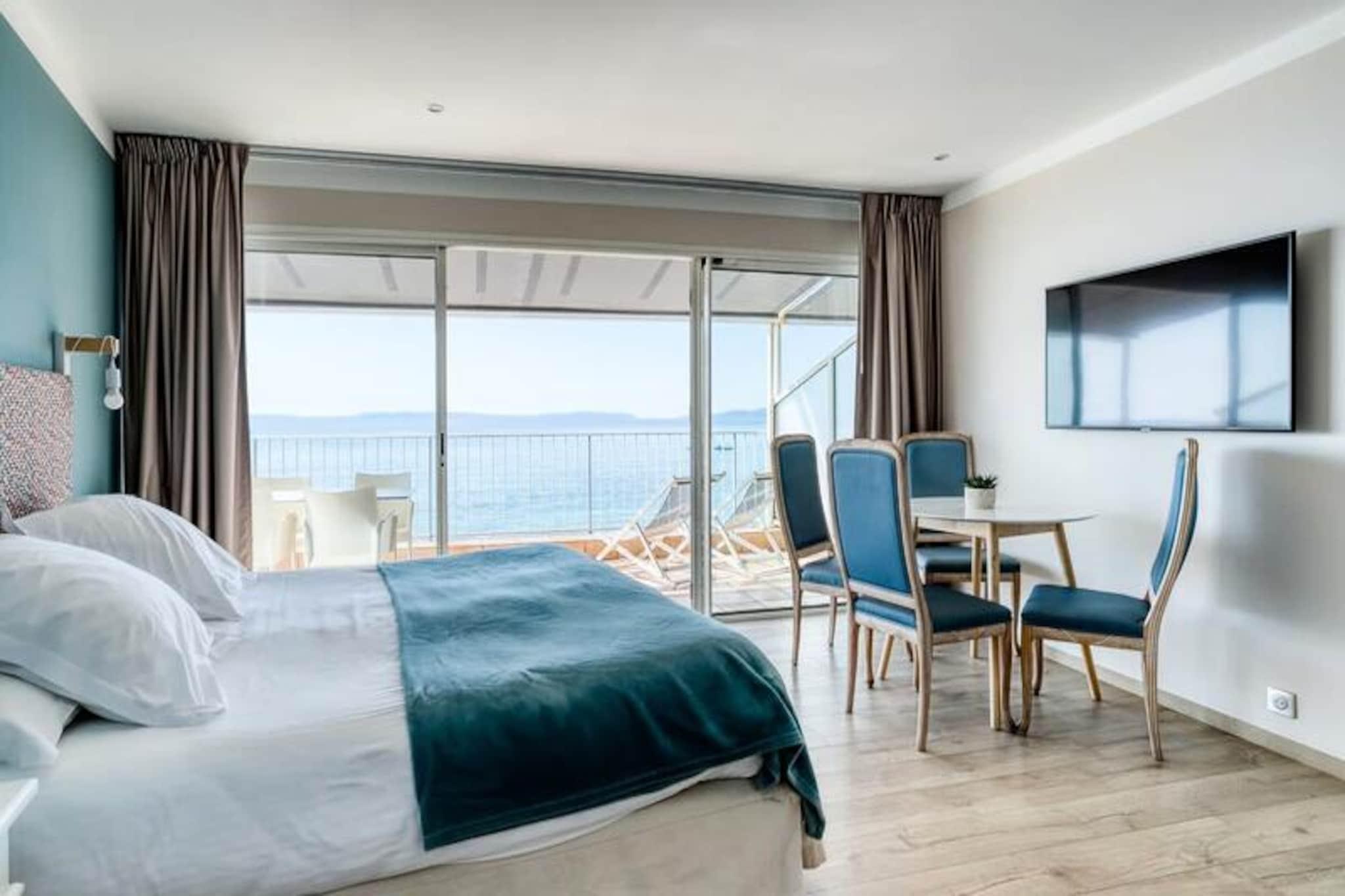 Imagine waking up to the soothing sound of waves and a breathtaking view of the Mediterranean Sea. This exclusive suite, located in the prestigious 4-star Roc-Hôtel in the Saint-Clair district, offers a unique blend of hotel luxury and apartment freedom. Available during the hotel's annual closure from November to March, it provides a serene retreat for couples, families, or remote workers seeking tranquility by the sea. With its private entrance and direct access, you’ll feel completely independent while enjoying the comforts of a high-end establishment. \n\nInside, the suite is thoughtfully designed with an equipped kitchenette, air conditioning/heating, Wi-Fi, and private parking. Beds are made upon arrival, and linens and towels are provided, ensuring a seamless and comfortable stay. The panoramic sea view from the suite is truly exceptional, offering glimpses of the Îles d'Or, including Port-Cros and Le Levant. Whether you’re preparing a meal in the kitchenette or simply relaxing, the ambiance is one of pure coastal charm. \n\nStep outside, and you’re just a short stroll from Saint-Clair Beach, known as \