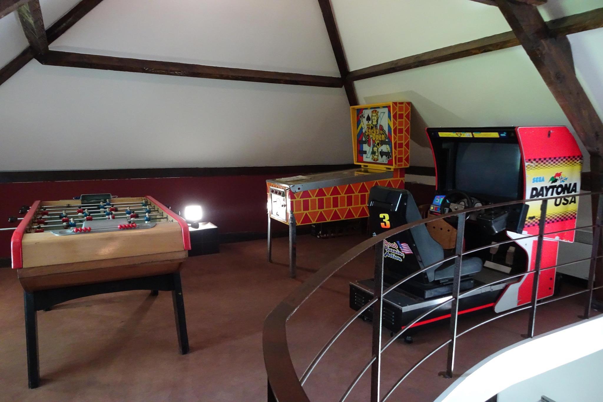 Ground floor: (open kitchen(dining table, electric kettle, toaster, cooker(4 ring stoves, ceramic), coffee machine(filter), coffee machine(pads), oven, microwave, dishwasher, fridge, freezer, tumble dryer, washing machine), Living/diningroom(TV(satellite), fireplace, seating area), bathroom(shower), toilet) On the 1st floor: (bedroom(single bed(80 x 190 cm), single bed(80 x 190 cm)), bedroom(single bed(80 x 190 cm), single bed(80 x 190 cm)), bedroom(7 m2)(double bed(140 x 190 cm)), bedroom(double king size bed(160 x 200 cm)), bathroom(bath tub), mezzanine(TV, DVD player)) Annex: (Sitting room(TV(no dutch television channels, no german television channels)), open kitchen(dining table, electric kettle, toaster, cooker(4 ring stoves, ceramic), coffee machine(filter), oven, microwave, dishwasher, fridge, washing machine), bedroom(8 m2)(double bed(140 x 190 cm), shower, washbasin), bedroom(8 m2)(double bed(140 x 190 cm), shower, washbasin), toilet, mezzanine(single bed(80 x 190 cm), single bed(80 x 190 cm), single bed(80 x 190 cm))) Guest house ground floor: (Bar, Cinema, wireless music system, CD player, toilet, video projector, table tennis table, table football, air hockey) Barbecue center, Parking, Balls court, garden, sun loungers, swimming pool(private, outside), tennis court, children's bed, high chair