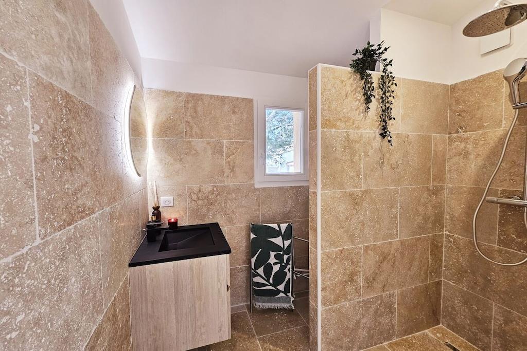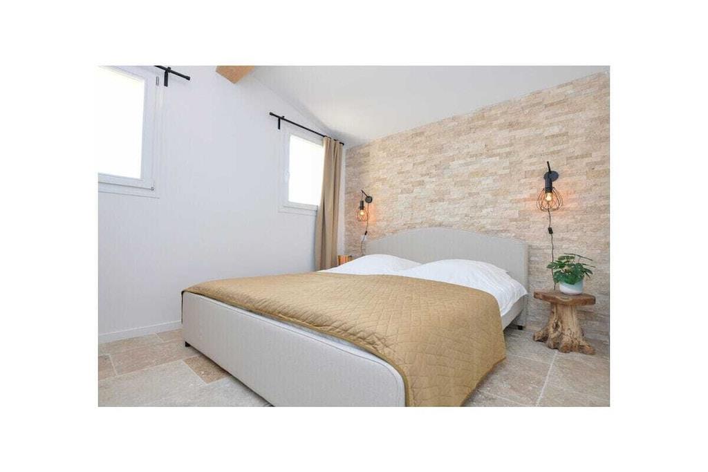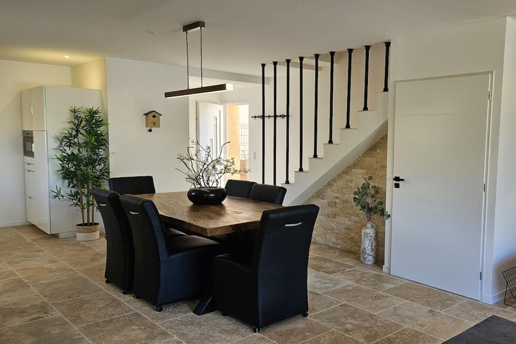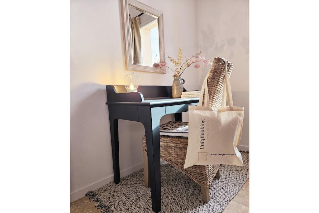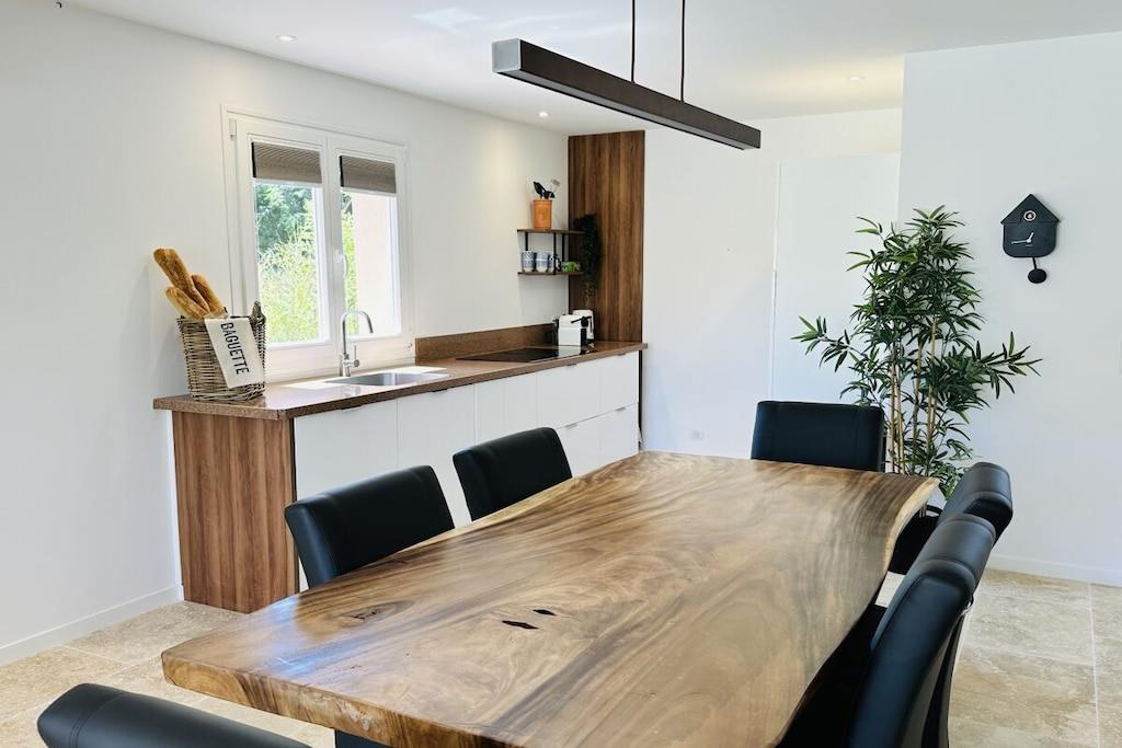 Ground floor: Fully equipped kitchen with induction hob, refrigerator with freezer compartment, dishwasher, and Nespresso coffee machine. Dining area, garden-facing living room with sliding doors leading to a private terrace with dining area. Saltwater swimming pool with pool terrace and sun loungers. The pool and pool terrace are shared with the other semi-detached house, Maison Laurier Rose. Upstairs: 3 bedrooms in total; 1 master bedroom with en-suite bathroom featuring a walk-in shower and sink, 1 double bedroom, and 1 bunk bed bedroom. Second bathroom with walk-in shower and sink. Separate toilet. Mandatory, not included in the rental price: Final cleaning: EURO150.00 Bed and towels: EURO25.00 per person