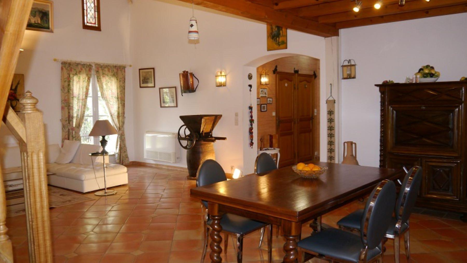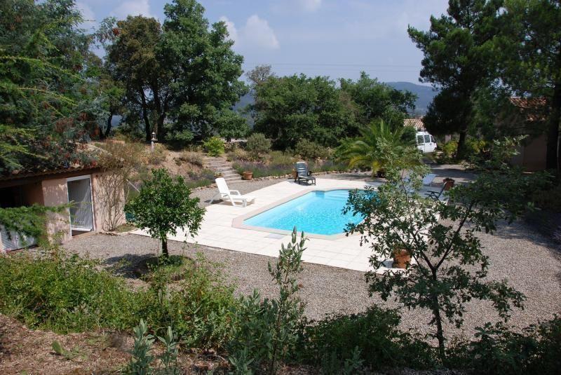 La villa dispose de deux terrasses. La terrasse couverte de 25 m² est adjacente à la cuisine et à la salle à manger. La deuxième terrasse fait 50 m² et s'just 20 m from the house. It is furnished with'une grande table et de bancs pour six personnes. Depuis cette terrasse, vous bénéficiez d'a magnificent 270° view of the surrounding hills. The holiday home stands in 3200 m² of grounds planted with'arbres et avec piscine. La piscine fait 3,5 x 7,5 m, n'and is not visible from the'extérieur et subi un entretien professionnel deux fois par semaine. Des meubles de jardin comme des chaises et bains de soleil sont mis à disposition au bord de la piscine et sur les terrasses. Il y a aussi un barbecue à côté de la piscine. Deux places de stationnement sont aussi mises à disposition.