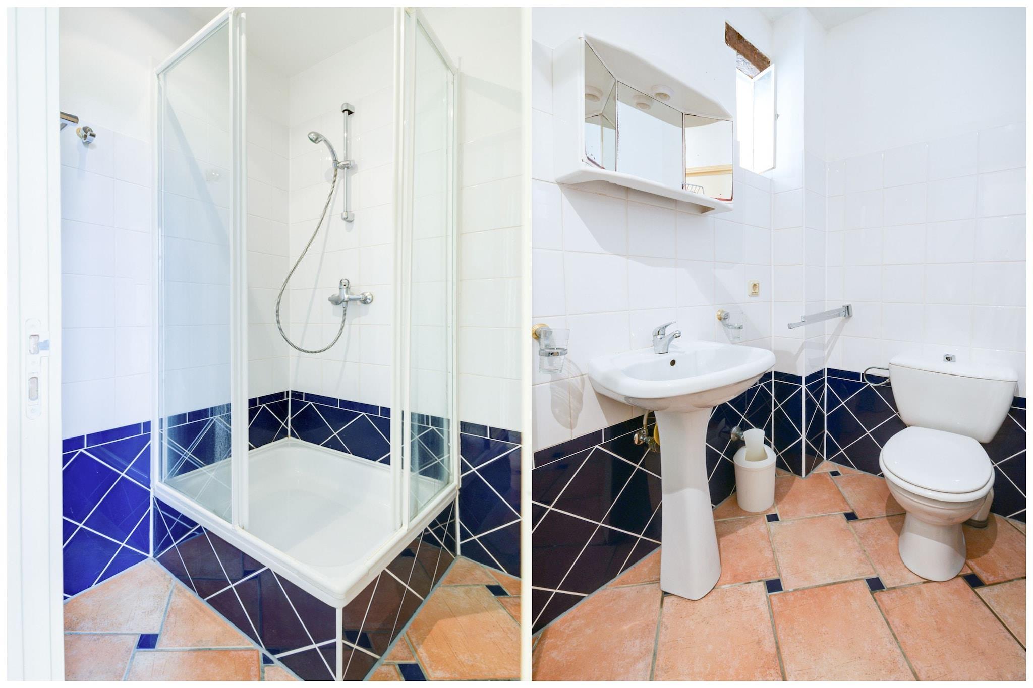 On the 1st floor: (Kitchen(electric kettle, cooker(4 ring stoves, electric), coffee machine(filter), oven, microwave, fridge-freezer), Living/bed room(double bed(140 x 190 cm)), bathroom(shower, toilet)) washing machine(shared with other guests), garden(shared with other guests, fenced), BBQ(shared with other guests)