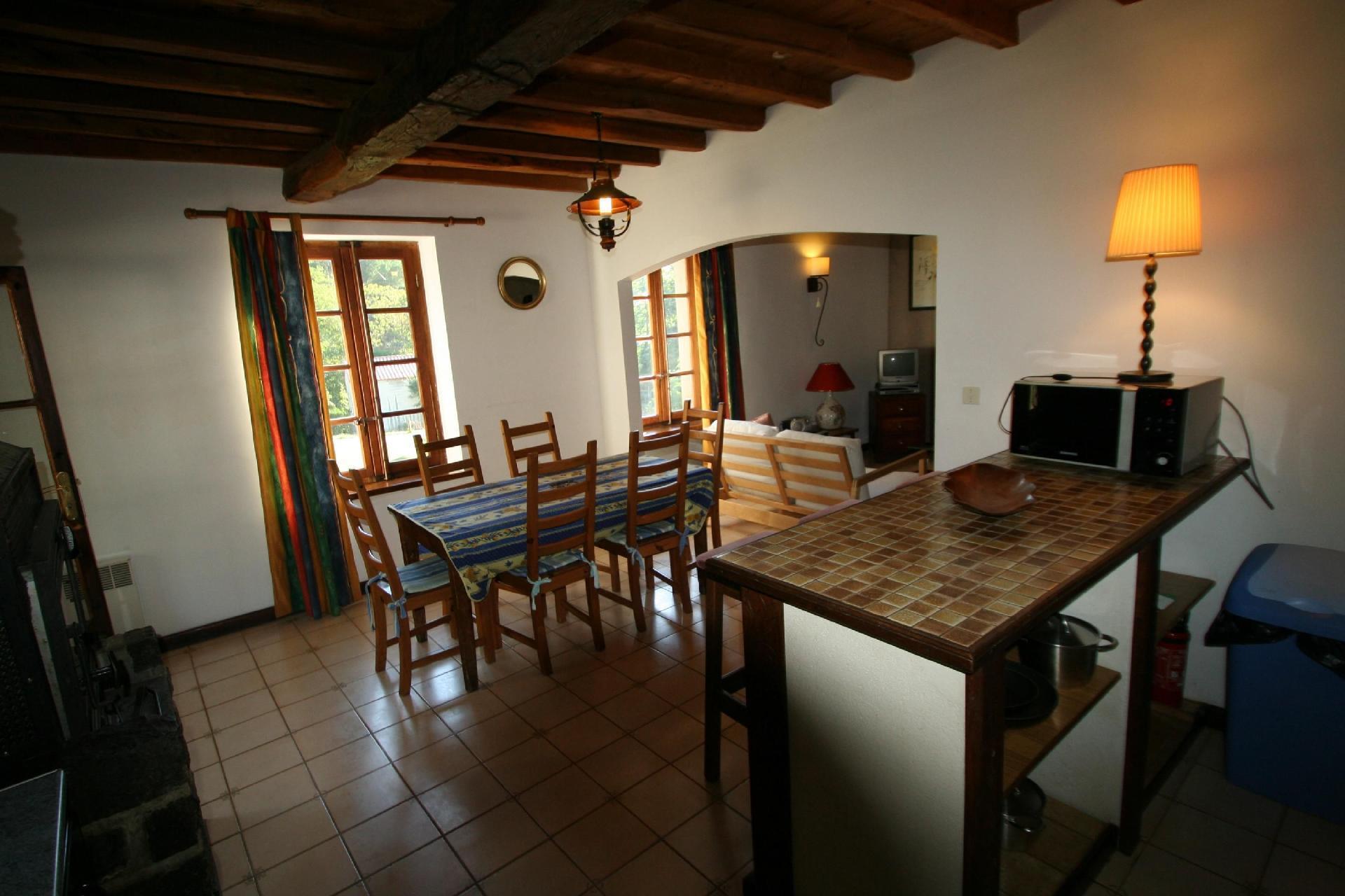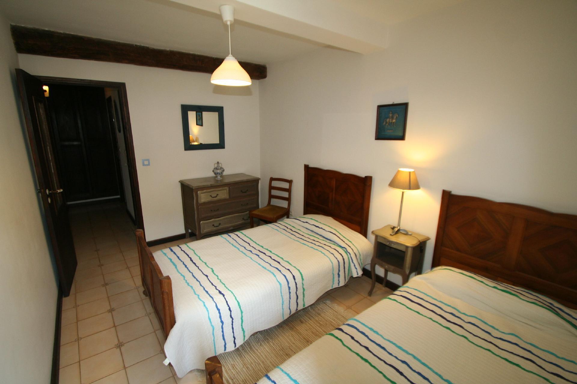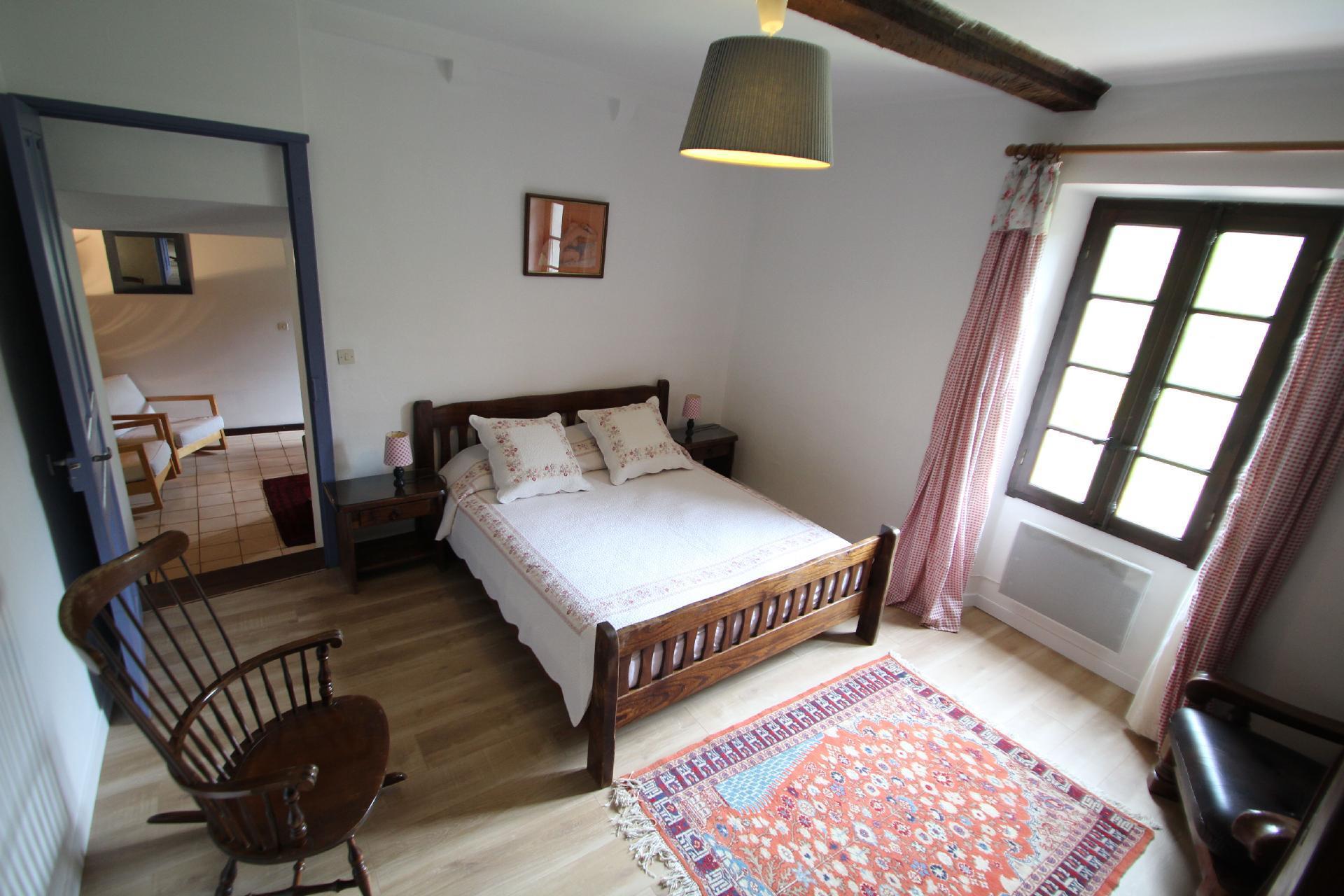 Access is via a covered porch with table and chairs, and another table in front of the gîte is on the lawn. The entrance is via the dining room and pleasant open-plan kitchen with its counter and high chairs. This north-east-facing flat comprises a spacious living/dining room with rocking chairs and TV. The open-plan kitchen is equipped with dishwasher, cooker with oven, microwave and other appliances for everyday use. Pleasant wood-burning stove. The flat has two bedrooms, one with a large 1.60 m double bed and the other with two single beds. The bathroom has a bath, bidet and separate WC. This flat also has the best view of the Mas.