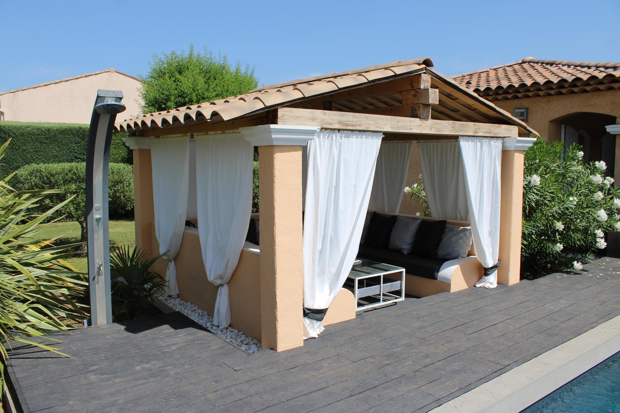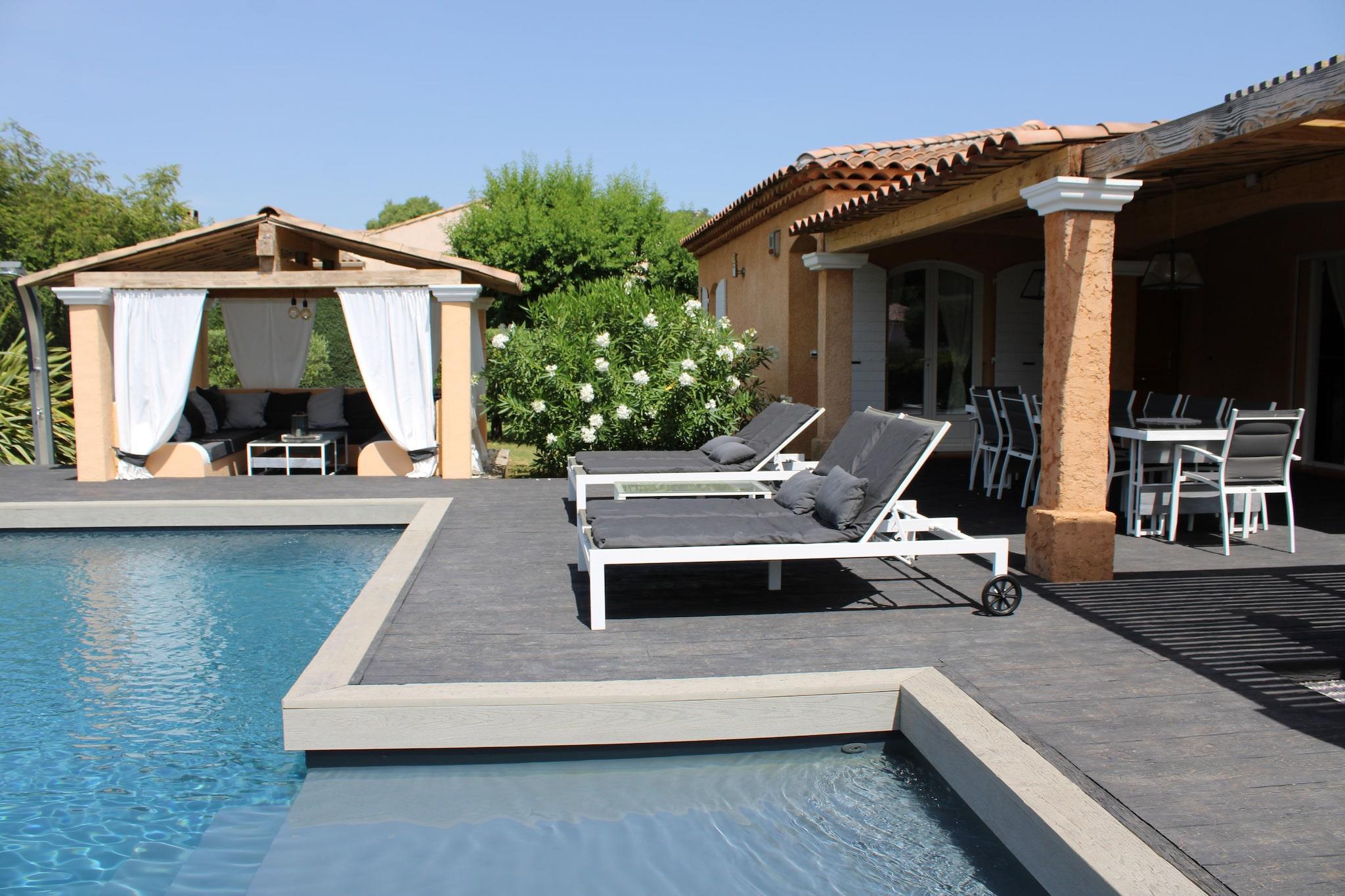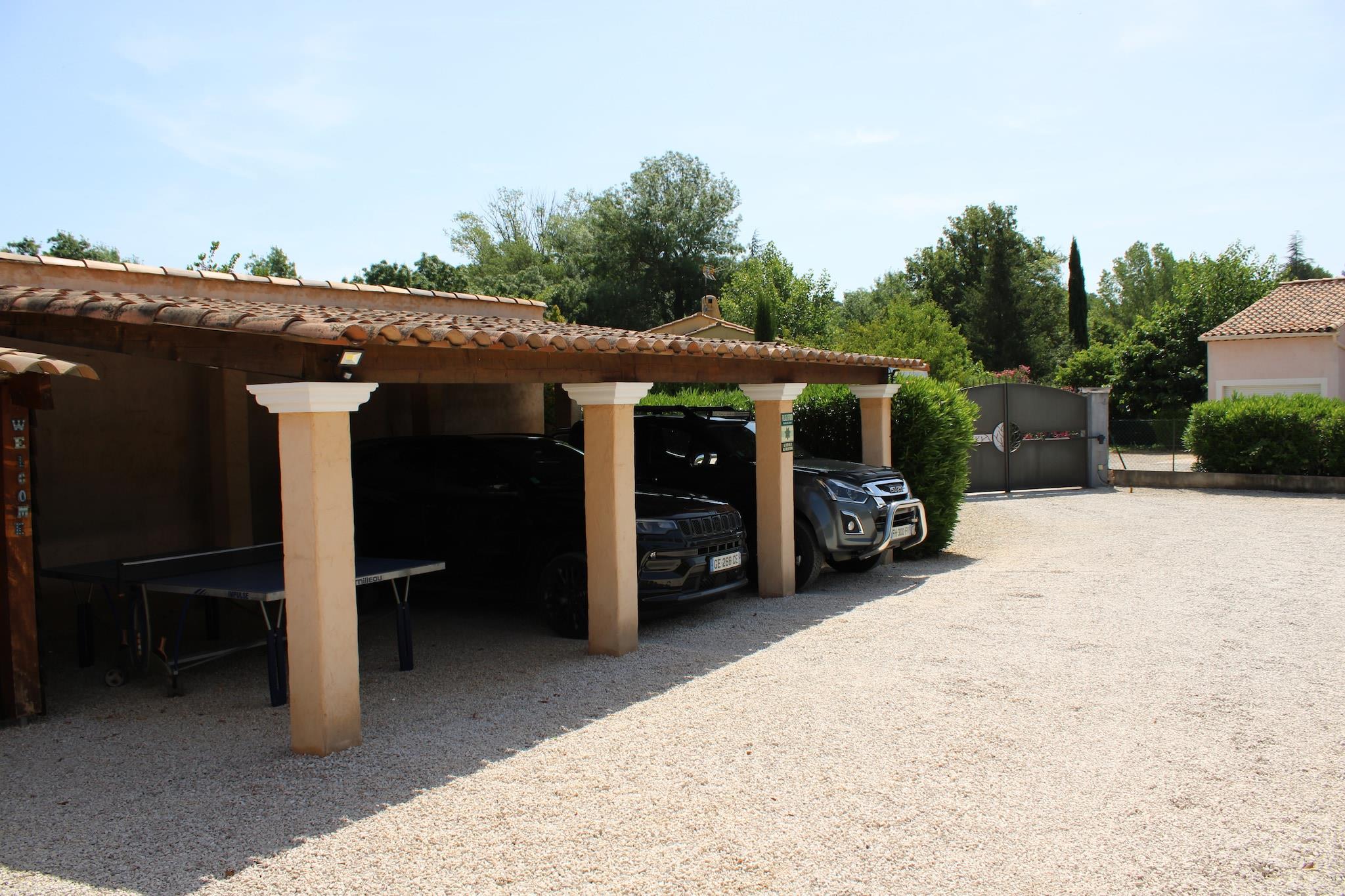 Villa Terre des Anges has a beautiful swimming pool with a spacious walk-in beach where children can play. The swimming pool has a roller shutter and an outdoor shower is also available. You can stay comfortably with family or friends. The villa is located in a quiet area near the village of Le Val, where you will find the bakery, butcher, grocer, terraces and restaurants. The charming village is located in a valley. It offers a mix of Romanesque and medieval neighborhoods that give it a lot of character. The town of Brignoles is a few minutes' drive away, where the larger supermarkets are located. In addition, the region is home to numerous wine chateaux and well-known Provencal markets, such as the Tuesday morning market in Lorgues and Cotignac. The beaches of Frejus and St. Tropez are 65 km away and cities such as Cannes, Toulon, Hyers and Marseille can all be reached within about 1 hour. The house has a well-equipped open kitchen with dining room. The living room has a dining table, comfortable sofa with flat screen TV, Chromecast, Apple TV and WiFi. The large windows provide plenty of light. Next to the house there is a studio with its own entrance, spacious bedroom and private bathroom. There is a beautiful covered lounge area to relax by the pool and the covered terrace has a dining table and a pond with a waterfall. Next to the terrace there is a plancha (gas) for preparing grilled delicacies under the beautifully lit pergola. For recreation, the residence offers a jeu de boules court and a table tennis table. There are plenty of sun loungers by the pool for sunbathing.