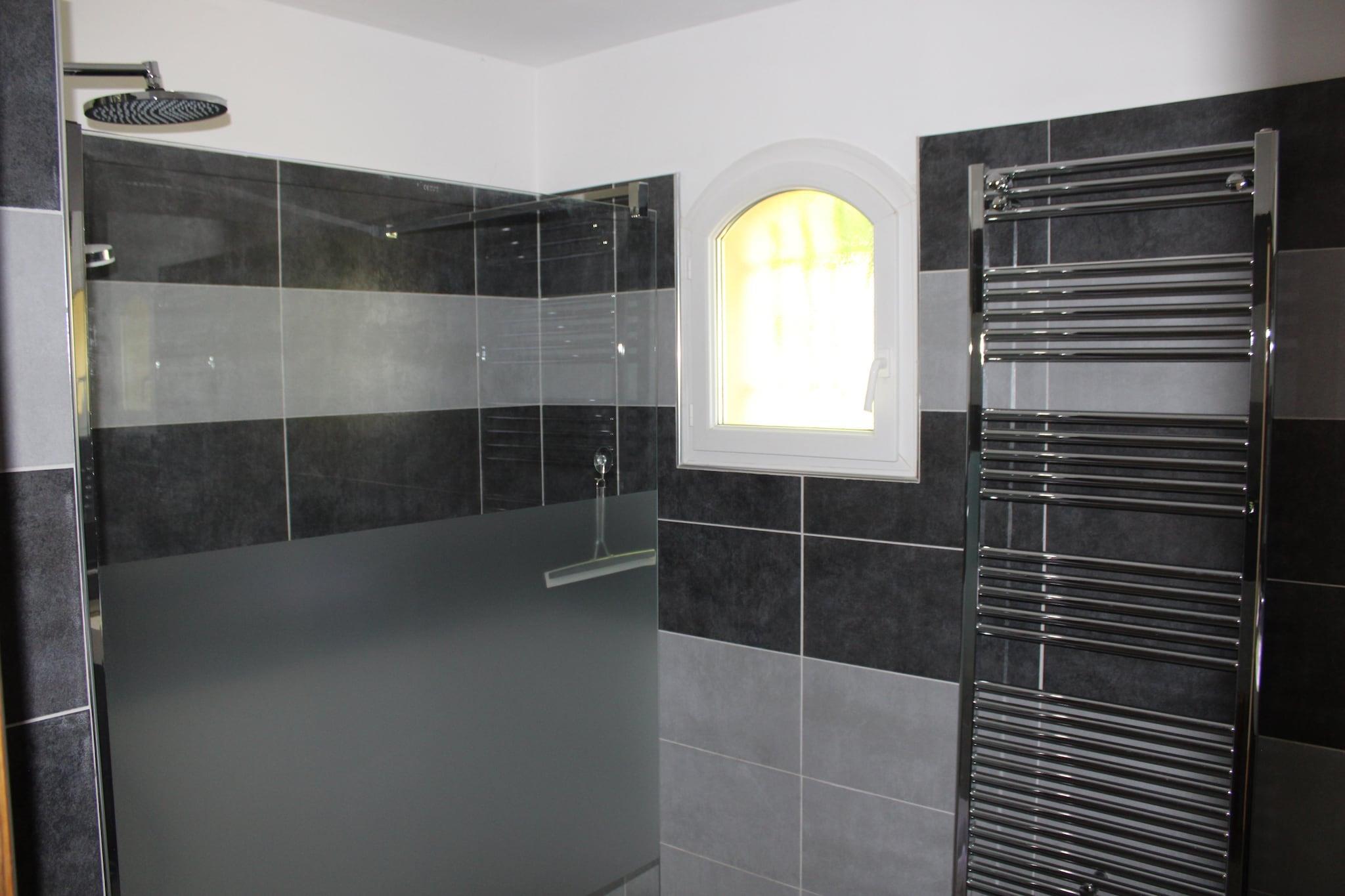 Ground floor: (open kitchen(bar, electric kettle, espresso machine, oven, grill, microwave, dishwasher, fridge-freezer), Living/diningroom(TV, dining table, seating area), bedroom(double bed(180 x 200 cm)), bedroom(double bed(140 x 190 cm)), bedroom(double bed(140 x 190 cm)), Bedroom with bathroom(double bed(180 x 200 cm), shower, washbasin, toilet), bathroom(shower, washbasin, toilet), washing machine) outdoor kitchen, air conditioning, terrace, garden, garden furniture, sun loungers, parking, swimming pool(private), boules court
