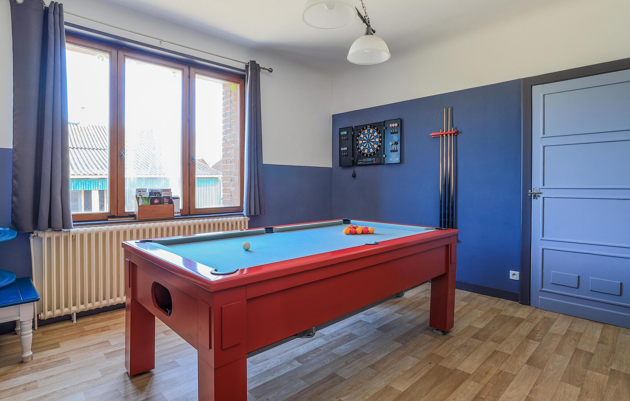 Genießen Sie Ihren Urlaub in diesem geräumigen Haus mit Platz für mehrere Familien, das in einer kleinen Gemeinde mit reizvoller Backsteinarchitektur im Pas-de-Calais liegt. Entdecken Sie das helle und gemütlich eingerichtete Wohnzimmer, ideal für gesellige Runden. Nutzen Sie den großzügigen Essbereich, um gemeinsame Mahlzeiten zu genießen, die Sie bequem in der schönen Küche zubereiten können. Verbringen Sie unterhaltsame Stunden beim Billardspiel oder messen Sie sich bei spannenden Dart-Turnieren.