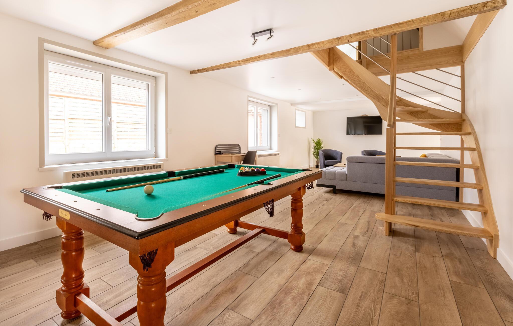 Dieses minimalistisch eingerichtete Ferienhaus verwöhnt Sie mit komfortablen, lichtdurchfluteten Räumlichkeiten. Kochen Sie gemeinsam in der hochwertig ausgestatteten Küche mit Blick ins Grüne und genießen Sie Ihre Mahlzeiten am stilvollen Esstisch. Entspannen Sie auf der gemütlichen Couch im offenen Wohnbereich, spielen Sie eine Runde Billard oder gönnen Sie sich pure Erholung im hauseigenen Whirlpool.