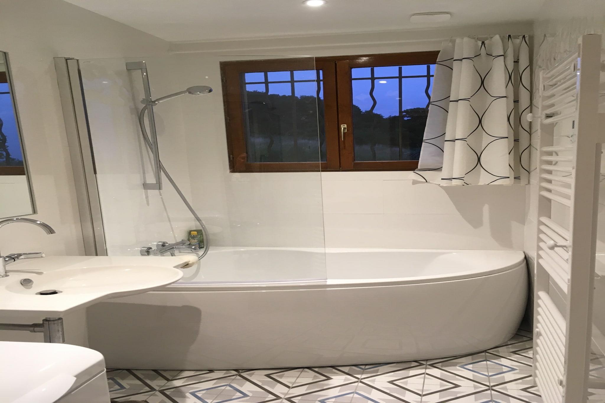 Ground floor: (Living room(TV, fireplace, radio, CD player), Kitchen(cooker(4 ring stoves), oven, microwave, dishwasher, fridge-freezer), bedroom(2x single bed, children's bed), bedroom(single bed, double bed), bathroom(bath tub, washbasin, toilet, washing machine), garden furniture) carport, microwave, dishwasher, bathtub or shower, washing machine, heating(electric), terrace, garden(fenced), bicycle storage, BBQ, boules court, play equipment, ironing board, party games