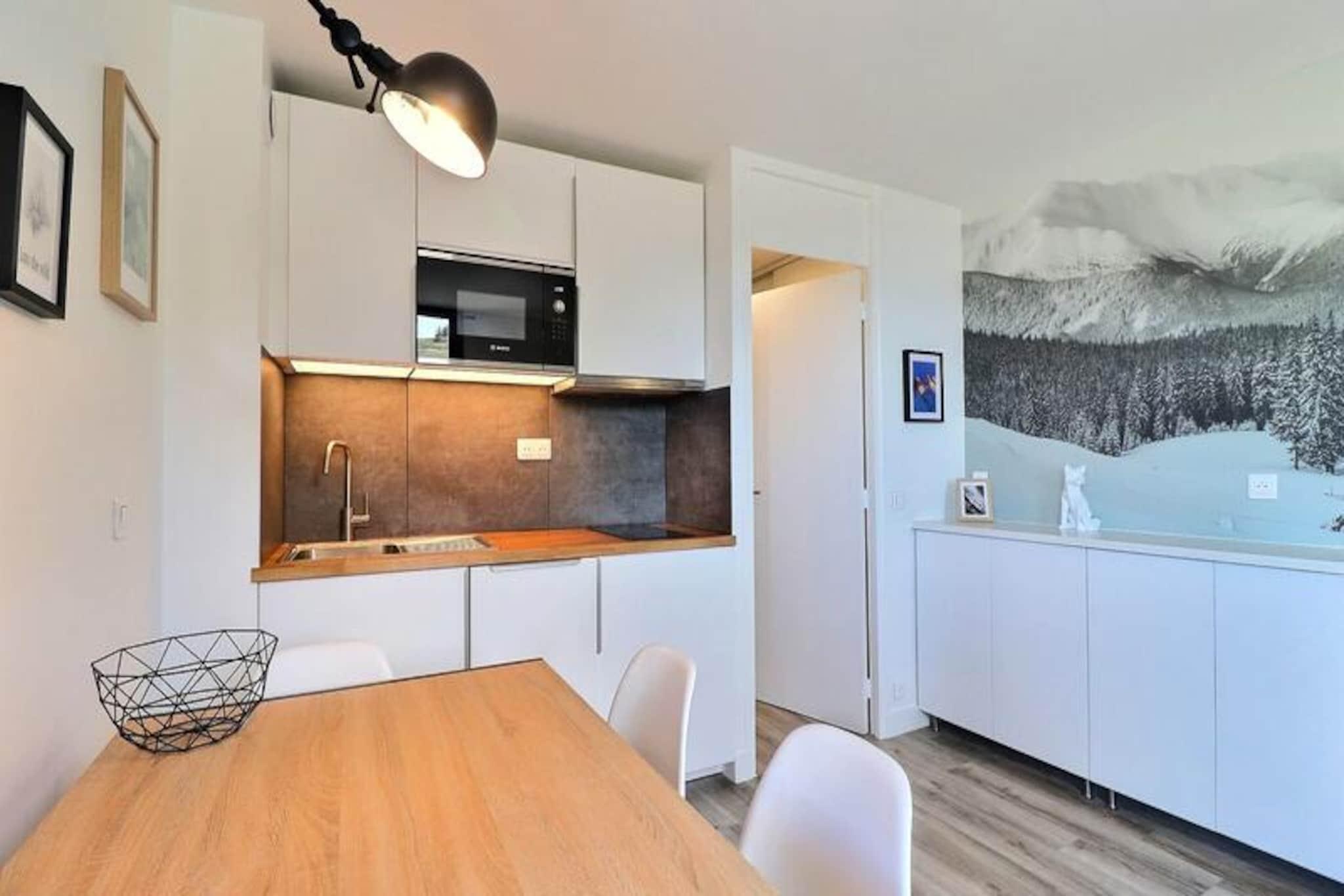 In the serene alpine village of Le Laitelet, this charming apartment in the Creux de l'Ours residence offers a cozy retreat for ski enthusiasts and mountain lovers alike. Imagine waking up to crisp mountain air and stepping out onto your north-facing balcony to take in the tranquil surroundings. With direct access to the slopes, adventure is just a few steps away, making this the perfect base for exploring the snowy landscapes of the French Alps. The residence is conveniently located near shops and amenities, ensuring everything you need is within reach. \n\nDesigned for up to four guests, this thoughtfully arranged apartment features a comfortable living room with a sofa bed for two, and a separate bedroom with two single beds. The kitchen is equipped with modern conveniences, including a combination microwave, ceramic hobs, dishwasher, and essential appliances like a coffee maker and toaster, making it easy to prepare hearty meals after a day on the slopes. A flat-screen TV and free Wi-Fi (subject to availability) add to the comfort, while the separate bathroom and toilet ensure practicality for all guests. \n\nThe location is ideal for those seeking both adventure and relaxation. Access to the slopes is effortless—simply head to the ski lockers and cross the square to reach the Perdrix green run, which leads to the main ski lift departure point. The Chalets cable car, operating from early morning until late evening, provides free and convenient transport to explore the Le Hameau and Le Laitelet areas. \n\nWhether you're here to carve through fresh powder or enjoy the peaceful alpine ambiance, this residence offers a welcoming and well-equipped home base for your mountain getaway. With its unbeatable location and cozy amenities, it promises a memorable stay in the heart of the French Alps.