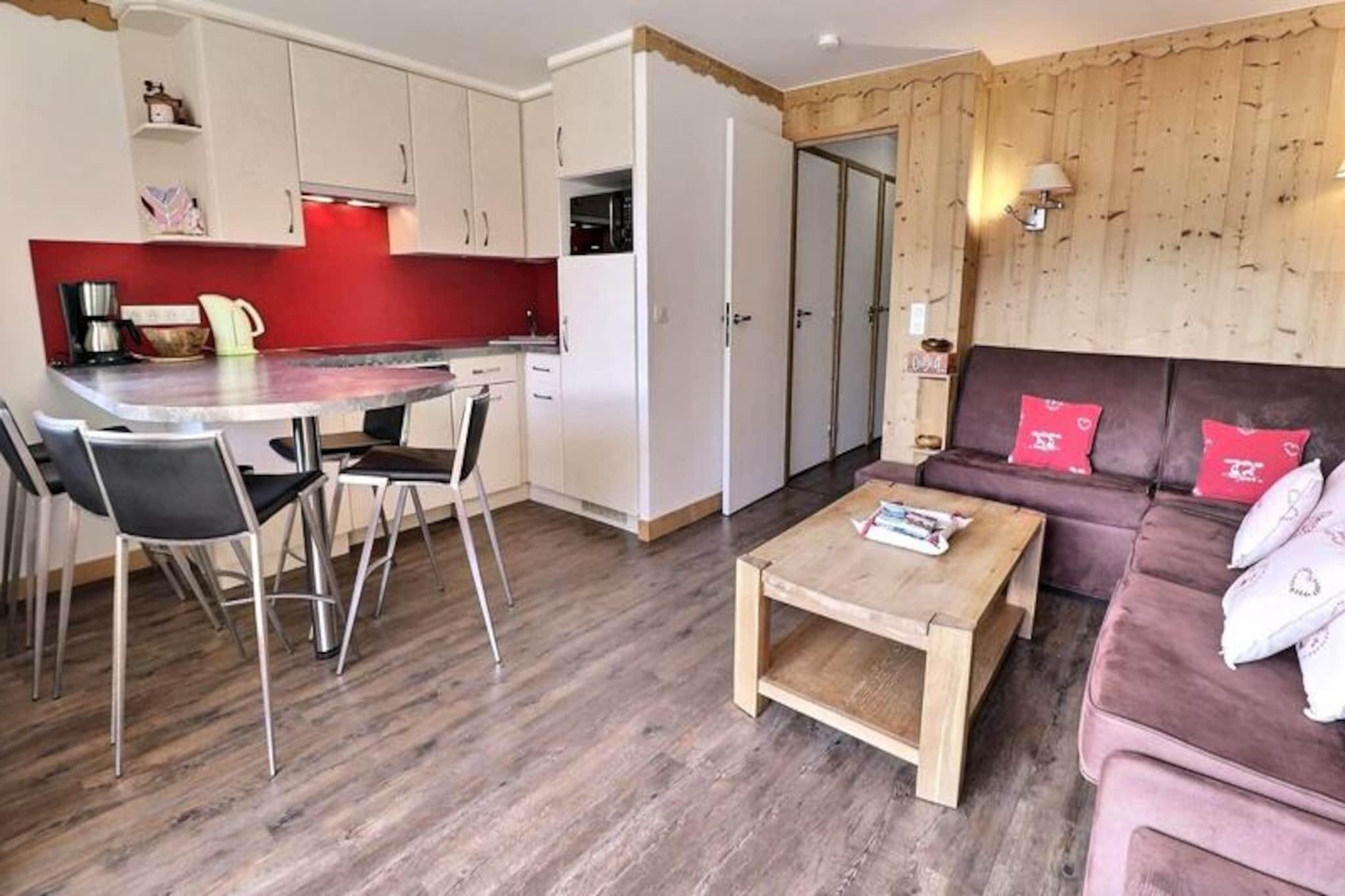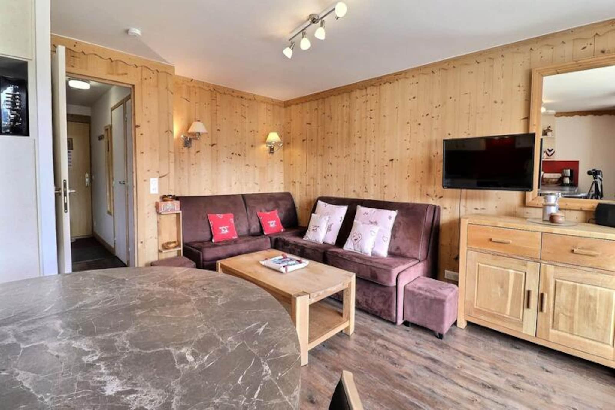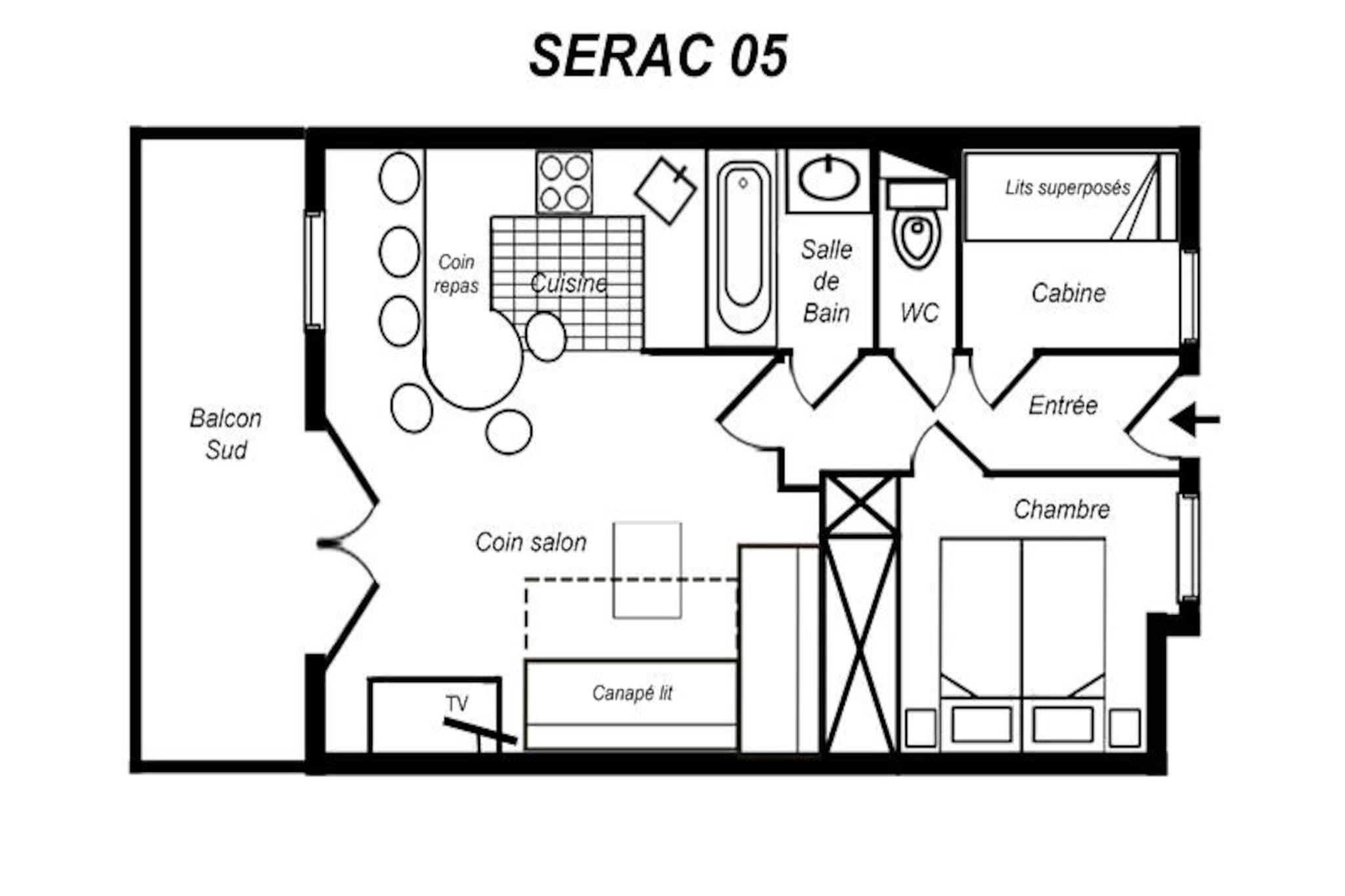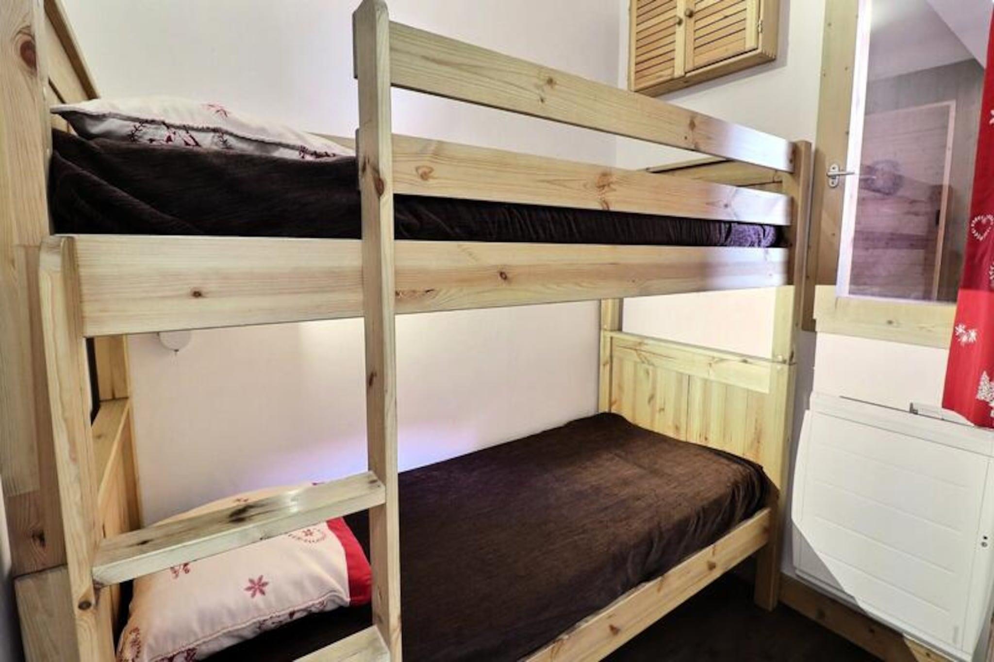 High above the serene valleys of Méribel, this charming apartment in the Sérac residence offers a cozy alpine escape with breathtaking views of Mont Vallon. Imagine waking up to the sun casting golden hues over the snow-covered peaks, stepping onto your south-facing balcony to soak in the crisp mountain air, and planning a day filled with adventure in the heart of the French Alps. This inviting retreat is perfect for those seeking tranquility paired with easy access to world-class skiing and outdoor activities. \n\nDesigned for up to six guests, the apartment features a warm and functional layout with a living room equipped with two comfortable sofas, one of which transforms into a double sofa bed. The bedroom offers flexible sleeping arrangements with a double bed that can be separated into singles, while the cozy cabin with bunk beds is ideal for children or additional guests. The open-plan kitchen is fully equipped with modern appliances, including a combination microwave oven, dishwasher, and induction hobs, ensuring you have everything needed to prepare hearty meals after a day on the slopes. A flat-screen TV, separate bathroom, and toilet complete the amenities, providing a comfortable and hassle-free stay. \n\nLocated just 100 meters from the nearest ski path, you can easily access the blue run or walk 300 meters to reach the Aigle red run, leading to the main ski lift departure point. The Châtelet shopping center is a mere five-minute walk away, offering convenient access to local shops, restaurants, and the bus stop for exploring the wider Méribel area. Whether you’re skiing down pristine slopes, hiking through lush summer trails, or simply relaxing amidst stunning alpine scenery, this residence places you at the heart of it all. \n\nChoose this charming apartment for your next mountain getaway and create unforgettable memories in one of the most picturesque settings in the French Alps.