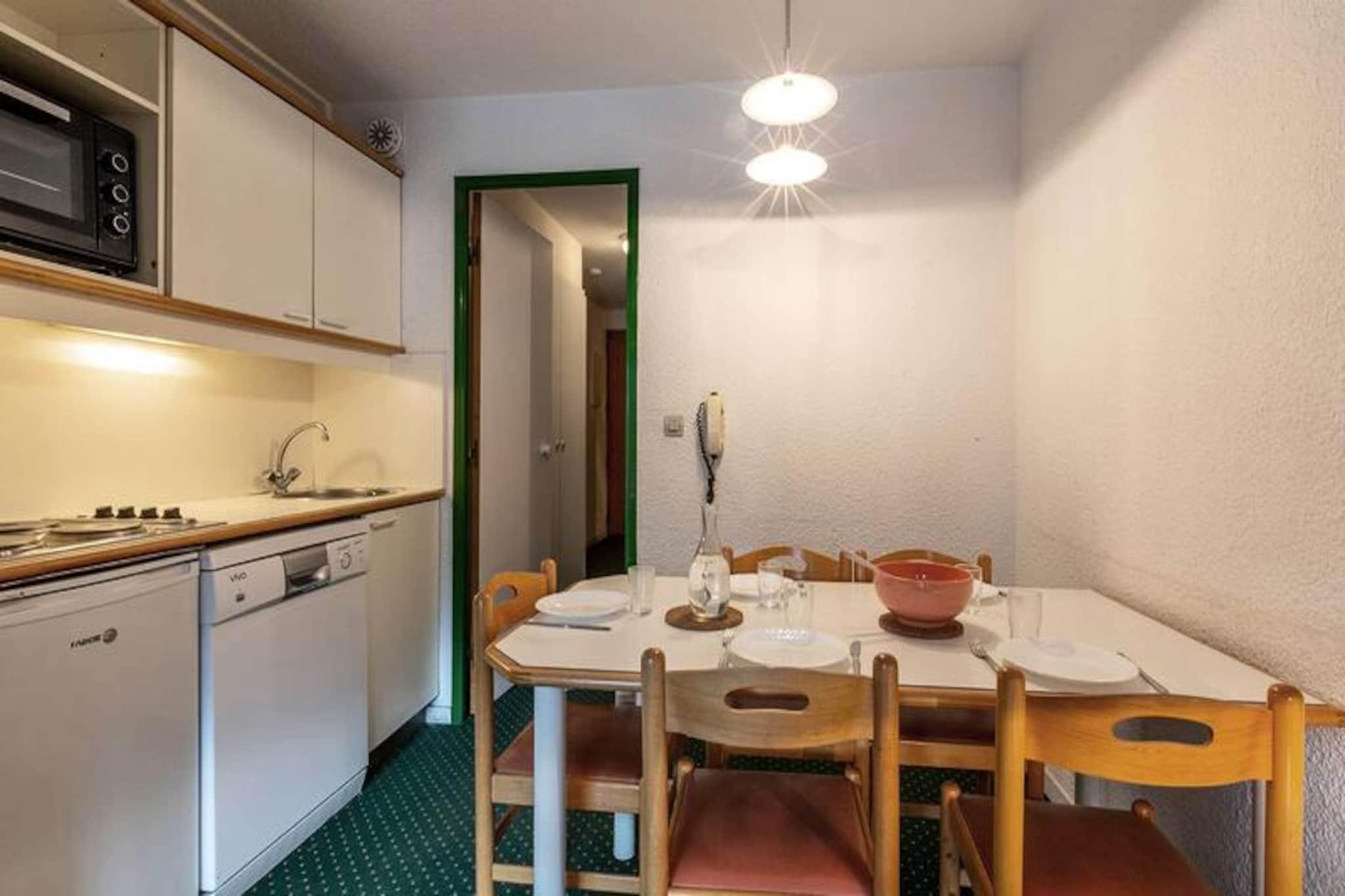 At the heart of the charming Méribel Mottaret, this delightful apartment offers a cozy retreat for your alpine adventures. With its south-facing balcony, you can soak in the breathtaking views of the surrounding peaks while enjoying the crisp mountain air. Perfectly located in the Le Plan du Lac residence, you’ll find yourself steps away from the slopes and local shops, ensuring convenience and ease throughout your stay. Whether you're here for skiing or summer hikes, this property provides the ideal base for exploring the stunning French Alps. \n\nInside, the apartment is thoughtfully designed to accommodate up to six guests. The living room features a sofa bed, a trundle bed, and another sofa bed, creating a versatile sleeping arrangement. The cabin bedroom includes cozy bunk beds, while the upstairs bedroom boasts a comfortable double bed and an en-suite bathroom. The kitchenette is fully equipped with modern appliances, including an electric stovetop, oven, dishwasher, refrigerator, coffee maker, kettle, and toaster, making meal preparation effortless. Additional amenities such as a ski locker, elevator, and optional services like linens and cleaning ensure a hassle-free experience. Please note that pets are not allowed, and the apartment is non-smoking. \n\nMéribel Mottaret is a vibrant residential area that combines alpine charm with modern convenience. From the nearby kindergarten to the accessible parking options, everything is designed to make your stay enjoyable. In winter, the slopes beckon for thrilling ski days, while summer transforms the region into a haven for hiking, biking, and exploring nature. The picturesque surroundings, coupled with the welcoming atmosphere of the village, make this apartment a perfect choice for families, couples, or groups seeking unforgettable moments in the Alps.