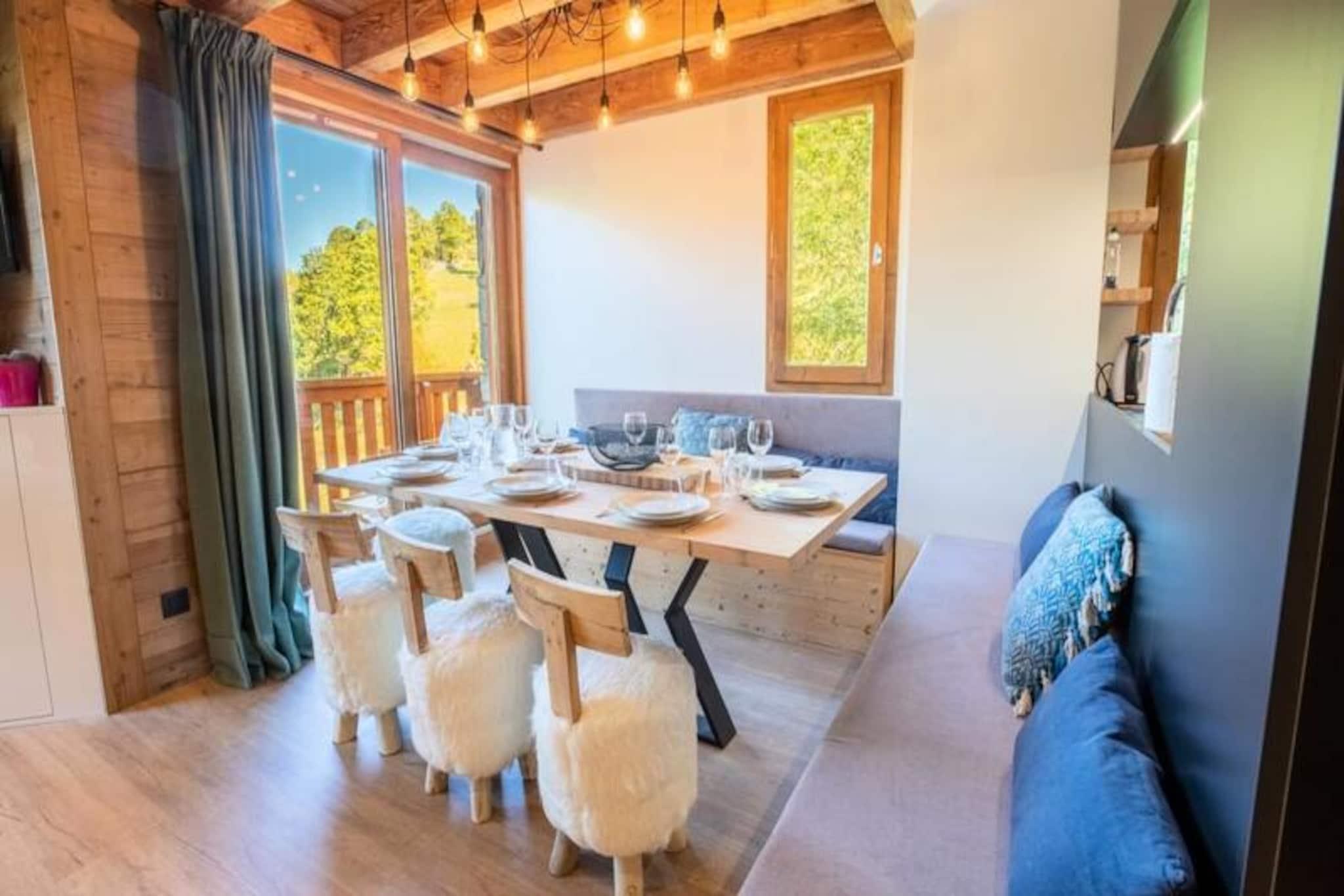 In the heart of Méribel’s charming Morel district, this beautifully renovated apartment offers a seamless blend of alpine tradition and modern comfort. Imagine waking up in a warm, sunlit space, stepping out onto your private balcony to take in the crisp mountain air, and knowing the slopes are just a few steps away. With ski-in/ski-out access to the Hulotte slope and the Morel chairlift only 20 meters from your door, this is the perfect retreat for avid skiers and mountain enthusiasts alike. Spanning two levels, the 75 m² apartment has been thoughtfully designed to accommodate up to ten guests. On the ground floor, you’ll find a welcoming entrance hall with boot dryers, a ski storage room, and a cozy living area complete with a sofa, TV, and dining table. The fully equipped kitchen includes everything you need to prepare hearty meals after a day on the slopes, from a refrigerator and oven to a coffee machine and toaster. Upstairs, three inviting bedrooms await: two double rooms and a bunk room that sleeps four. Additional conveniences include three modern bathrooms, a washer-dryer, and ample storage space for all your belongings. The Morel area is renowned for its ideal location, combining quick slope access with proximity to Méribel’s lively center, just a 5-10 minute walk away. Nearby, you’ll find a Sherpa supermarket, ski rental shops, and a selection of restaurants such as Alti 16 and Tsaretta Spice. Free shuttle services make exploring the wider resort effortless, ensuring you can fully enjoy everything the 3 Valleys have to offer. Whether you’re here to carve through fresh powder, savor gourmet alpine cuisine, or simply relax in the serene mountain atmosphere, this apartment provides the perfect base for an unforgettable holiday in Méribel.